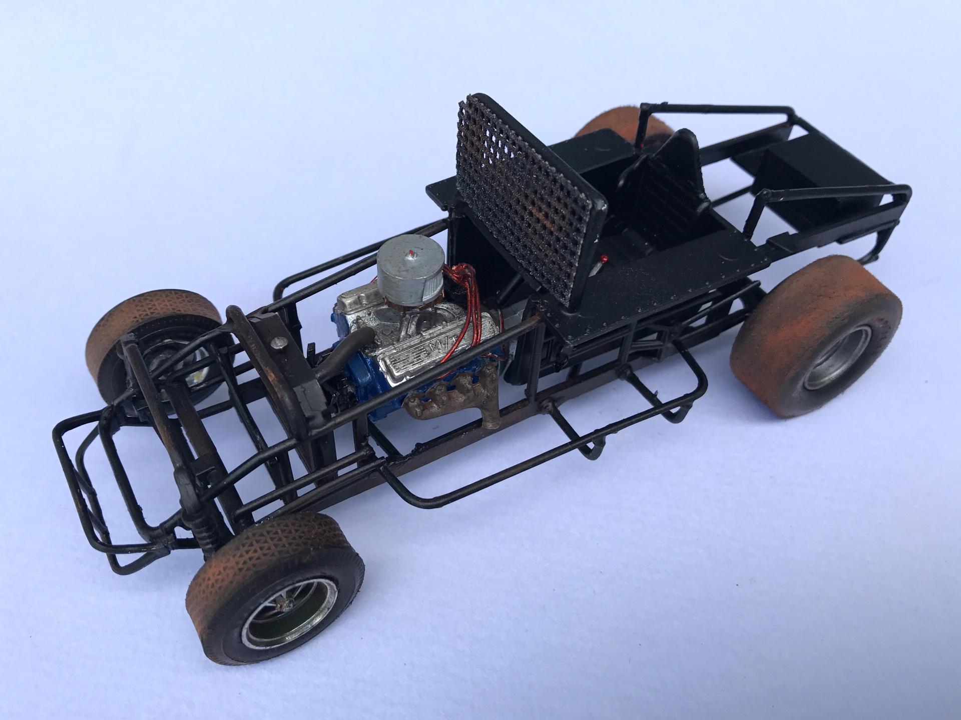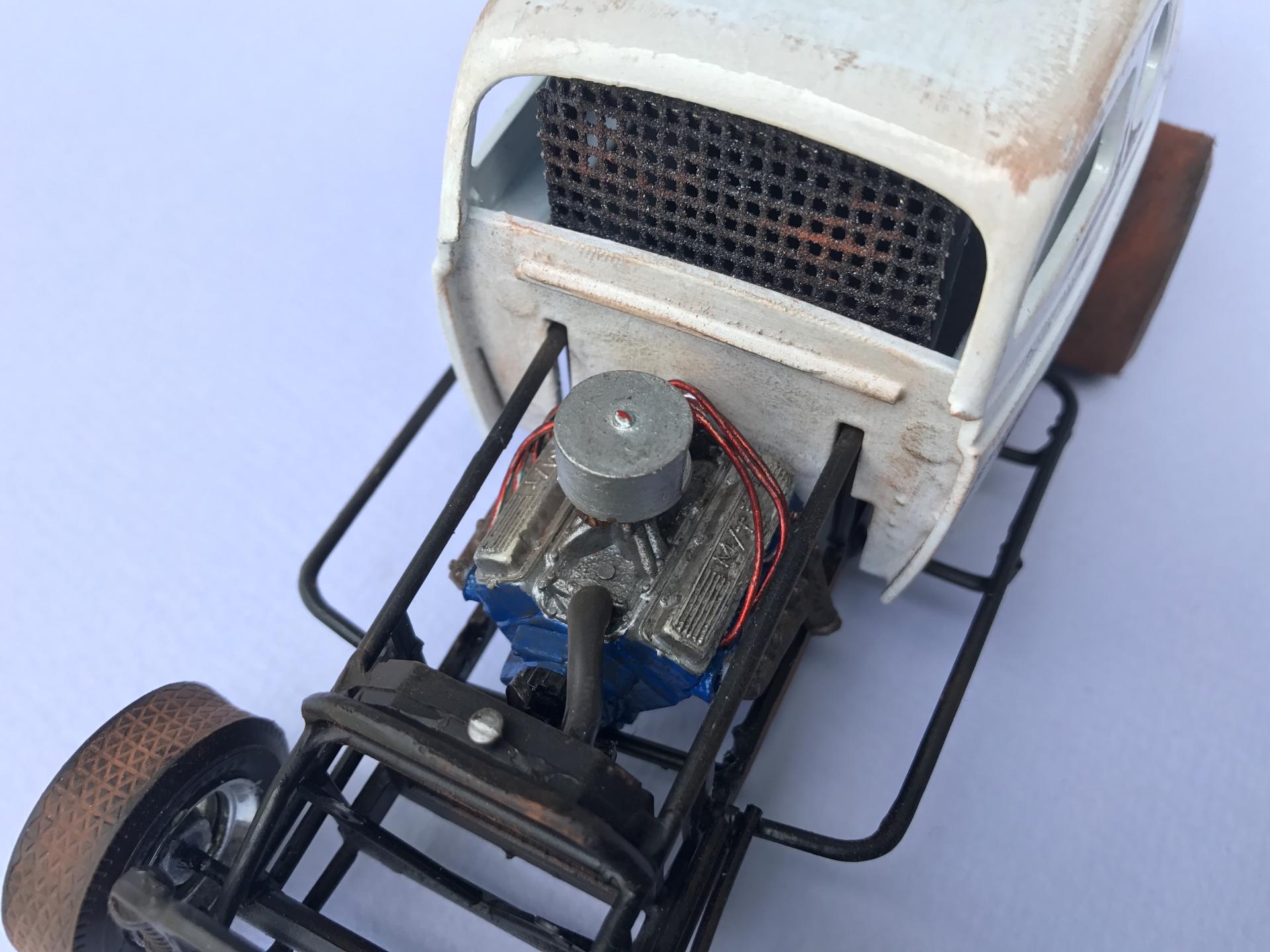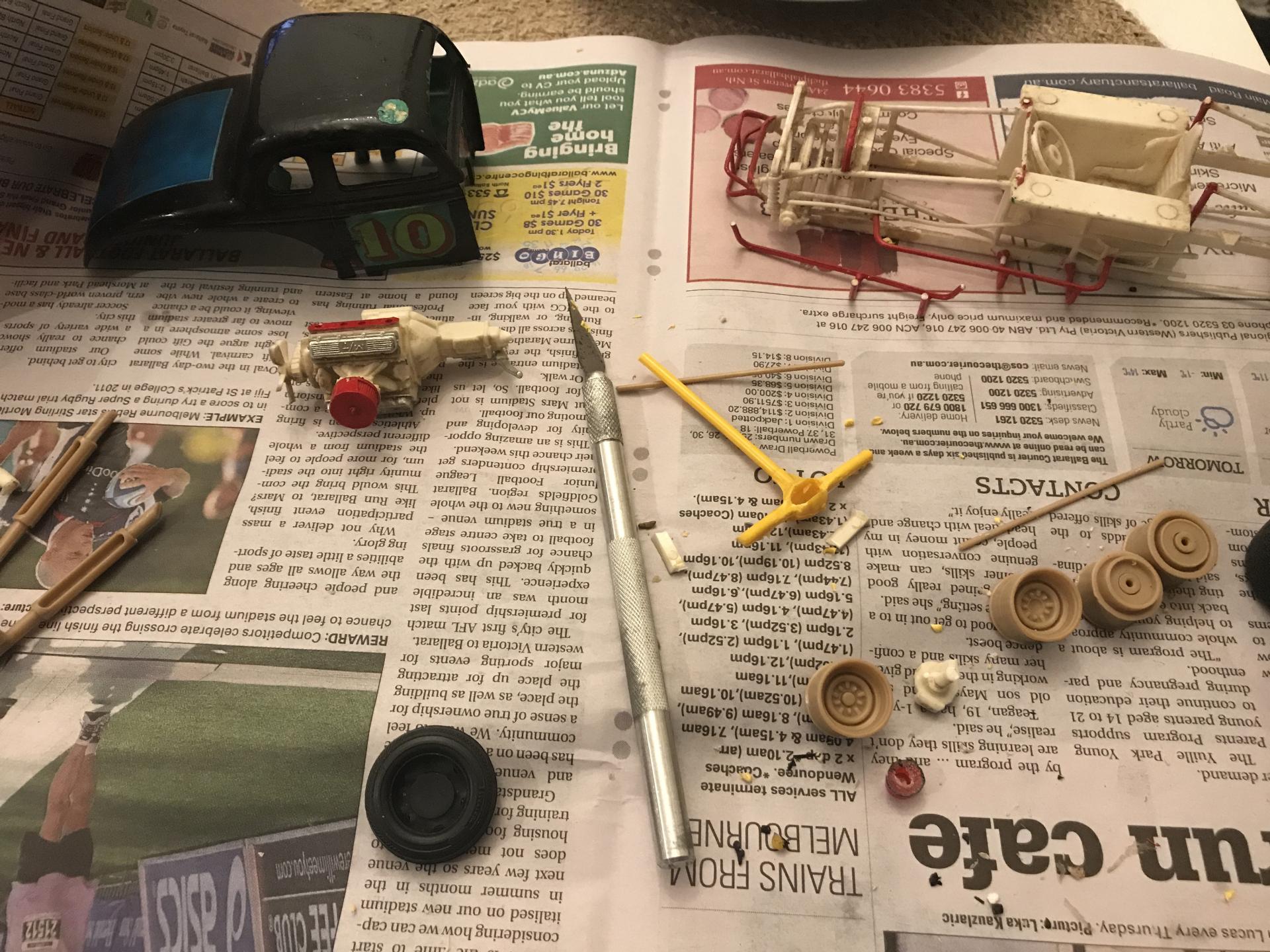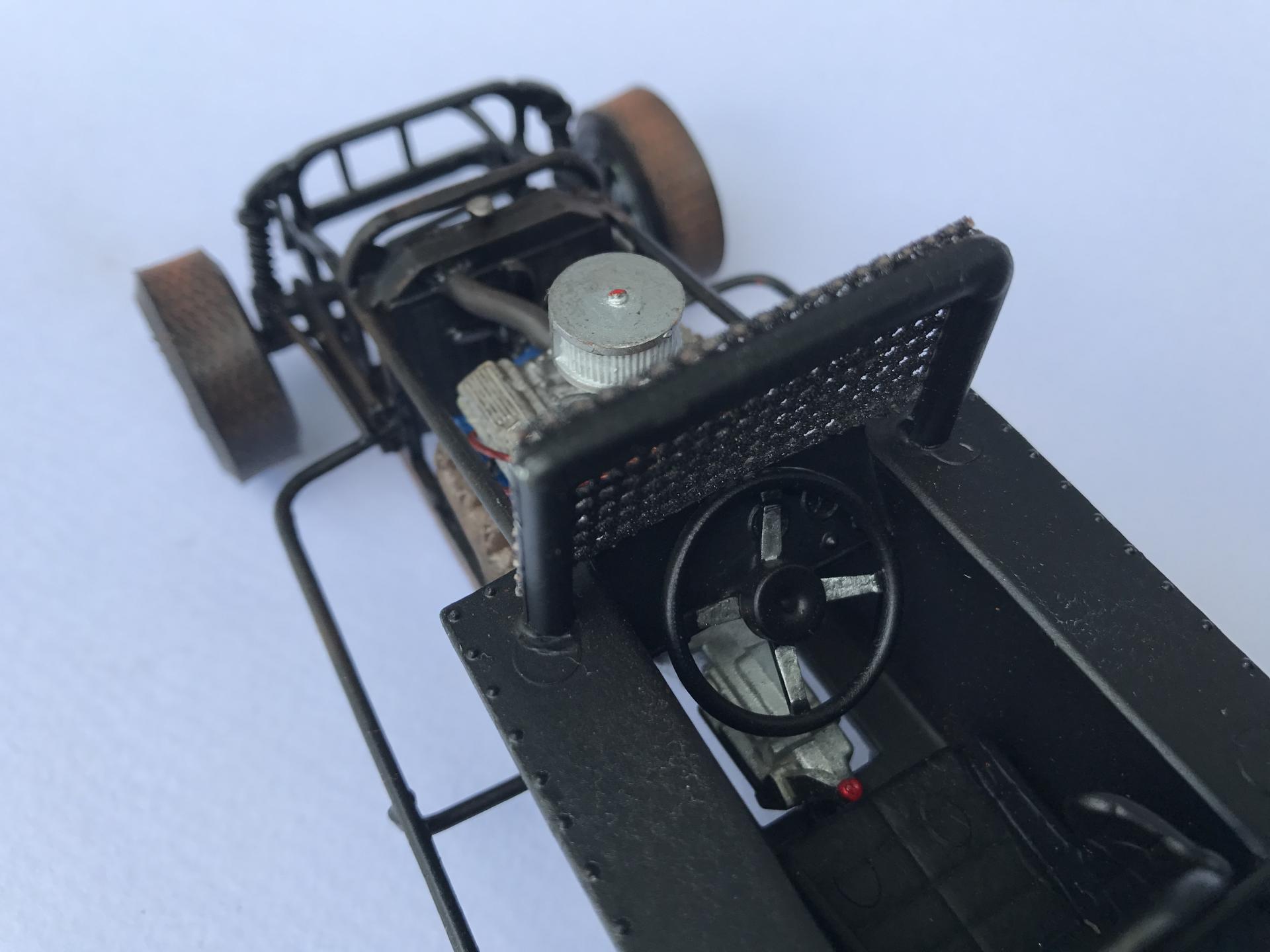 Purchased as a semi-complete model for $10 AUS at a market in a ziplock bag marked 'early Chevy'. Got it home and with a little research, found it was an AMT 36 Plymouth Early Modified. The previous modeller had used superglue on most parts, however because it was a race car I wasn't to stressed about a polished rebuild. What started out as a 'quick' rebuild ending up including: custom decals, weathering, engine wiring, scratch built front roll cage and grill and custom exhaust manifold (exhaust was missing from kit). A really fun kit to re-build. Constructive criticism welcome and encouraged.