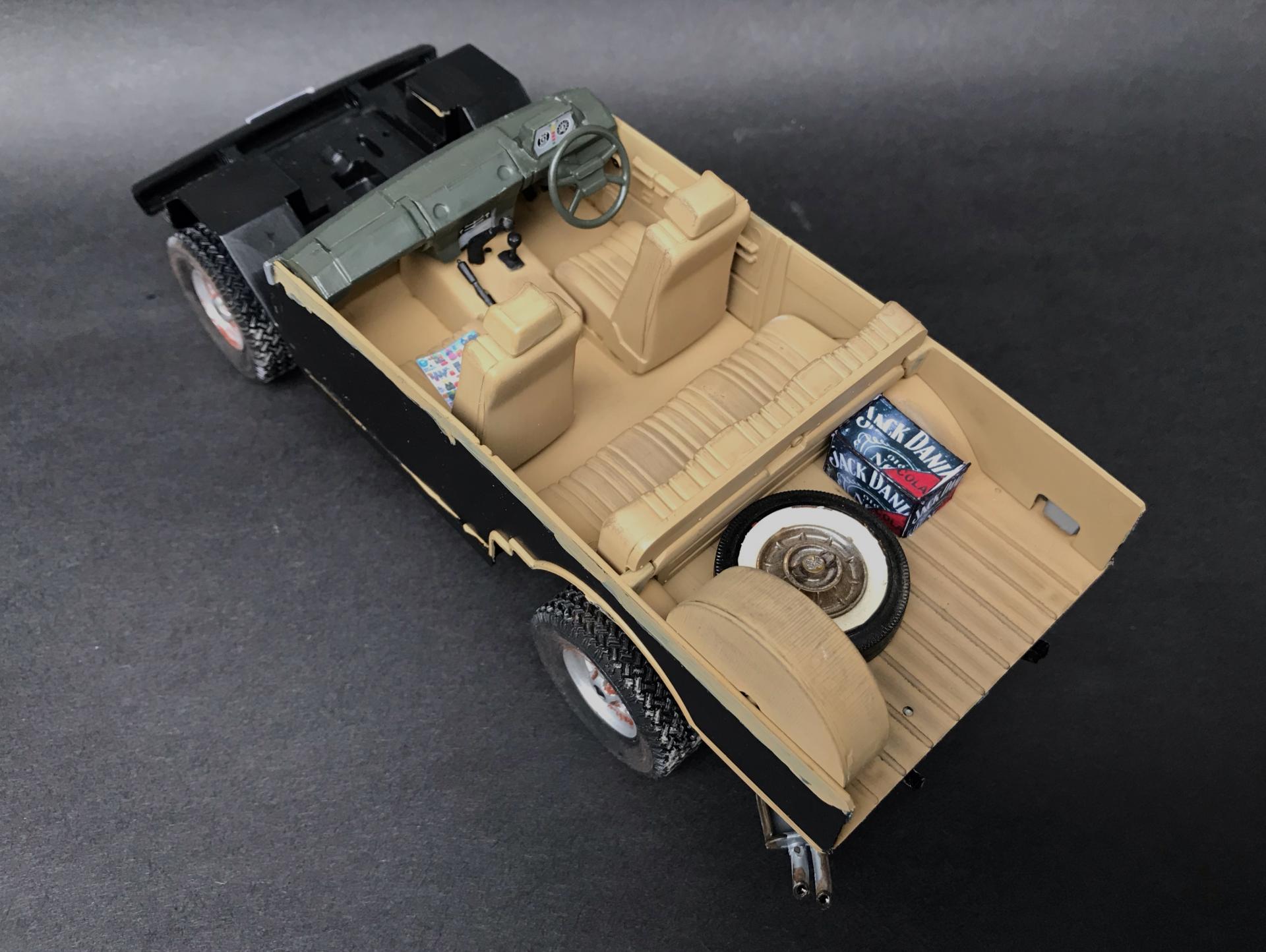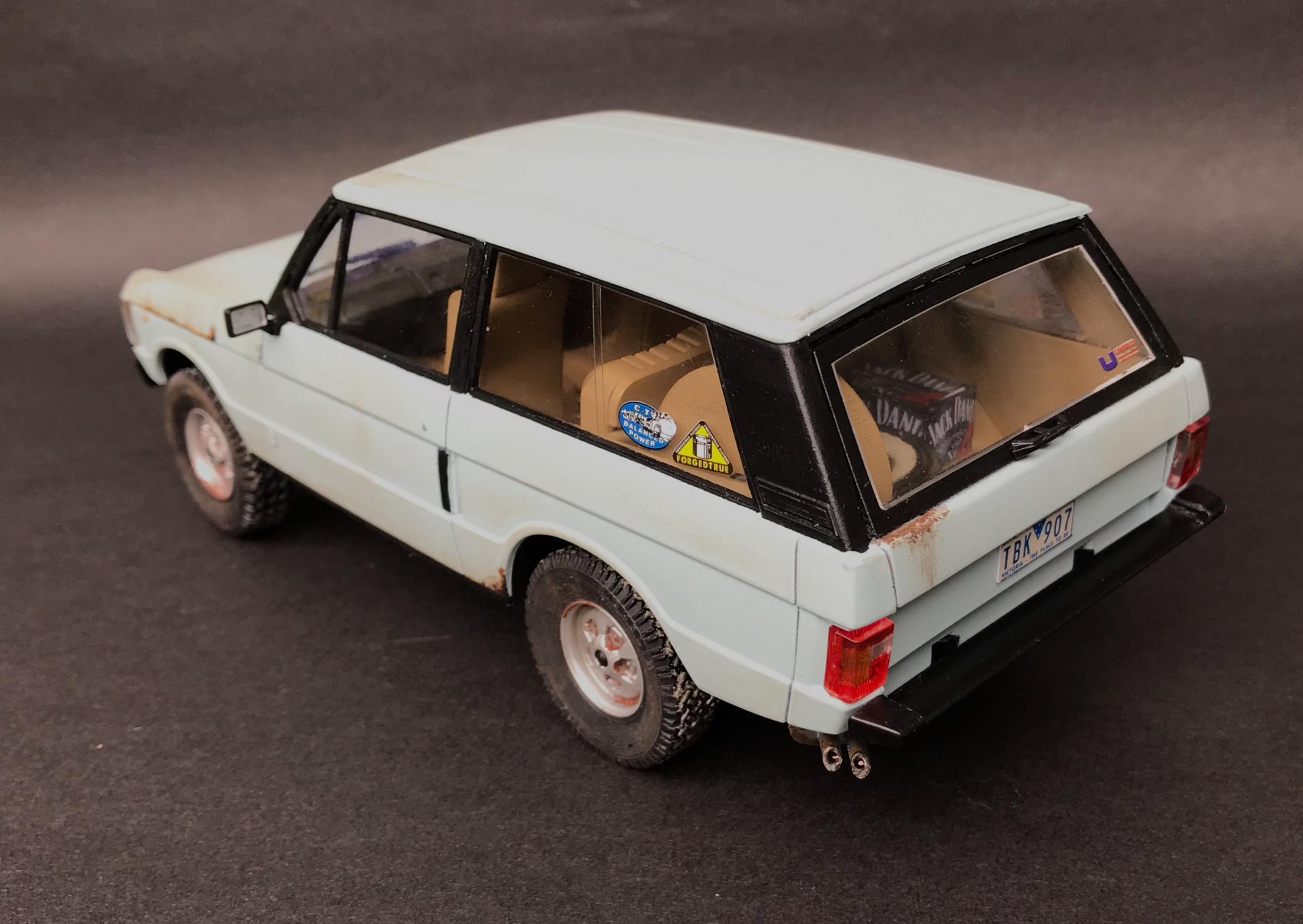 Picked up this Italeri Range Rover kit from a car swap meet. It was amongst tables of plane kits at a cost of just $8 AUS!. The theme for the car is a weathered hauler, something that would tow a car to race day (I have a scratch built trailer on the way!). I scratch built a slab of Jack Daniels, Australian number plates and a Supercheap Auto catalogue in the front. The weathering and detail painting took a lot longer than expected but I’m happy with the results. Feel free to comment.
