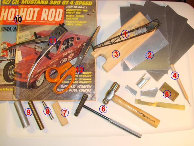 Here's a photo of the tools I used to form the body. 1. Dragster chassis. 2. Aluminum sheet. I used .010" aluminum flashing. Mine came in 5"X7" sheets. Any thin, somewhat rigid sheet will work (sheet must not be tooling aluminum or disposable baking pans as these are not rigid enough). 3. Wood buck for shaping cowl. Details below. 4. Ball-ended burnisher/scriber. 5. Shaping tools. Details below. 6. Ball pein hammers. Shown are an X-acto changeable head hammer and a small hammer from the craft store. I found the latter to be most useful. 7 & 9. Various shapes and sizes of metal and wood pieces for shaping panels. 8. 3/16" pin punch. 10. March and April, 1967 issues of Hot Rod Magazine or a copy of the article entitled Shape Up which is available as a .pdf file HERE. If you prefer, you can access the individual pages HERE. 11. A sheet metal nibbler is very helpful in cutting out the cowl opening, but the job can be accomplished using other methods. 12. Scissors or shears. 13. Since this photo was taken, I have also added a length of round steel rod 1/2"X10", based on Riceman's recommendation, to use as a slaphammer. 14. As always, you will need general modeling tools including measuring devices and a scriber. -