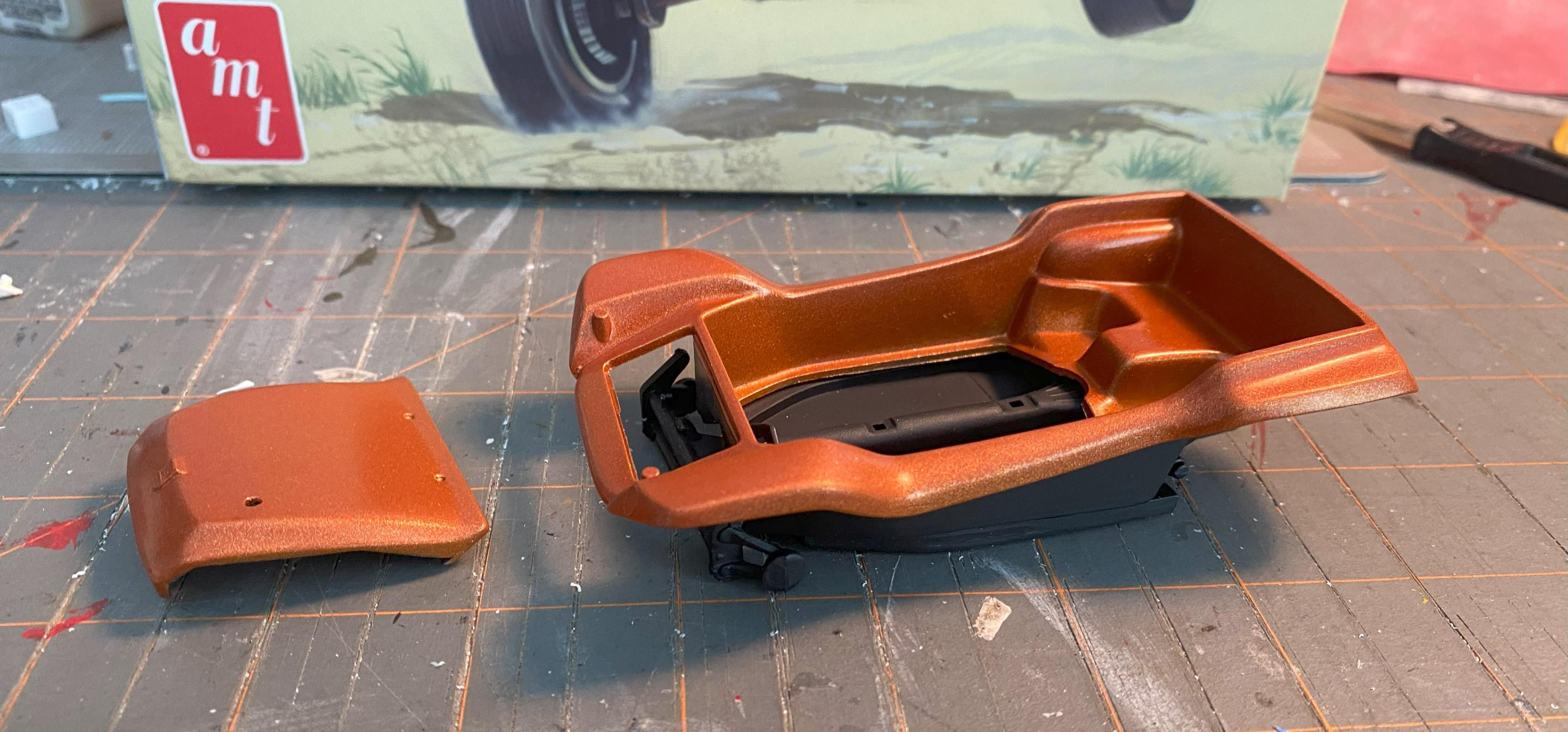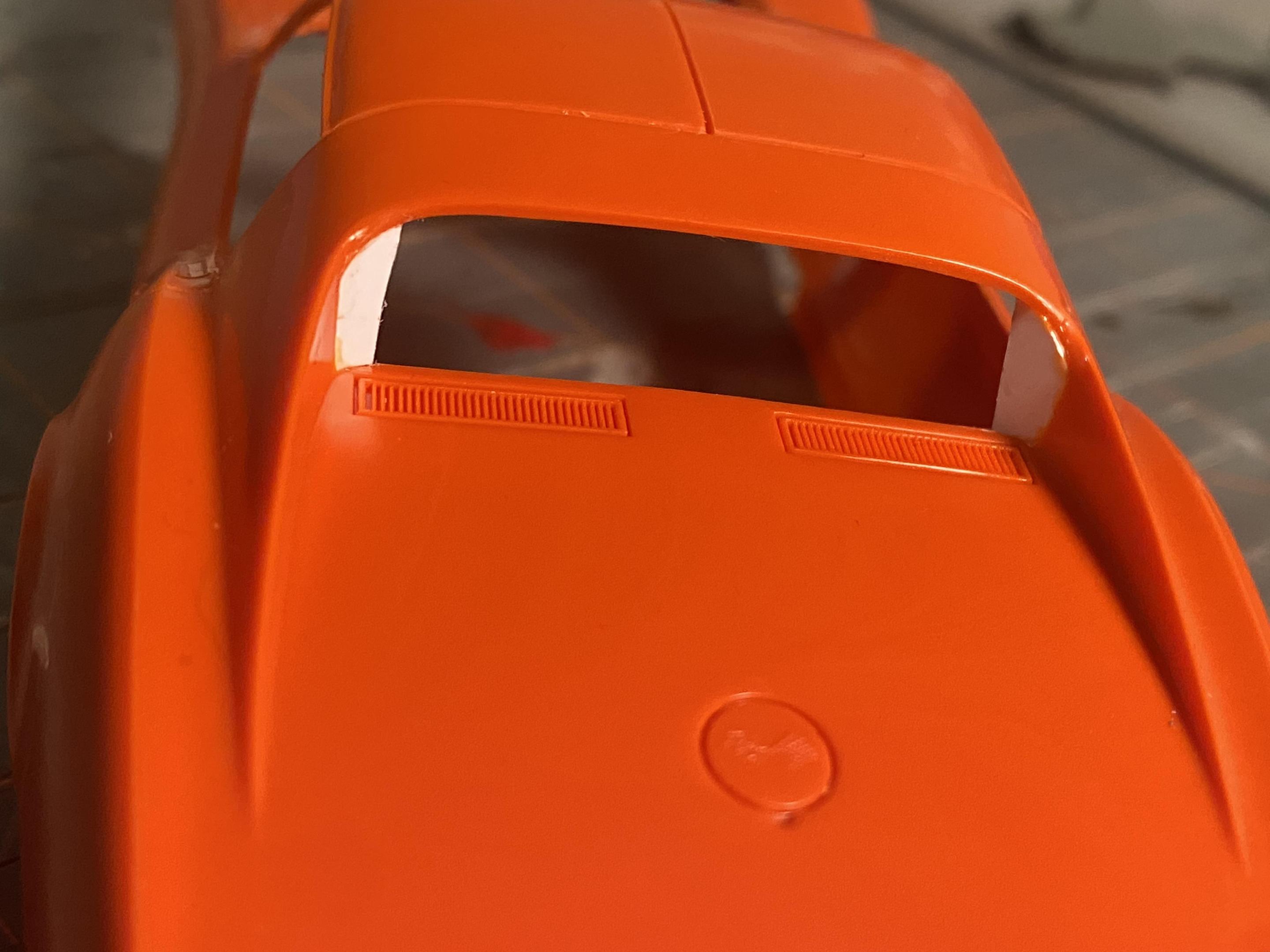 Had to clean up the hobby desk over the holiday as we had guests (it's in our guestroom). So before I dug back into the Cobra racing team set, I decided to have a little fun and practice some techniques with one of my $13 scores from Ollie's. I opted to use the curbside parts for this one to keep it simple. I scribed the doors and trunklid, and added a black wash before I primed, tried the embossing powder for carpet, and foiled some of the emblems/scripts before applying Testors Inca Gold lacquer. The interior is Tamiya dark yellow, with gold embossing powder. I could have used another coat of paint, but I like the overall result of the foil, and learning things for the next build.
