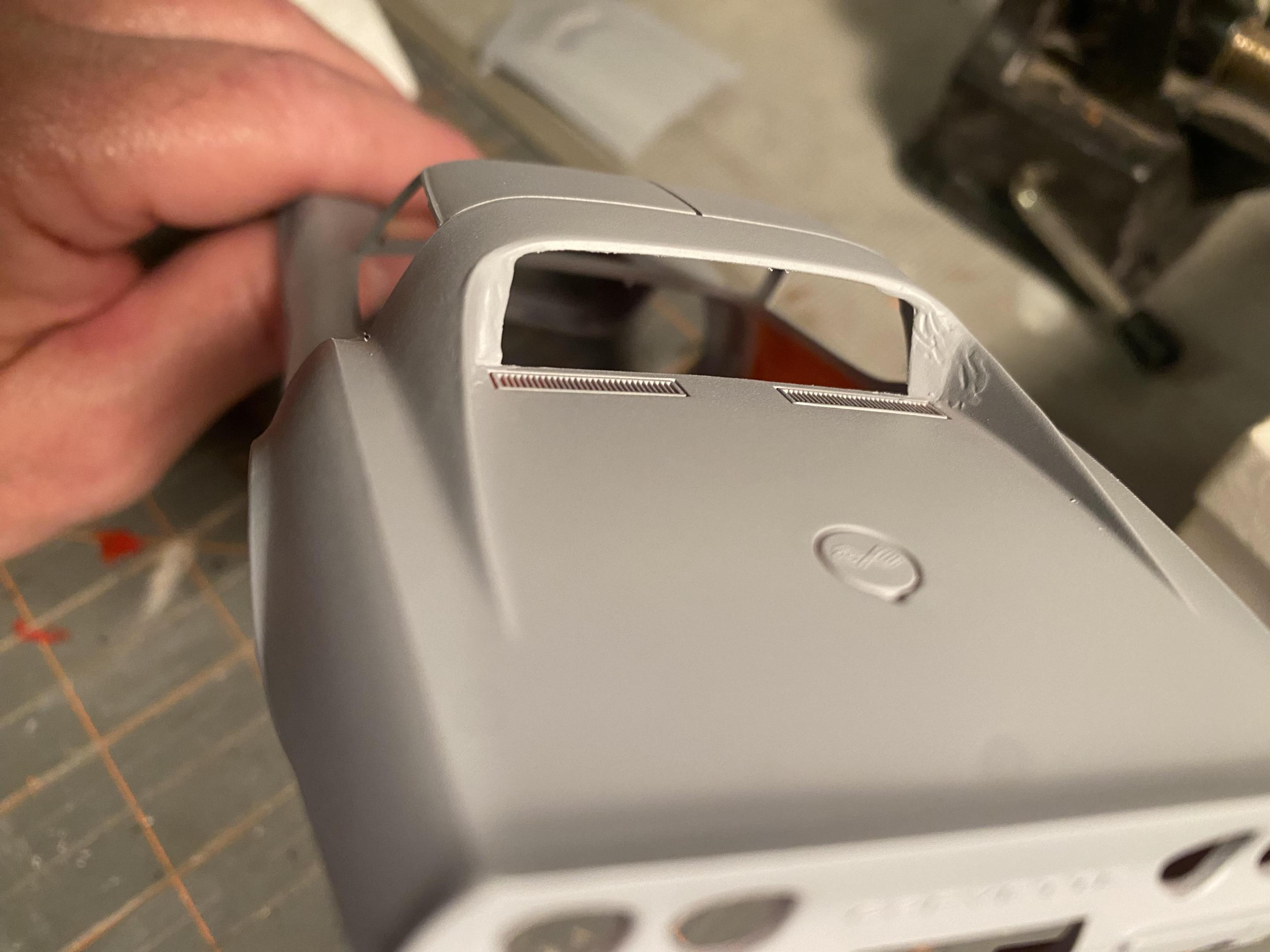 Back on this one for a bit. I roughed in the shape of the window opening with sheet styrene, and a little putty. I need to add some putty and smooth it out.