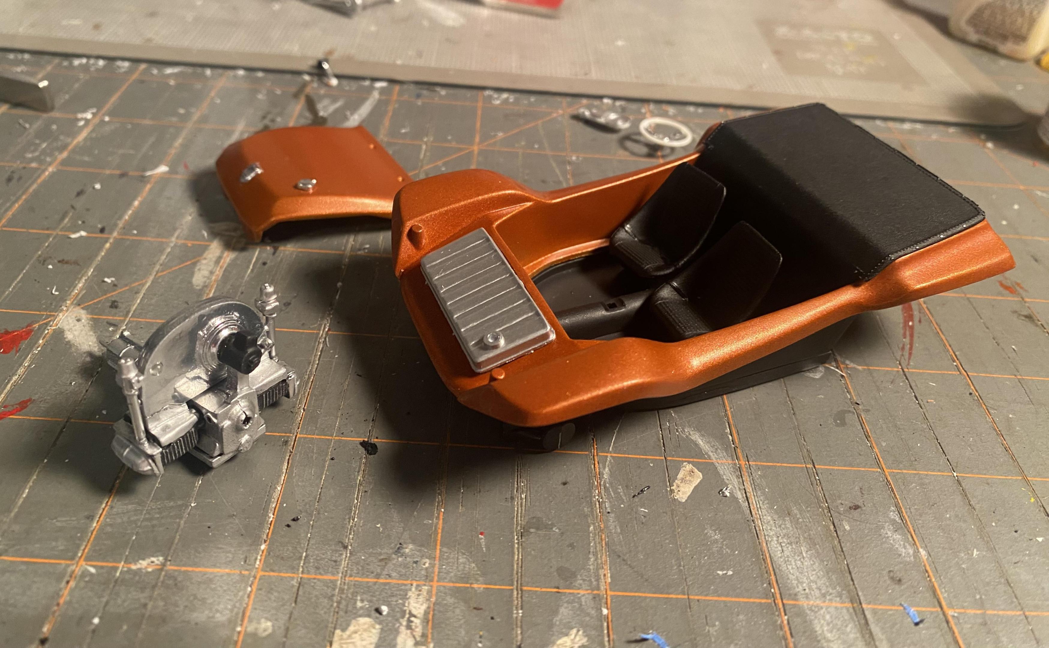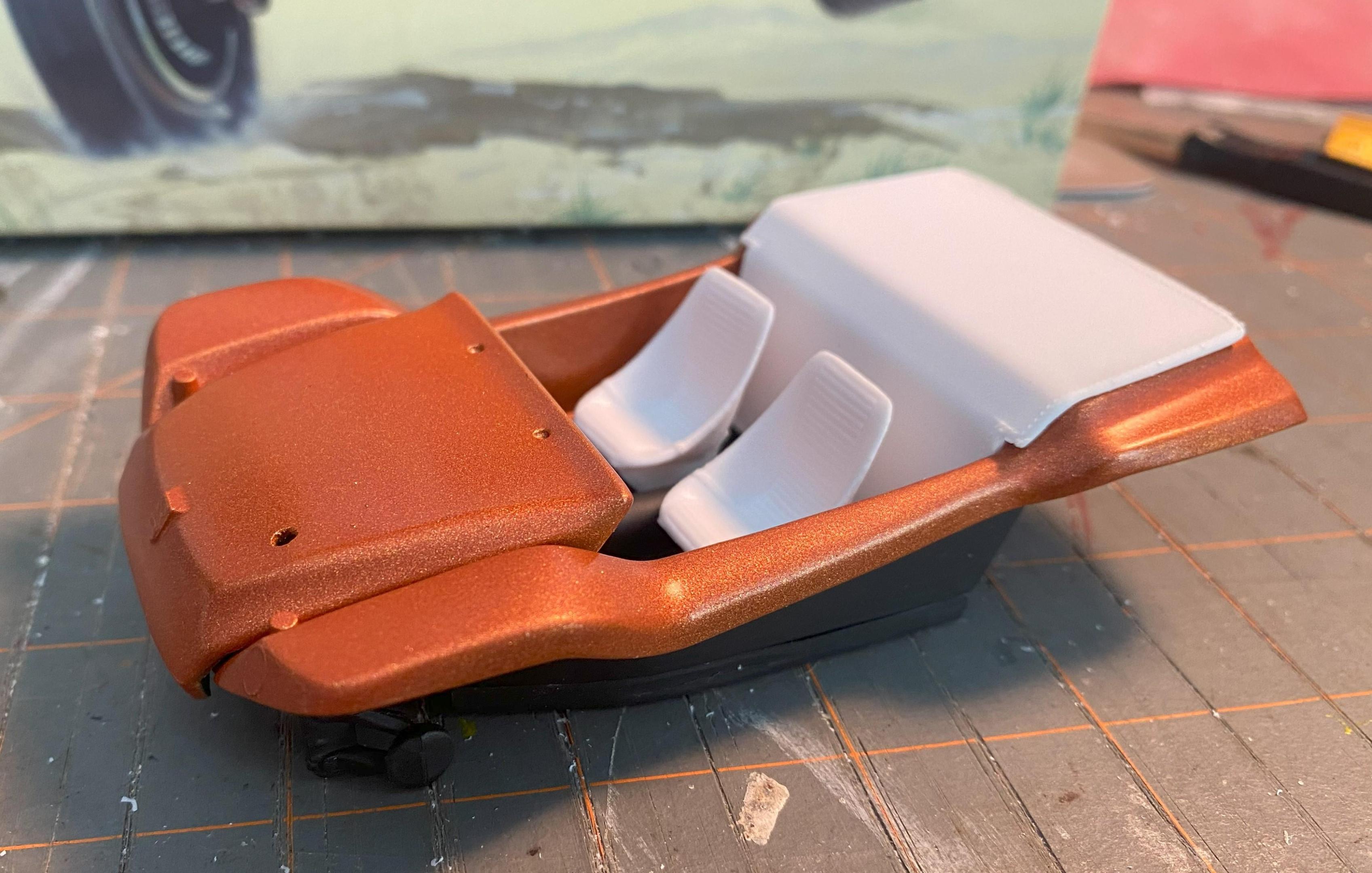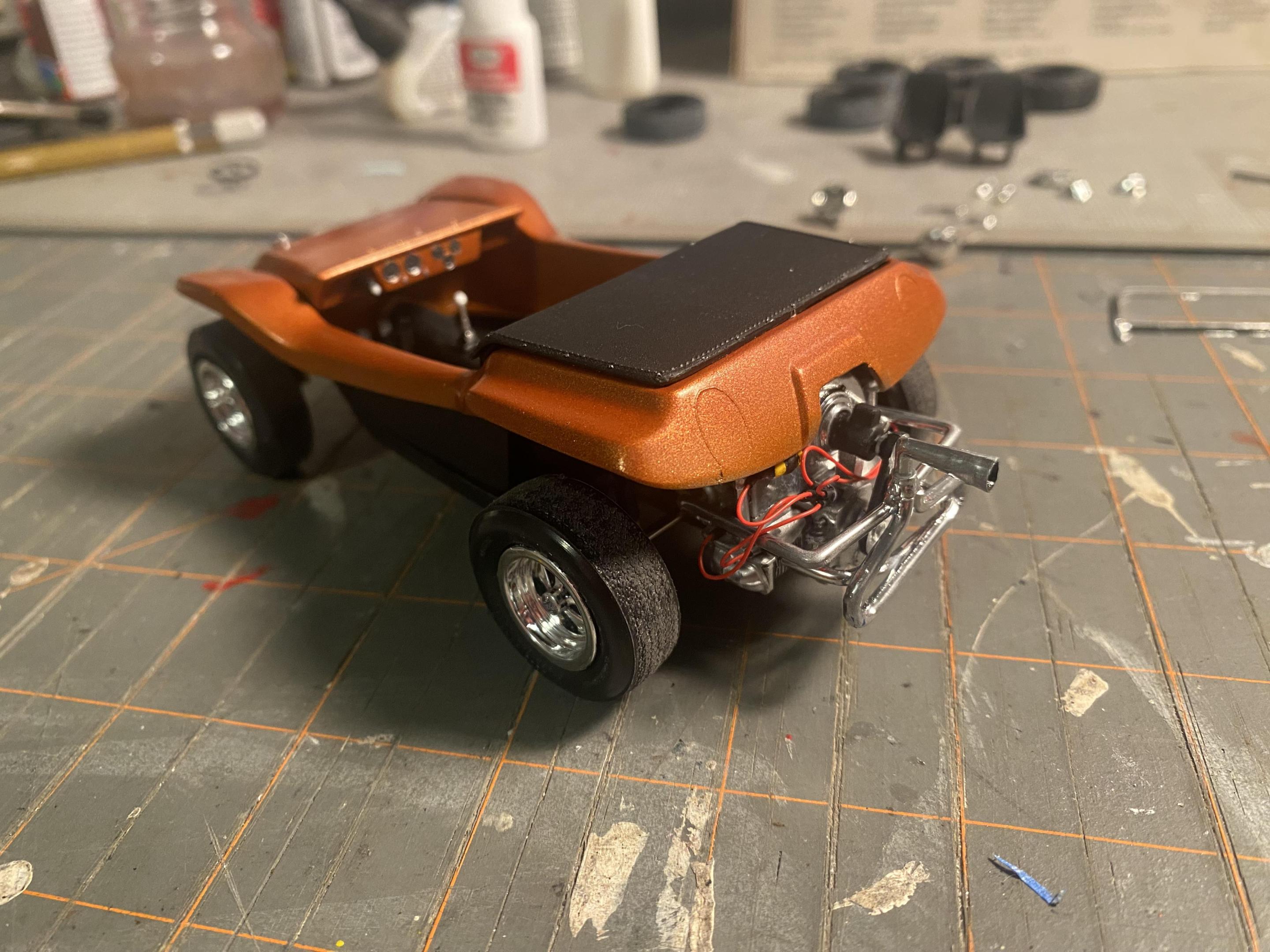I got this kit cheap at Ollie's, and decided I'd try to finish it over the weekend. I started Friday night, and might not get done tonight, but it's coming along. Keeping it simple, sort of inspired by Steve McQueen's manx from the Thomas Crown Affair. Paint is Testor's Fiery Orange Lacquer.