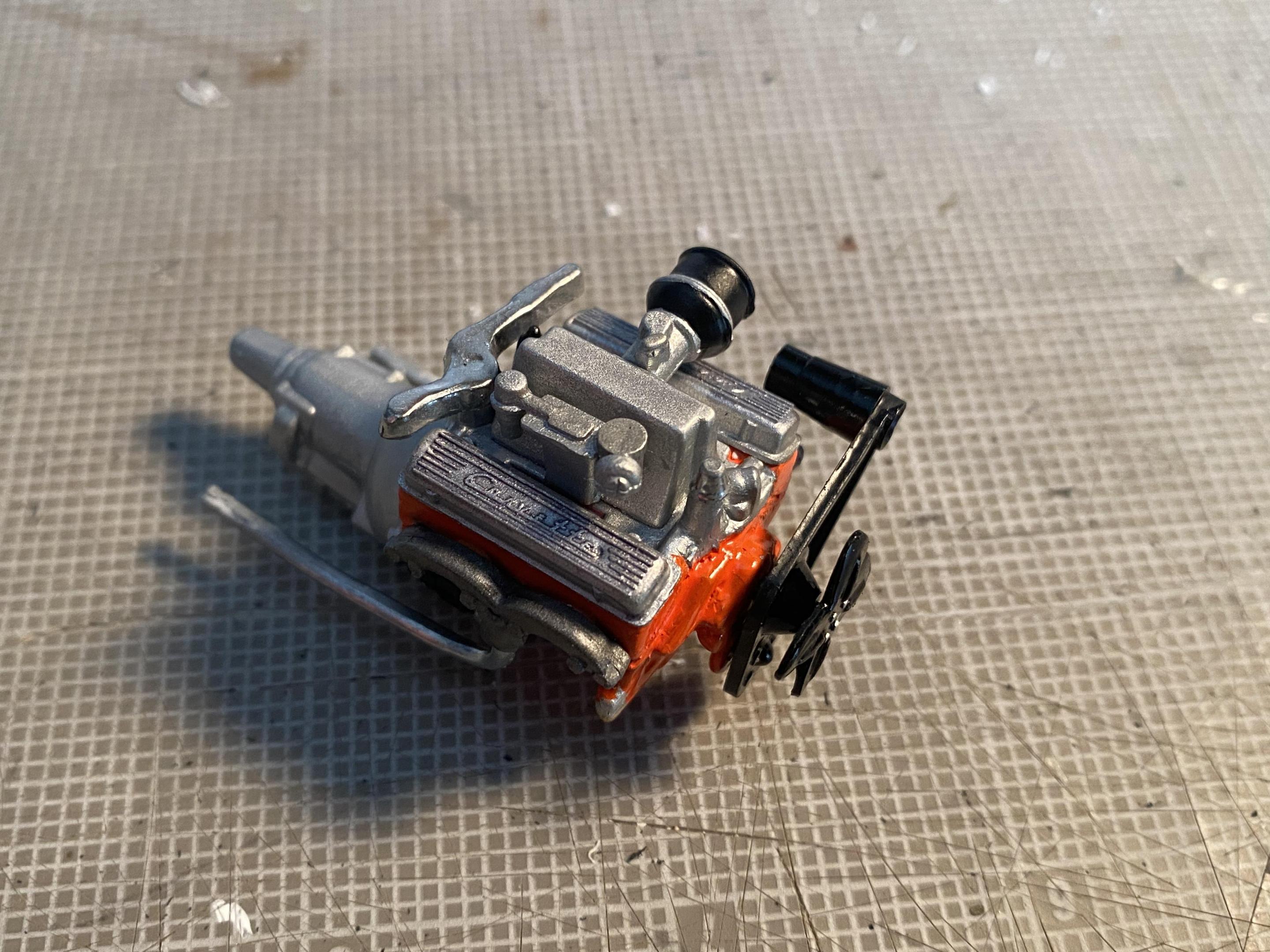 Engine almost ready to install. I stripped the chrome from the FI unit and the valve covers, and painted both aluminum. I stripped the chrome from the ignition shielding as well but painted it with the Gundam chrome as it better represents the stainless. Best thing about building corvettes is you can get away without wiring the engine lol.