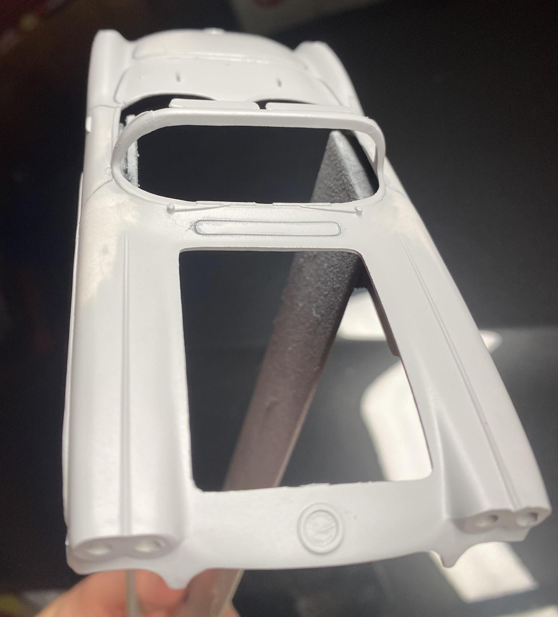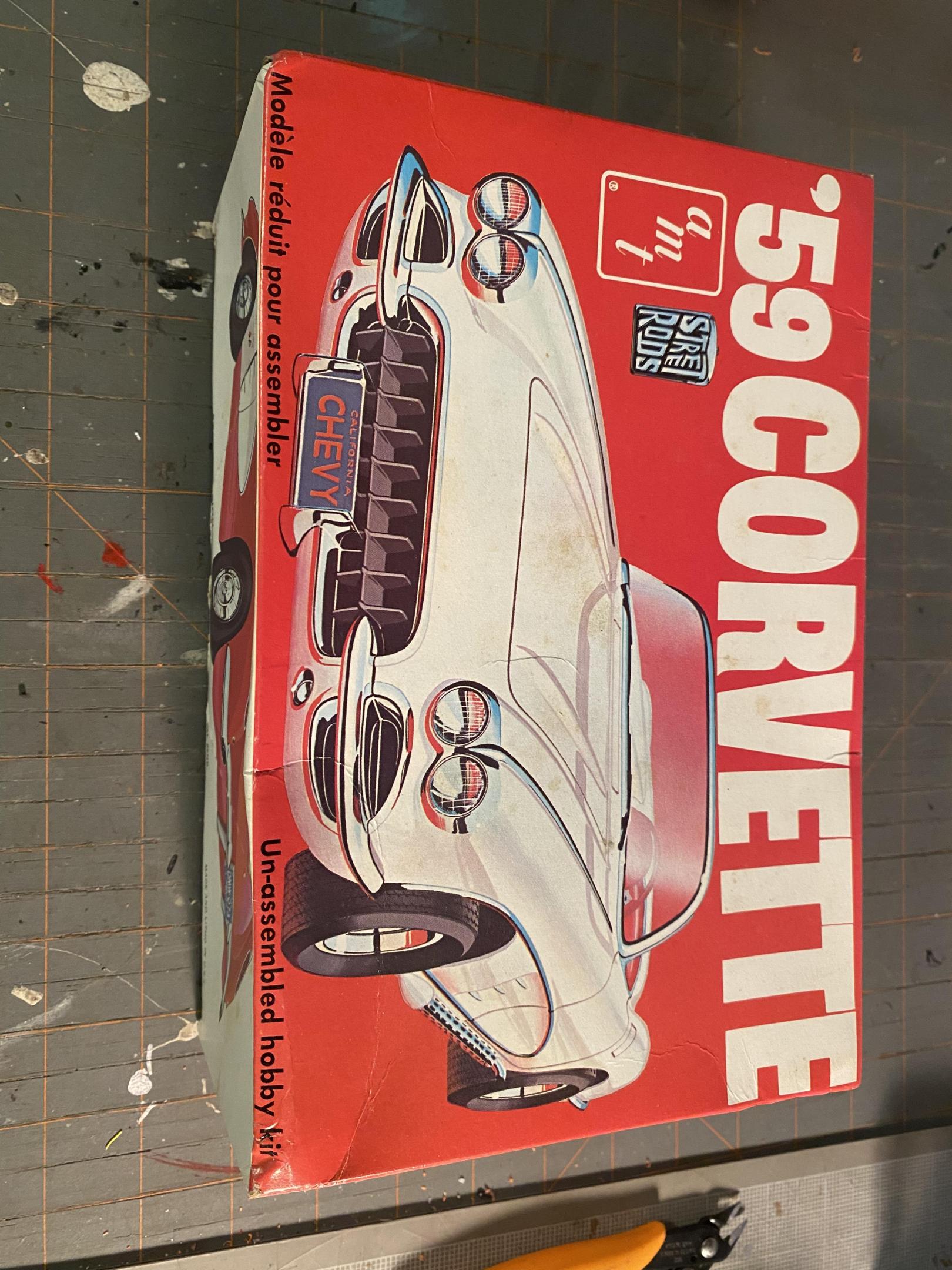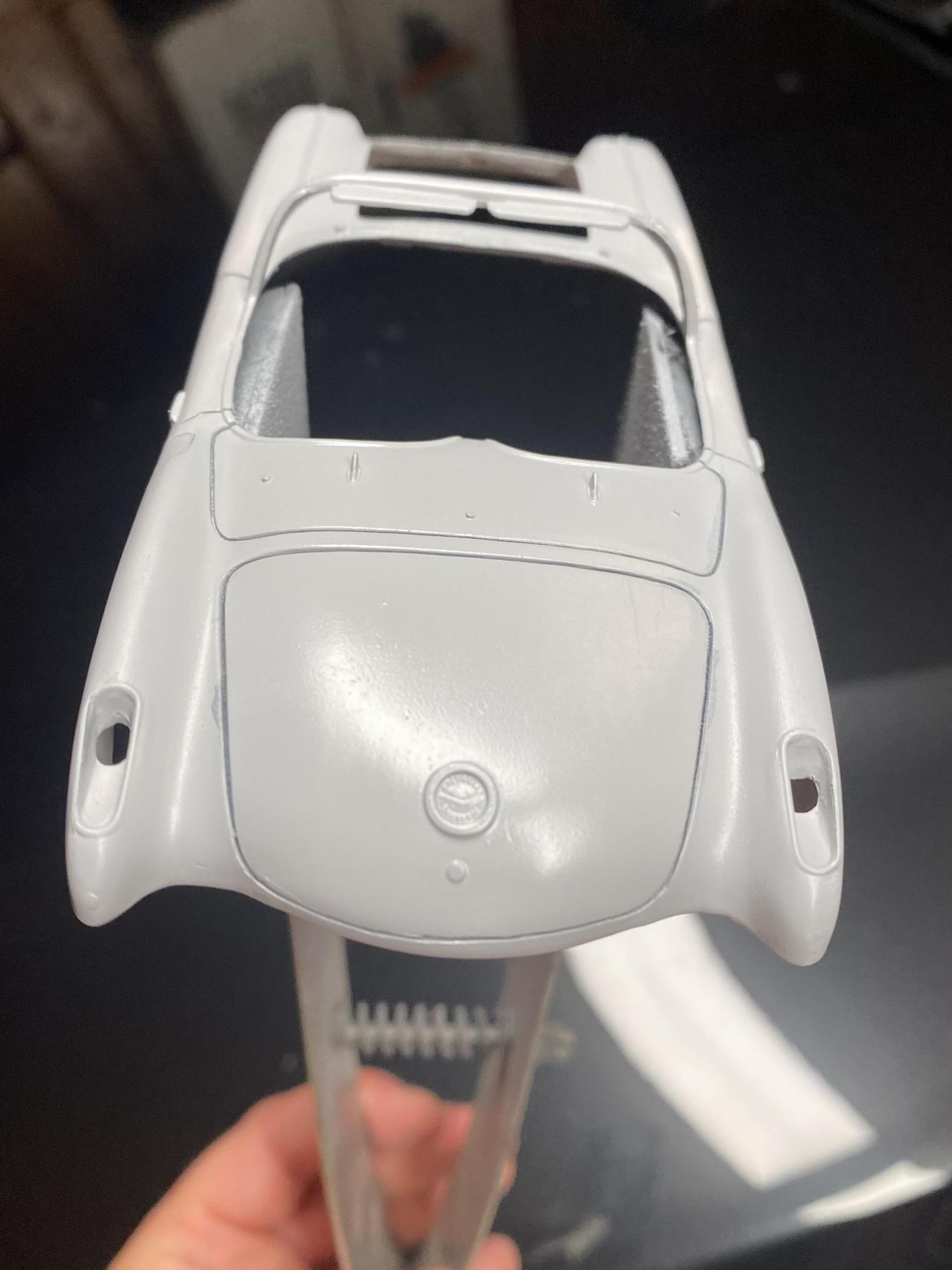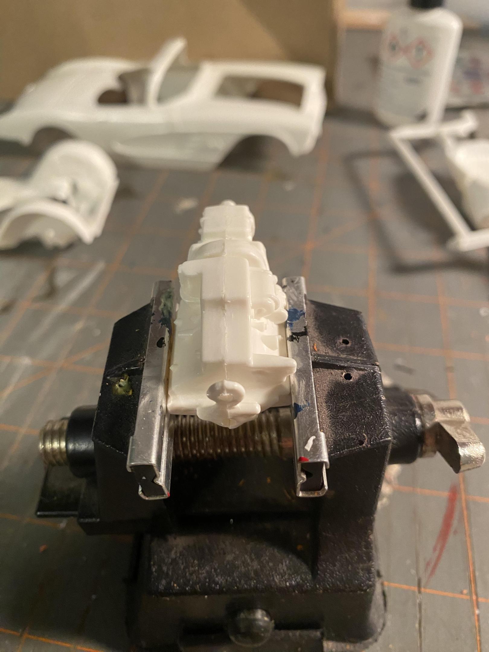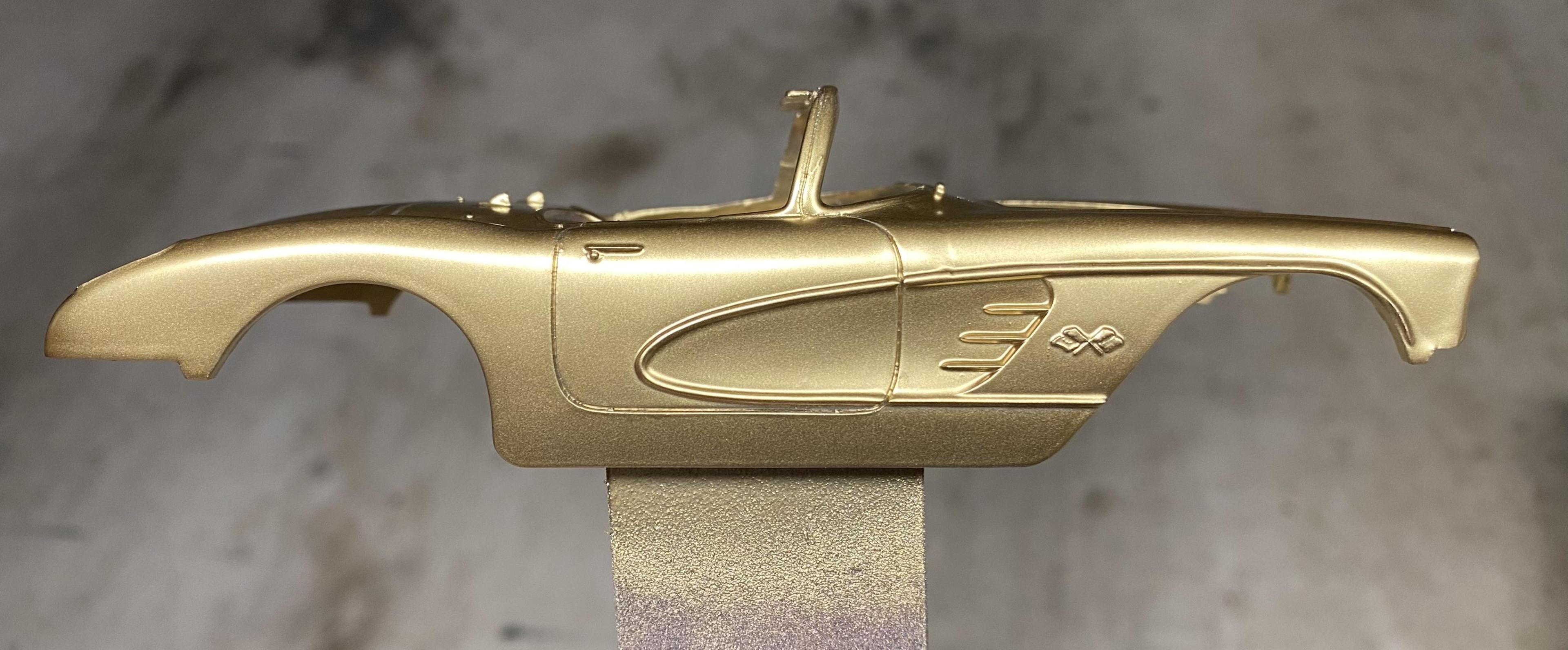 I bought this kit on a whim from an ebay seller. I was purchasing a couple others and this one was still sealed and cheap. I decided it would be a fun box-stock build to start the year. Low parts count, not much detail, etc. Engine assembly was my first red flag. I’ve seen the cylinder heads molded with the intake before but never with part of the head molded to the block. I’ve puttied the seam a couple times, more photos later. the body proportions seem off to me but I don’t have the Revell ‘59 to compare it to. It seems slabsided. I knocked down mold seams and scribe panel lines. I had to work on the trunk lid because the panel line along the bottom of lid was nonexistent. It’s a little crooked but I’m tired of fighting it first color coats on the body, and I need to decide if I’m going to use wheels from the kit or swap something else instead. i had to touch up a few places where the scriber got away from me, so it will get another coat of gold before I mask off the coves and lay down some more paint.