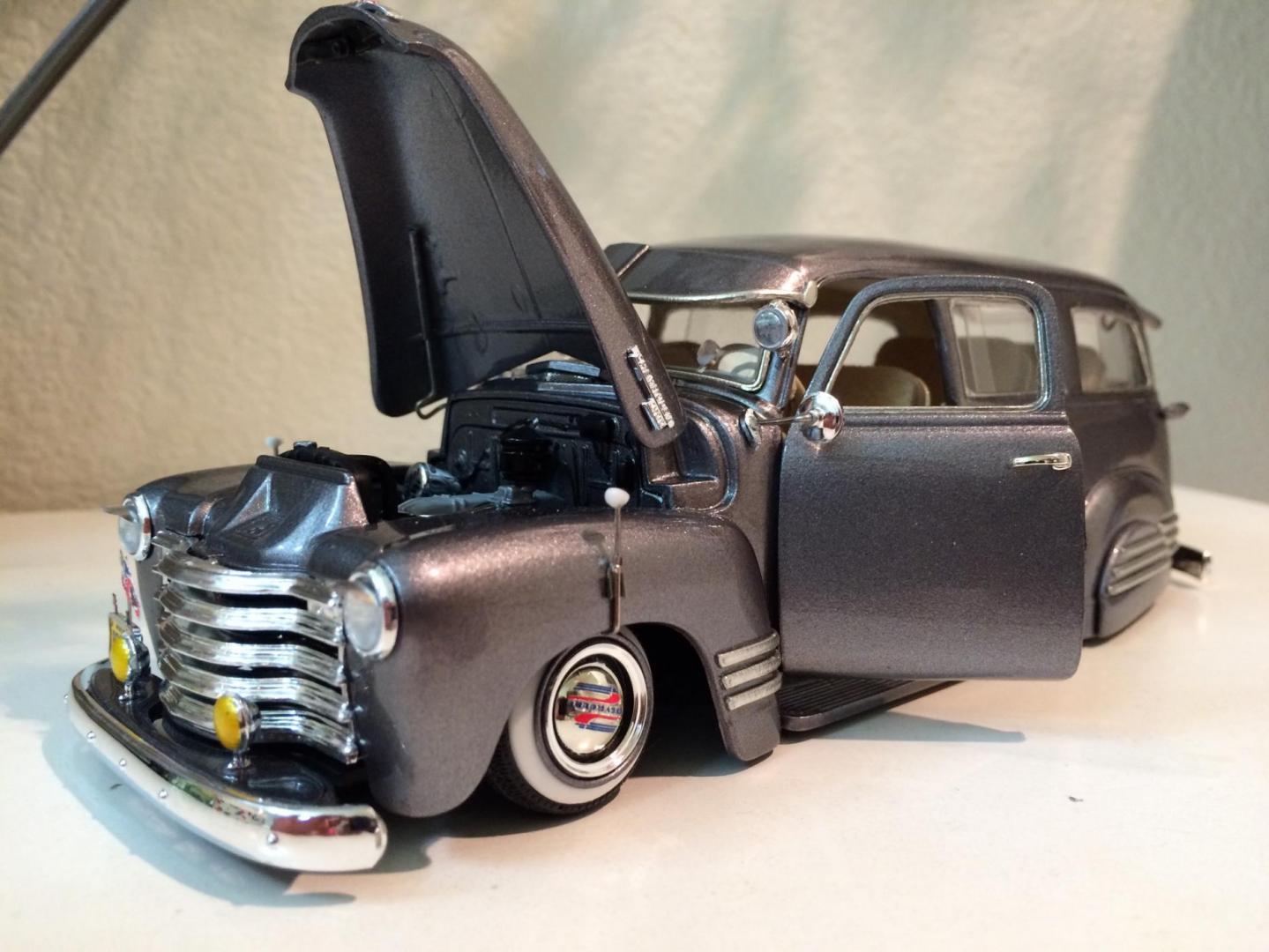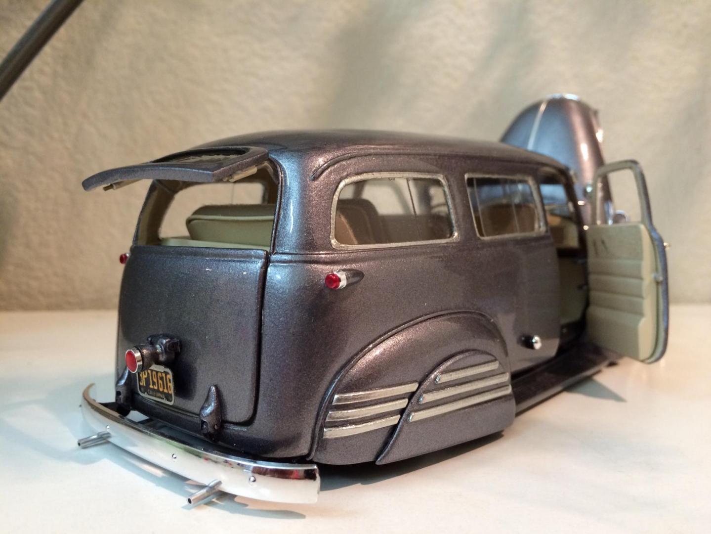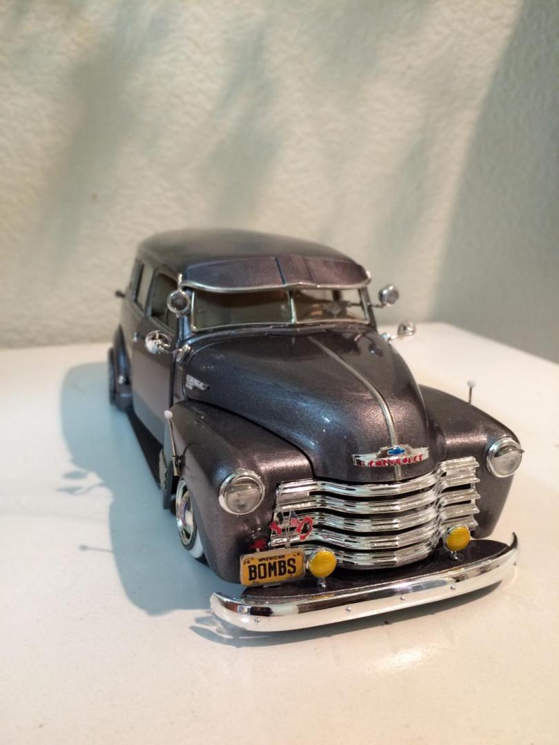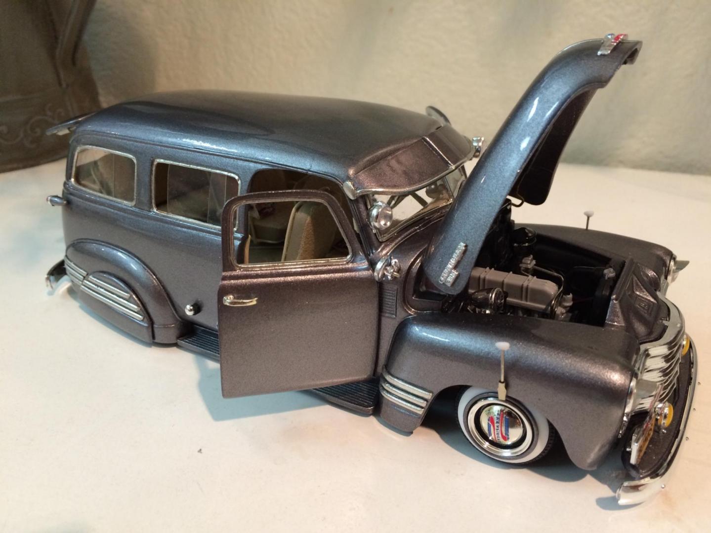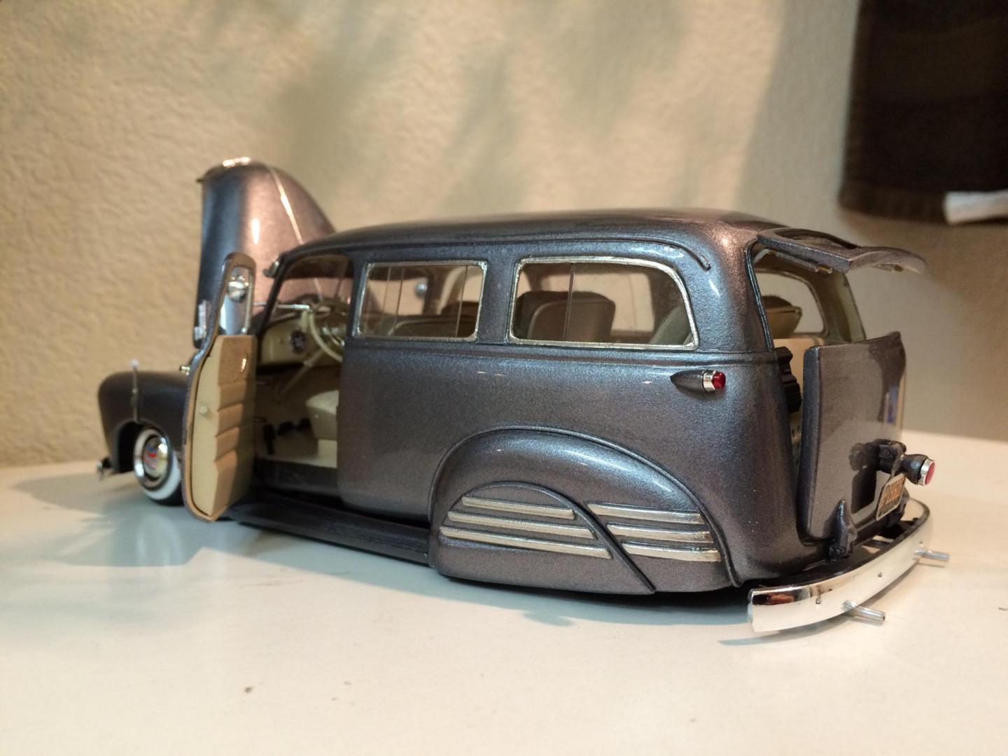 Hers is my 1950 chevy suburban that i just finished in time for the NNL WEST at Santa Clara. This started out as a 50 chevy resin kit, but i modified it with the amt 50 chevy truck cab for a better fitment of the hood and doors. The original piece needed alot of work in correcting the window frames, and adding new rear fenders. Also had to ad some styrene to the sides of the lower panel areas to be able to flow evenly with the lower section of the doors. I made the clam shell style rear door instead of the barn door style it came with, scratch built the following: rear single brake light attached to the tailgate, front visor, traffic view finder, compass, rear splash pan, all seats, seat frames, inner rear door panels, and couple other small items. There is a real working speaker system built in played by an ipod shuffle and yes it does still have full suspension. Well enough about it lol, and enjoy the pics