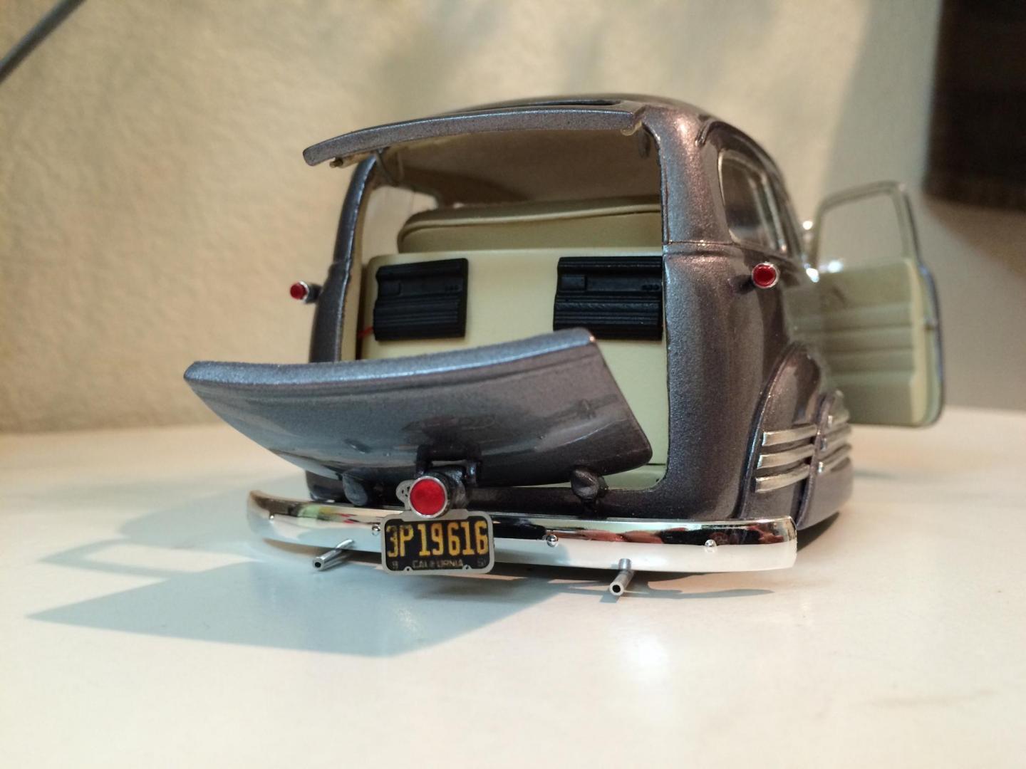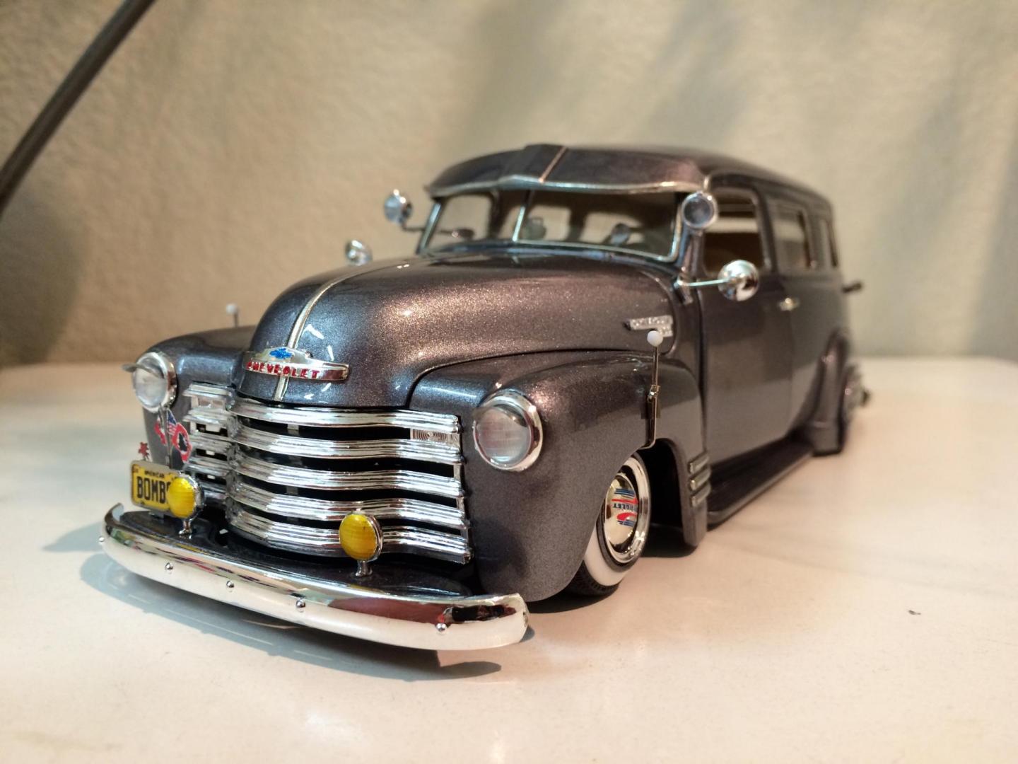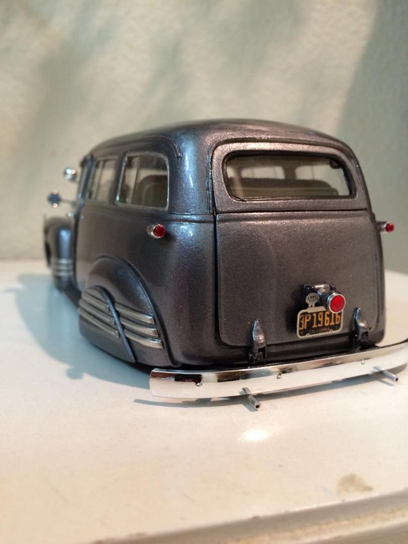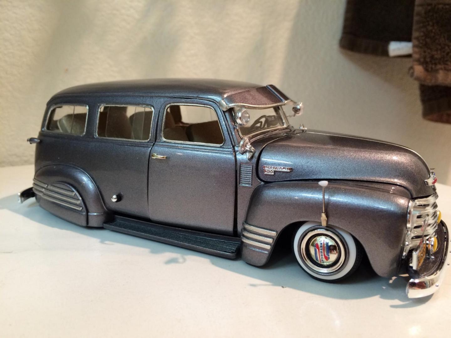 Hers is my 1950 chevy suburban that i just finished in time for the NNL WEST at Santa Clara. This started out as a 50 chevy resin kit, but i modified it with the amt 50 chevy truck cab for a better fitment of the hood and doors. The original piece needed alot of work in correcting the window frames, and adding new rear fenders. Also had to ad some styrene to the sides of the lower panel areas to be able to flow evenly with the lower section of the doors. I made the clam shell style rear door instead of the barn door style it came with, scratch built the following: rear single brake light attached to the tailgate, front visor, traffic view finder, compass, rear splash pan, all seats, seat frames, inner rear door panels, and couple other small items. There is a real working speaker system built in played by an ipod shuffle and yes it does still have full suspension. Well enough about it lol, and enjoy the pics