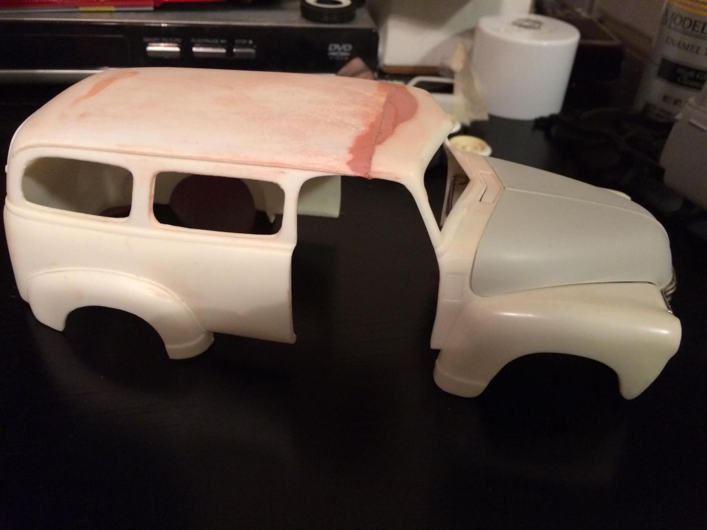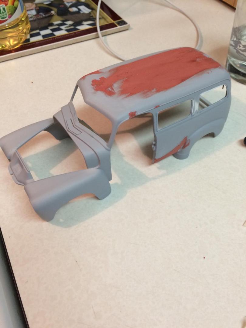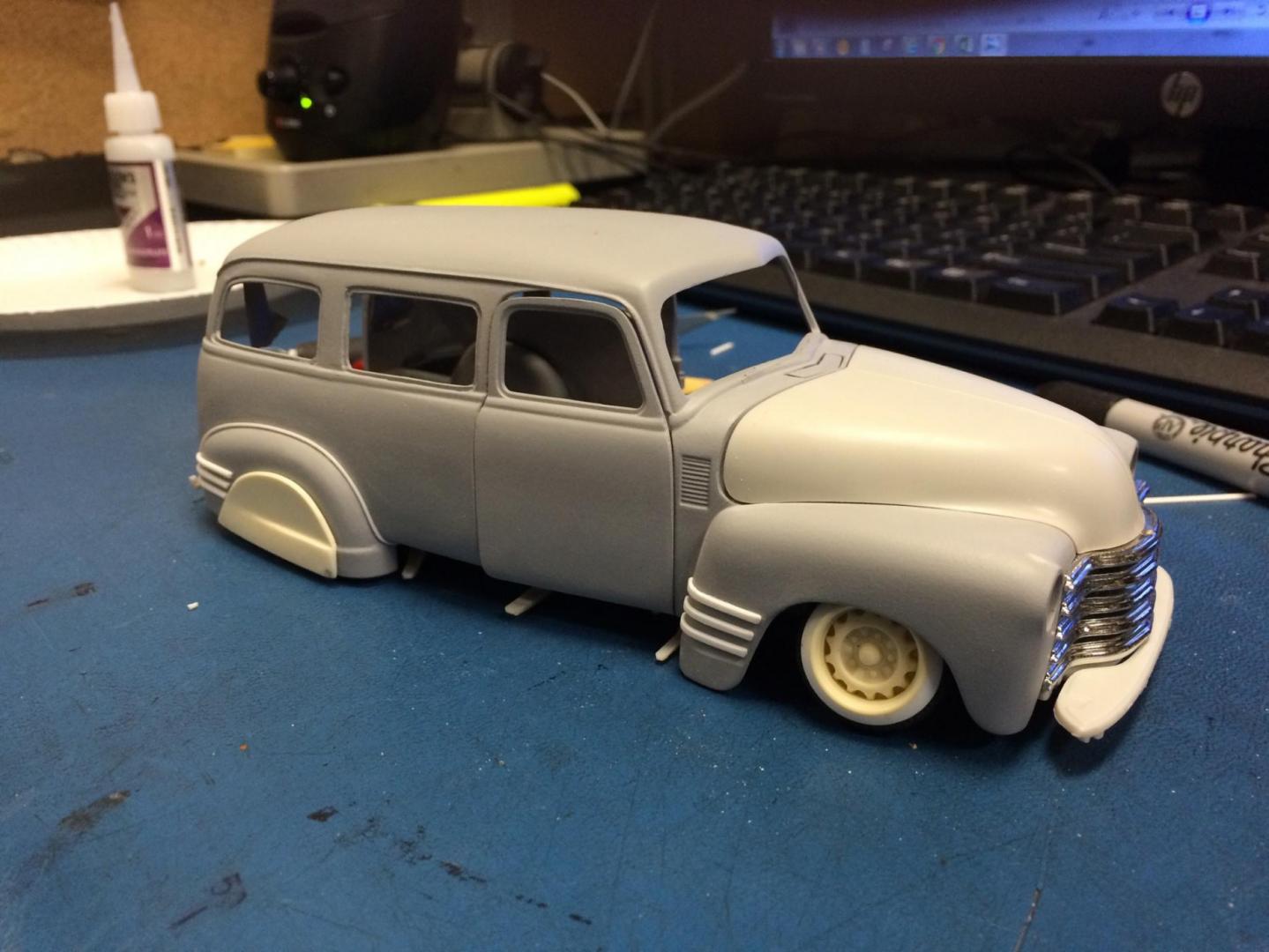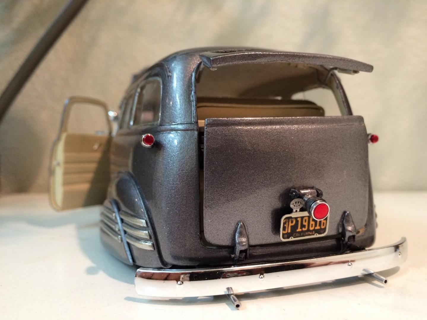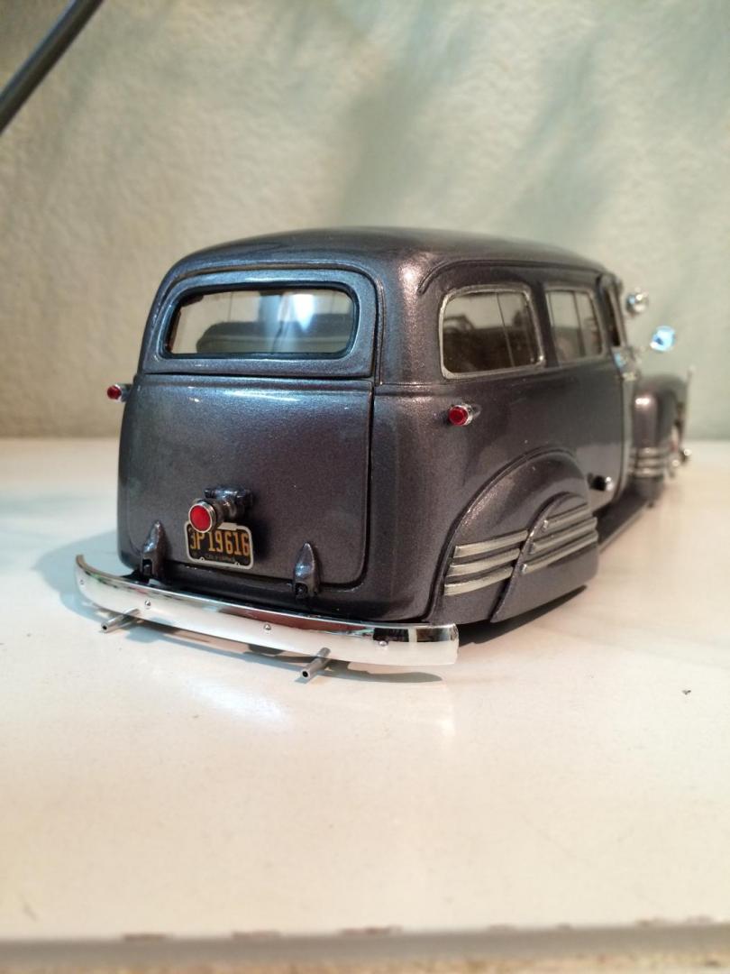 Hers is my 1950 chevy suburban that i just finished in time for the NNL WEST at Santa Clara. This started out as a 50 chevy resin kit, but i modified it with the amt 50 chevy truck cab for a better fitment of the hood and doors. The original piece needed alot of work in correcting the window frames, and adding new rear fenders. Also had to ad some styrene to the sides of the lower panel areas to be able to flow evenly with the lower section of the doors. I made the clam shell style rear door instead of the barn door style it came with, scratch built the following: rear single brake light attached to the tailgate, front visor, traffic view finder, compass, rear splash pan, all seats, seat frames, inner rear door panels, and couple other small items. There is a real working speaker system built in played by an ipod shuffle and yes it does still have full suspension. Well enough about it lol, and enjoy the pics