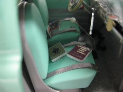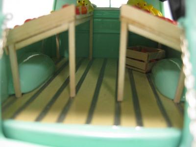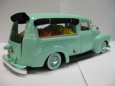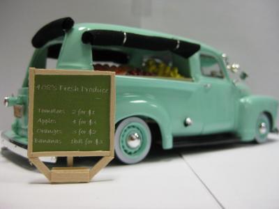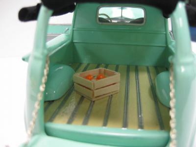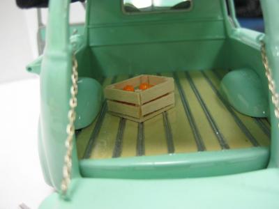 The oranges is made out of lil small braclett decoration balls that had a orange peel effect on them so once i painted them orange that had that real orange look, the apples are from a beed variety pack i found at walmart, i just cut lil small pieces of wood for the stem. The only thing i didn't paint was the bananas, that one was tought on figuring out, so i found some already done on ebay but they came as ceramic in a crate so i had to dremel them off. The visor comes with the amt 50 chevy pick up kit. Its a nice one too.