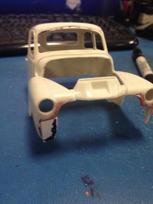Ok here's another project that i've had in my stash for over a year and brought it out occasianly when i got in the mood to work on it. I had bought the resin cab 54 abd removed the grille and was gonna chrome it and work on the resin cab, but after looking at it i decided why not try and use the 50 chevy cab for better plastic fitment and make my own 54. So little by little i had worked on it from an old spare 50 cab i had and started from the grille work back. So today i brought in with me to work and got back into it. Here is were i'm at on it so far. Reworking the front fenders, windshield, upper vent and fixing some cracks the cab had. I will also be making the correct rear bed sides as the 54 had them flat tops.