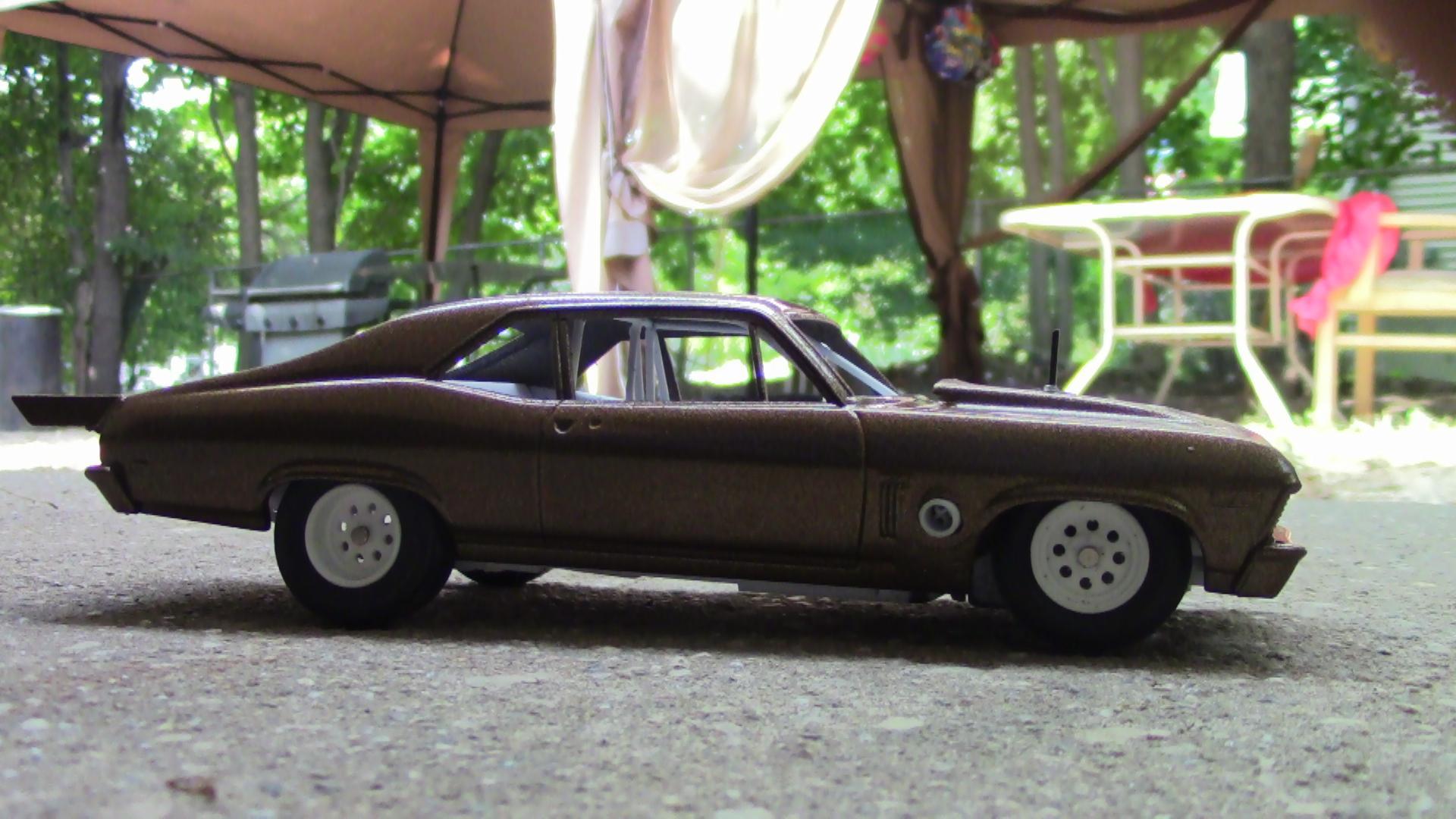 Big Tire N/T Camaro "Copper Head" with a 5.3 Bore Space Nitrous car pics do no justice to this color im thinking a decal on the scoop not sure what grill to go with will most likely be black. Backhalf car = stock location firewall and stock front frame rails w.i.p still. Pics are outside