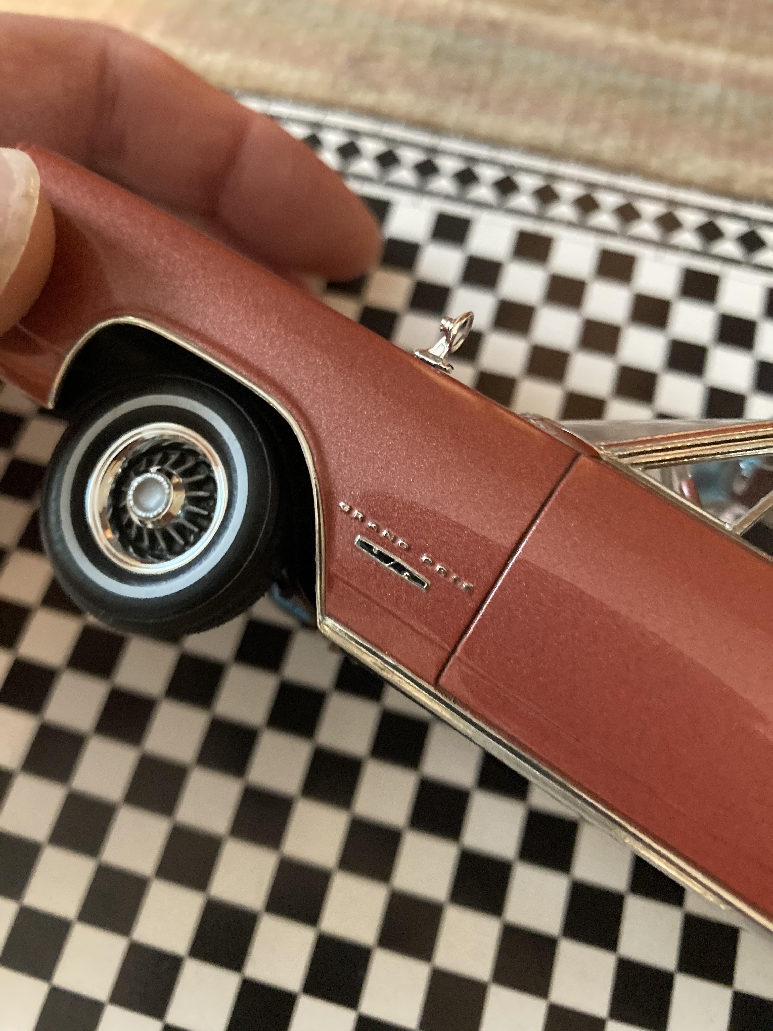 This is part of the reason why I use as many coats of clear as I do. (Usually 5 coats) The depth of the clear helps to guard against burn through during the polishing process. Other than that, just going easy on body ridges and around panel lines, and starting with the finest grit possible. Just course enough to remove any orange peel or other imperfections. Contrary to popular belief, if the right materials are used, detail hide is virtually non-existent. I routinely use 5 or more coats of primer, 4 to 5 coats of color, (lacquer), as well as 5 coats of clear lacquer. Anyone who has ever built an AMT 1964 Pontiac Grand Prix kit can attest to the fact that the front quarter scripts don’t get much finer than these, yet I was able to foil these after 5 coats of primer and 4 coats of color, before spraying an additional color coat, cleaning the script, and then adding the clear coats. Even with that many coats, it’s obvious that there is virtually no detail hide whatsoever. Certainly less than you’re likely to get even with a couple of coats of enamel. Steve