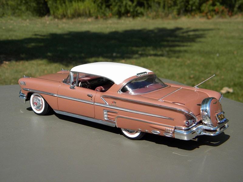 I agree with your assessment that most metallic paints, (even those designed to be used for scale models) often still have metallic particles that are too large for 1/25th scale, but often, this is only obvious in photographs, and almost completely imperceptible when viewing with the naked eye. If the paint you have used has flakes that are individually visible with the naked eye, you should certainly use different paint, but trying to find a perfectly in scale metallic paint is extremely difficult, if not nearly impossible, and even if you do find some that is very close to scale, in that scale, it’s almost impossible to tell that it’s even a metallic paint. The ‘58 Impala depicted below is about as close as I ever got to a correctly scaled metallic paint with MCW “Cay Coral” poly, but if you weren’t told that it was metallic paint, you’d be hard pressed to be able to see. I also agree about the toy like, overly shiny, “dipped in syrup”, or “hard candy” appearance that you often see with raw clear that hasn’t been toned down by polishing. This is a common effect that you often see with 2K clears, and I agree that more often than not, it appears, (to me at least) to be completely unrealistic. This is why I consider multiple coats of clear lacquer, followed by cutting and polishing a superior method, but of course, that’s just my opinion. 😉 Steve