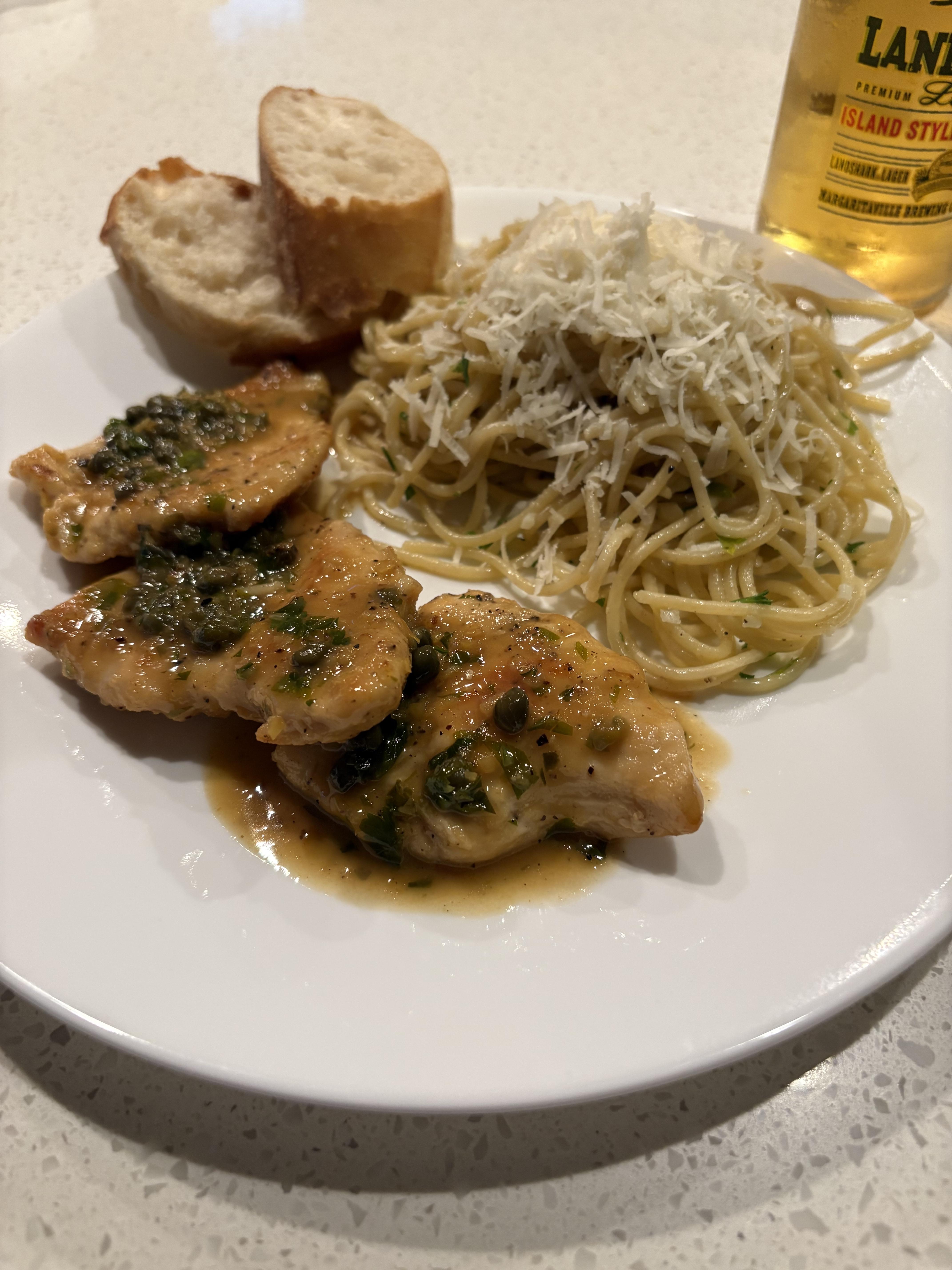 My lovely wife talked me into making one of her all time favorites. Pretty simple recipe of Chicken Piccata with Garlic Spaghetti. Steve -