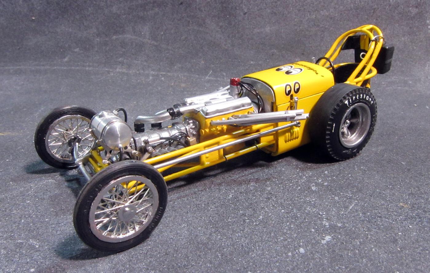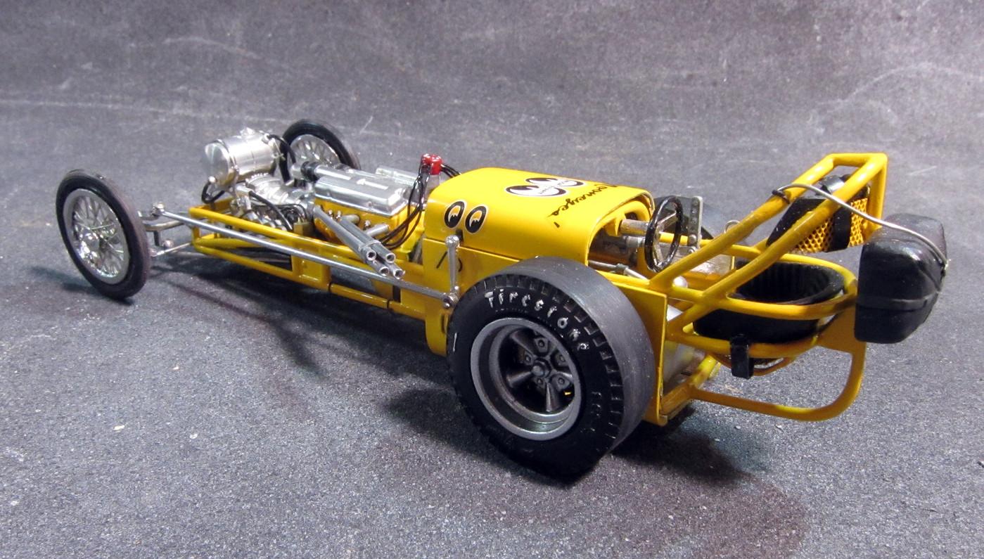 8. Upgrade/update: I recently began attempting to fashion my own wire wheels. After some trial & error I was able to produce an acceptable pair, so I went back and retrofitted this build. A worthwhile improvement, I think. Moderators: can you move this to the Drag Racing section? (I don't think that section existed when I first posted this).