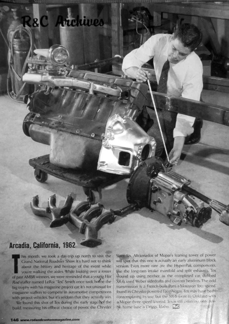 Speaking of the XR-6, here's a page that ran in Rod & Custom a few years ago. It supposedly shows Tex Smith measuring the slant six.