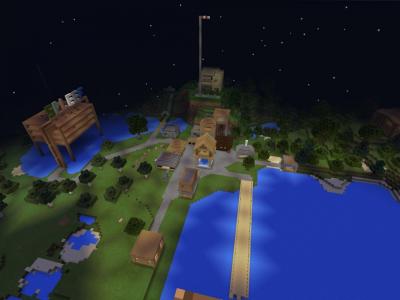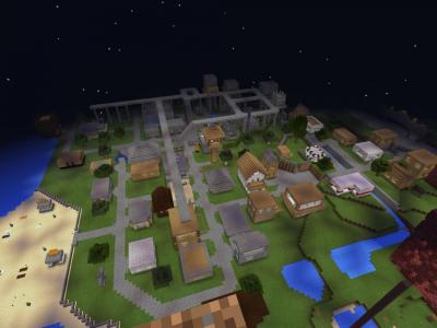 20. I just did a walkthrough of my city, and it's now 63 buildings; many are residential. There's an indoor pool, a pizza place, a shopping mall which took far too much time to build, a minecart sales/repair shop, a lumber yard, a large storage shed, and probably something else I'm forgetting. This is the view from a dirt pillar I just made. It's the only way I can get pictures. You may say, "Just fly up and take a picture!" I can't, because this is all in survival mode with no cheats. This is the latest addition, called Woodland Heights, a kind of anti-city. The forest off to the right never existed when I made the move here. It was a hills biome, and I planted every tree on there. There is a short underground metro system tying the two settlements together, and another above-ground rail system heads from the forest to a pair of villages. Past the villages, I've constructed a small prison which isn't done yet. I have a lot of time
