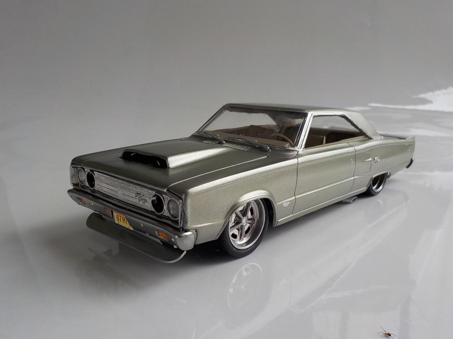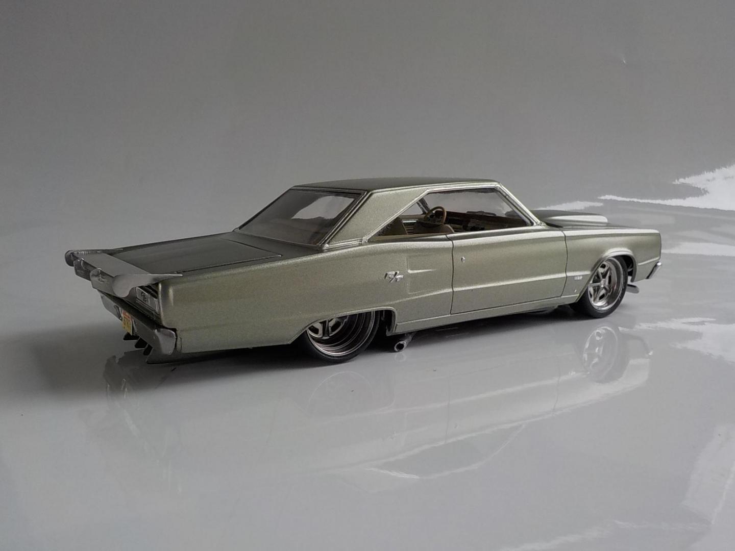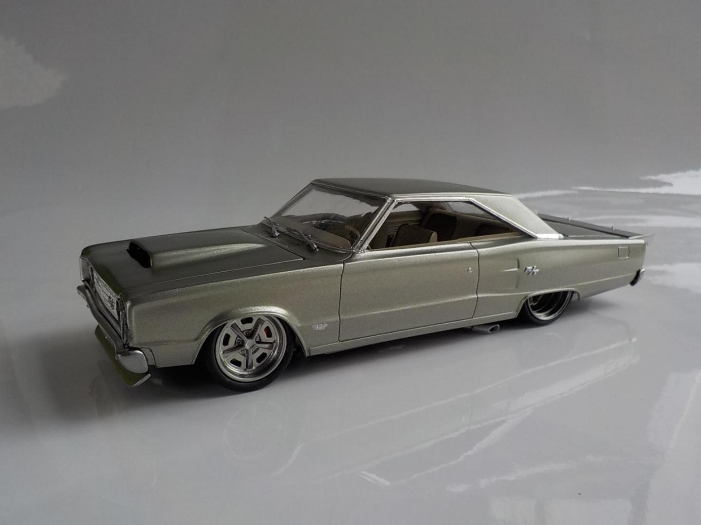This was a big build for me, over 2 months, i started with the Foose Coronet. Wanted to build a street monster, so i went with the kit 426 Hemi, and added a pair of monster turbo's, all the exhaust, intake and headers are scratch built. Fabricated a rear wing, front spoiler, and molded a scoop to the hood, and covered the original fuel tank, and made some diffuses, to go with the theme i wanted. Interior was subtly changed, adding some piping to the seats and door trims, also sank the rears back, to make 2 rear buckets, added flocking and a hood lining. Used the kit wheels, but utilized a set of wide bands for the rears, made a 4-link, and mini tubed it too , and opened the trunk, and made a fuel cell. Paint is a mix of Dupli-color GINGER ALE, and MARTINI GREY, the body was painted 3 times before i got the SATIN look i was after.