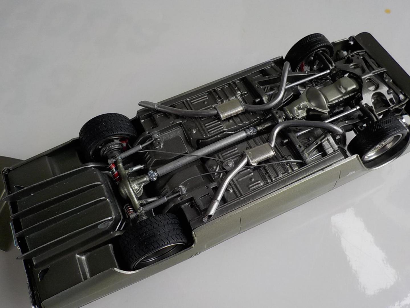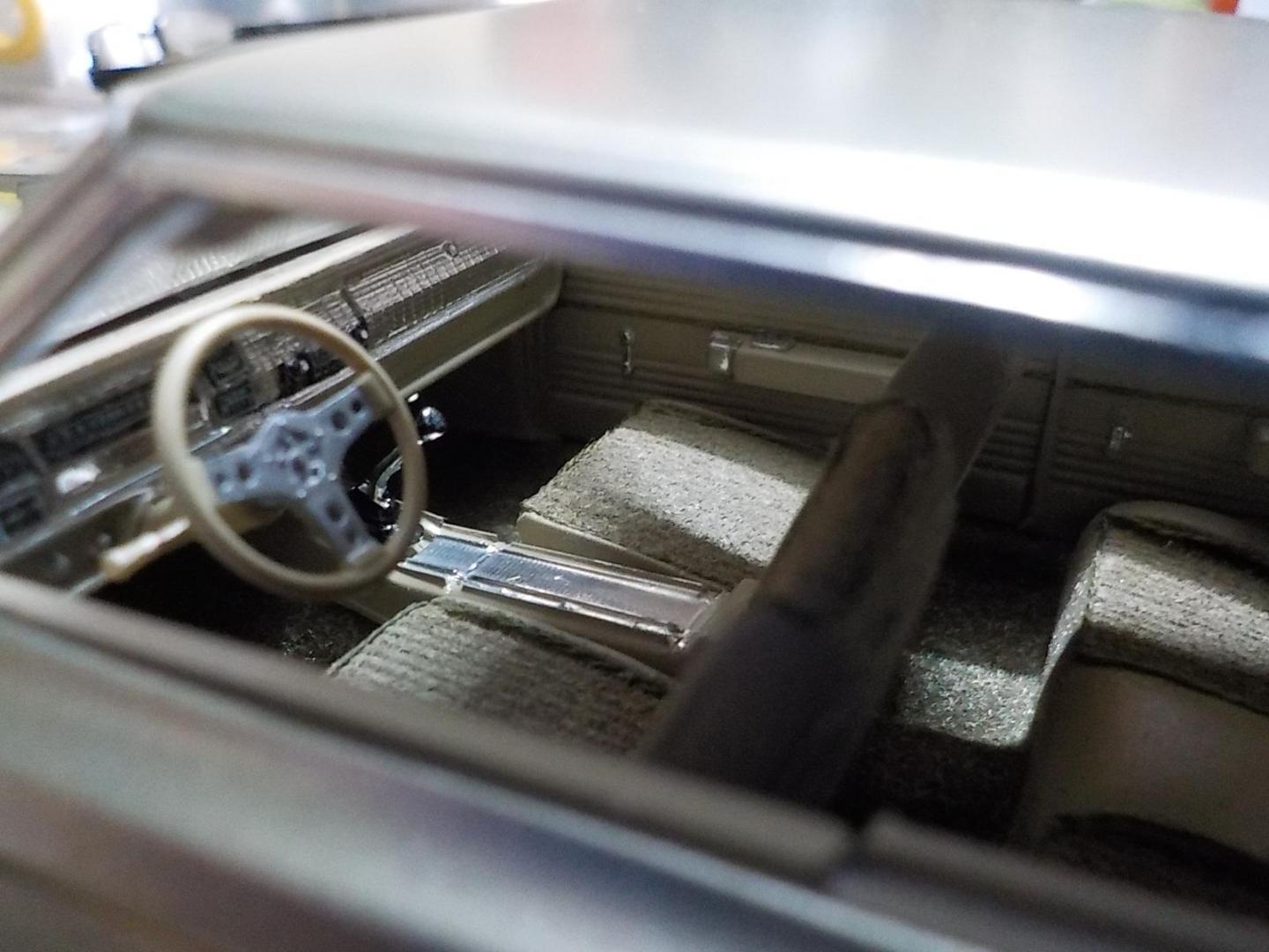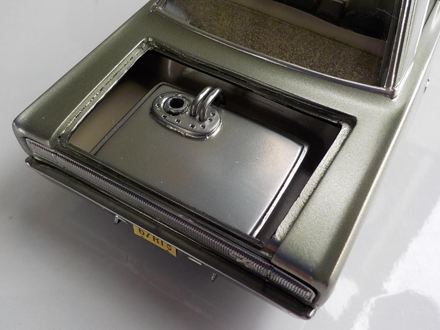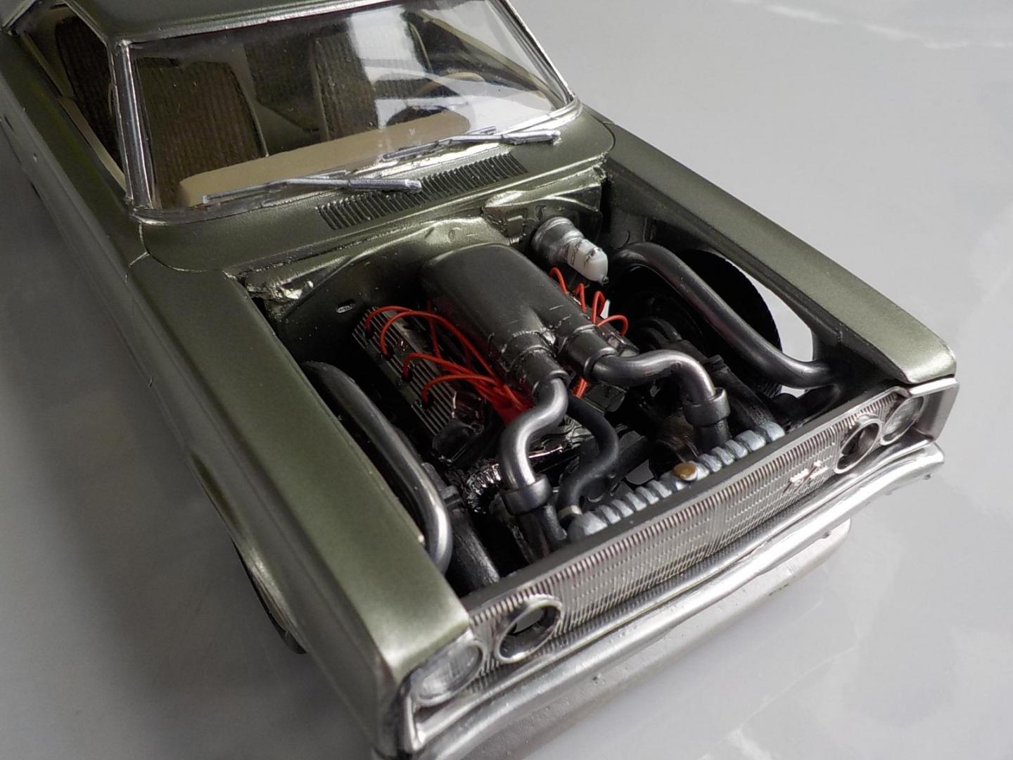 This was a big build for me, over 2 months, i started with the Foose Coronet. Wanted to build a street monster, so i went with the kit 426 Hemi, and added a pair of monster turbo's, all the exhaust, intake and headers are scratch built. Fabricated a rear wing, front spoiler, and molded a scoop to the hood, and covered the original fuel tank, and made some diffuses, to go with the theme i wanted. Interior was subtly changed, adding some piping to the seats and door trims, also sank the rears back, to make 2 rear buckets, added flocking and a hood lining. Used the kit wheels, but utilized a set of wide bands for the rears, made a 4-link, and mini tubed it too , and opened the trunk, and made a fuel cell. Paint is a mix of Dupli-color GINGER ALE, and MARTINI GREY, the body was painted 3 times before i got the SATIN look i was after.