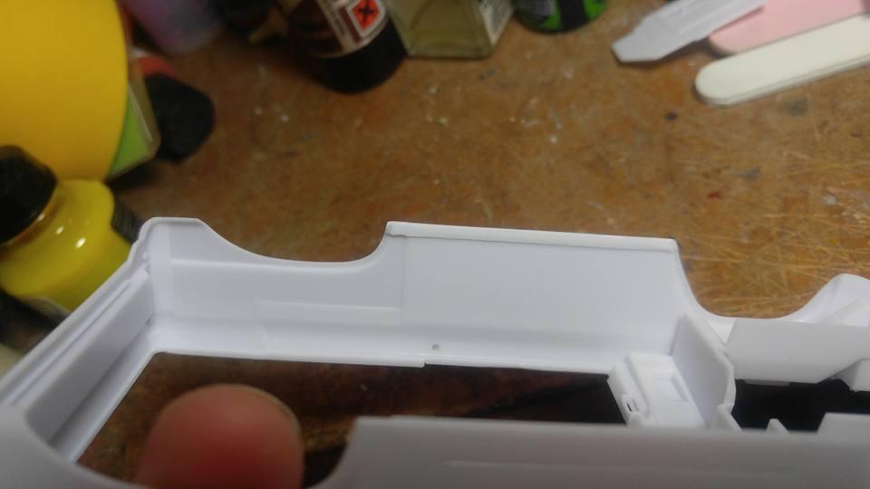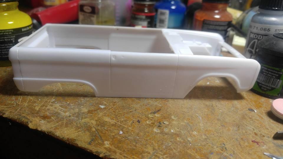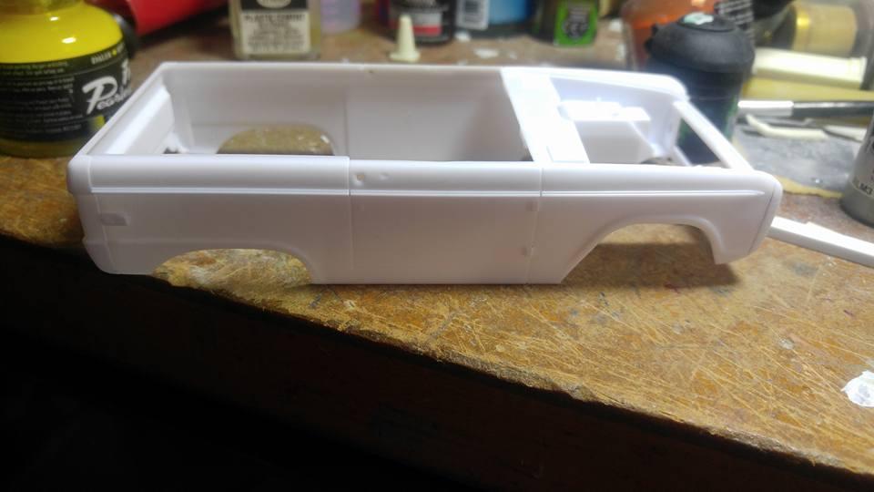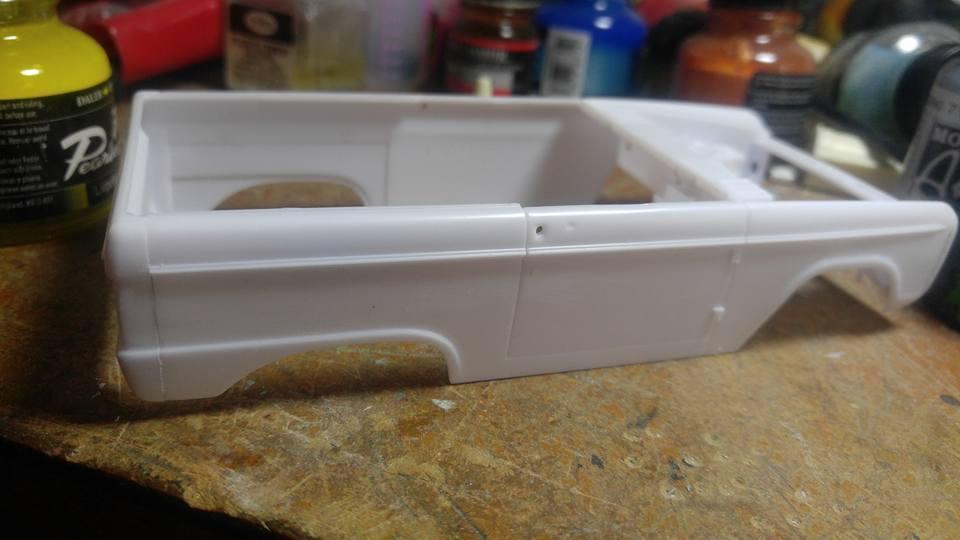 I decided to remake all body reveals and I used Evergreen strip for the top of the sides and on the rear of the cab. I went to my local Maker Space and used the laser cutter to make the new raised door panels. The details can be seen in white plastic. I also ground down some ugly tooling blobs on the inside of the body. The original kit has a tub style interior ad would cover that. Since I do not know what I will use for an interior yet, I smoothed it out. I also smoothed and filled / molded the cowl.