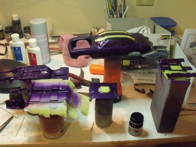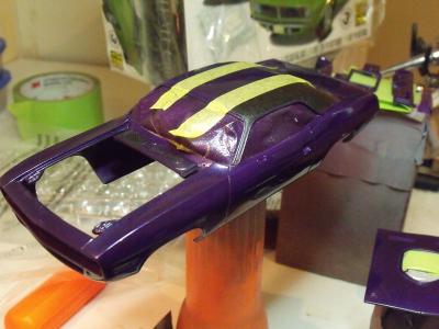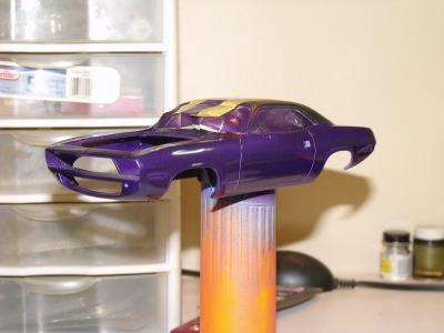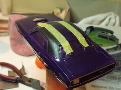 23. Howdy, Im new here, but have actually have been a visitor many times this year. I started building model cars back in the late 1980's and then got away from it in the mid 90's until recently. I used to travel arount the mid-west and even a little on the east coast, back in the day, attending model car shows. I just started back up building this past year. Boy have I missed it. I have already completed a few builds and at some point will post them for you all. I recently bought the new Revell 70 Hemi Cuda kit and wow do I like it. I know there are a few issues with it, but, hey, there are with most kits anyway. And besides thats why they call us model builders. Right? Part of the fun in building kits for me is correcting what I can, and adding and changing what I want. Well for this build I decided to do a vinyl top verson. It will be painted testors plum crazy purple enamel. I'll be posting a few pics along the way. I have already corrected the wheel openings, built the side window trim out with evergreen strips, instead of etching them deeper- this helps with the thickness of the vinyl top material I am using from the model car garage. I, also, have already scratch built the molding, below the rear window, for the vinyl top from evergreen strips. The body in the first few pics has already been painted, clear coated and polished and I have already started applying vinyl top meterial. I primered the body with tamyia thin grey primer. Then mixed my paint as well as my clear coat at 50/50 with hardware store laquar thinner. Excuse the pic quality, my camera is almost as old as I am LOL. I'll be posting more as I go along. Thanks in advance for checking this post out.
