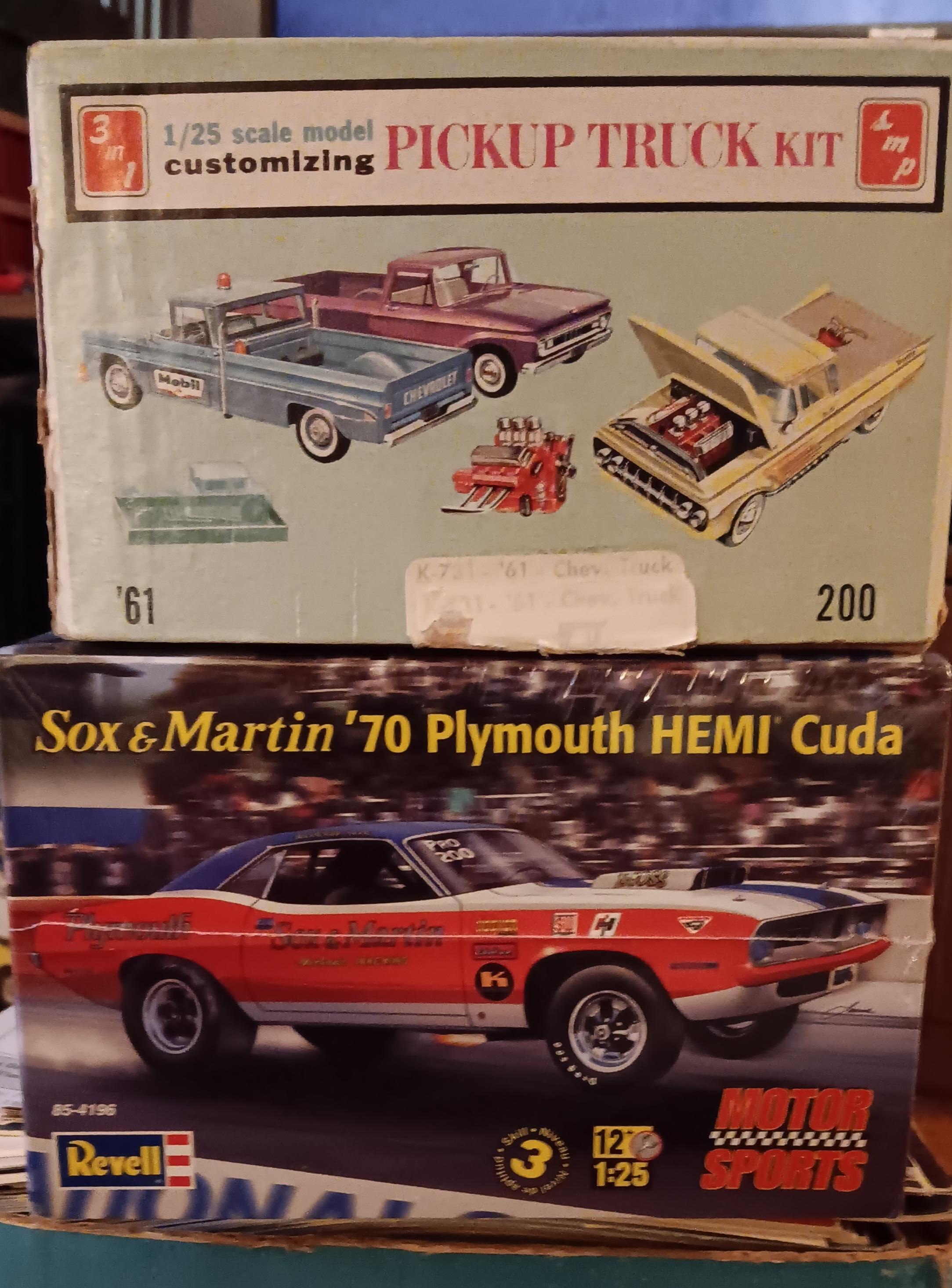 Train show yesterday! Decent size train shows always have a decent tool vendor or two, and this one was no exception. Found some decent quality tweezers, some polishing sticks, and polishing cloths. Also got two kits. I snoozed on the Sox & Martin 'Cuda when it was available, found this one. It's autographed by Ronnie Sox's wife, not sure if that does anything for value but I got the kit for $40, less than I have seen other ones go for since it was discontinued. Revell will probably issue the kit again in this version, but likely without the Sox & Martin tie-in. I'll leave it alone for now, maybe I'll find another one at some point. I can always keep the shrinkwrap intact on the lid if I open the kit. On the way out, I tripped over a '61 Chevy pickup. From the looks of things, it was started but never finished (grille, taillights, hubcaps, and hood trim are all unused and intact). No junk glued into the interior or bed. No trailer or optional parts, no big deal. This one was priced at $50, but I got it for $40. Also snagged a parts bag with a couple of interior buckets in it, for three bucks. One interior was a '65 Barracuda piece, which I just so happened to need one of.