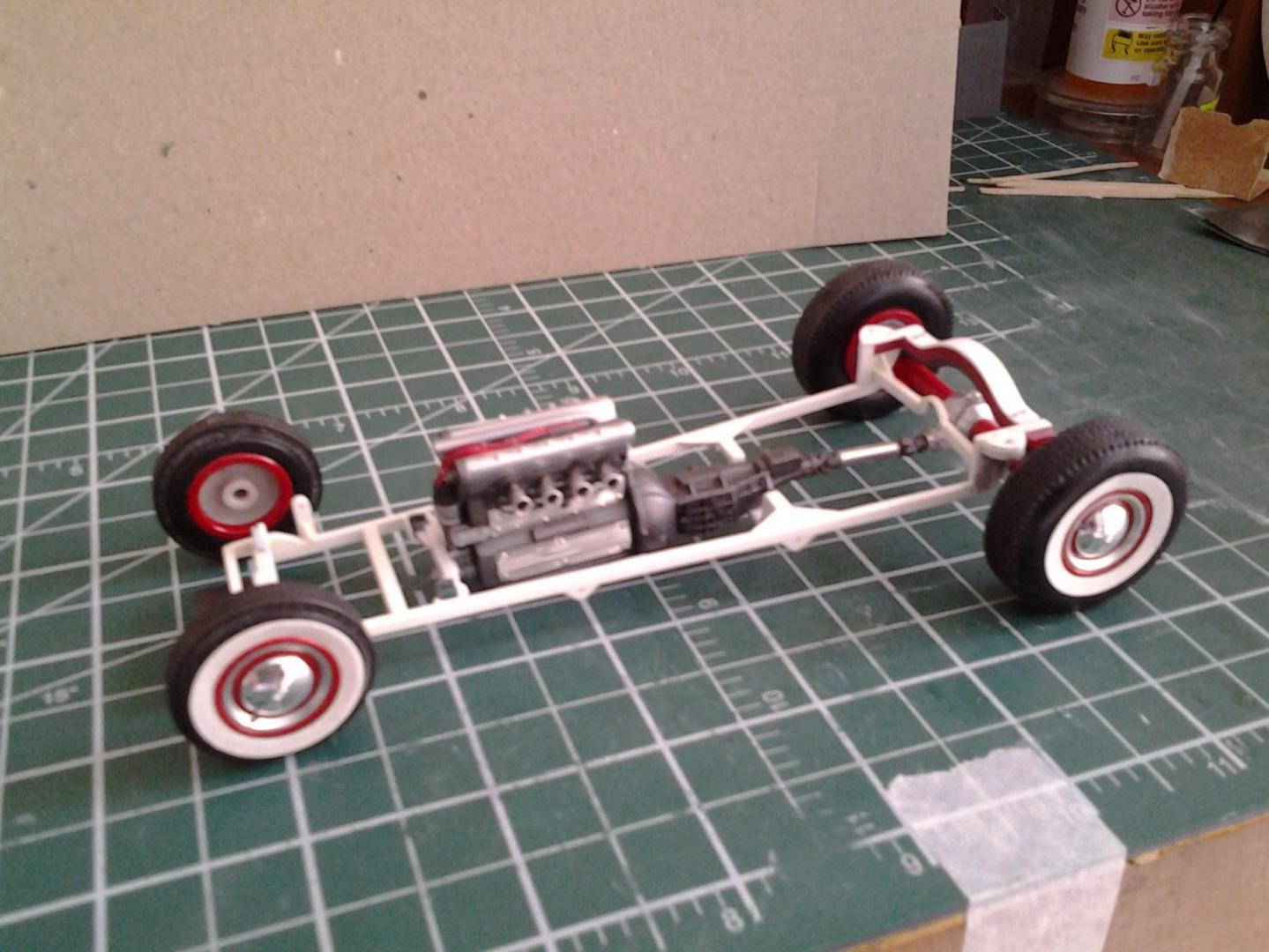 I have the carpeting in (charcoal), and you can see the red and light grey upholstery for the side panels. I also installed the headlight lenses into the pots from the ZZ Top '34. My next job is to make the radius rods for the front and rear axles. Still have a list of things left to do, but I'm making progress.