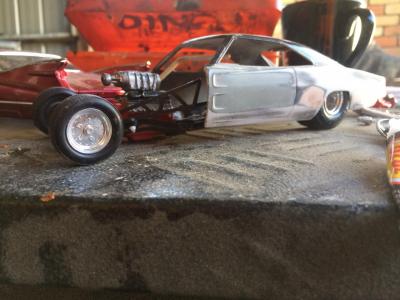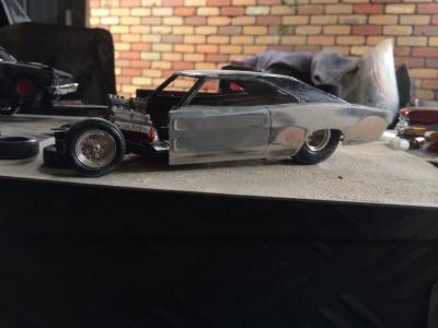 Here is a charger I got from my brother... No chassis and no running gear.. Just a shell which he cut one of the rear wheel arches to make a derby car.. He never cut the other one out though.. So I decided to make a pro stock style car with spares from my parts box.. I have started making the new rear wheel arch for it which isn't done.. I have two 440's and a hemi (still deciding on the engine) and some drag wheels from a chevelle I ended up making into a dirt tracker. I have a chassis from a studebaker funny car I used to have and countless other parts so hopefully make a pretty sick charger out of!