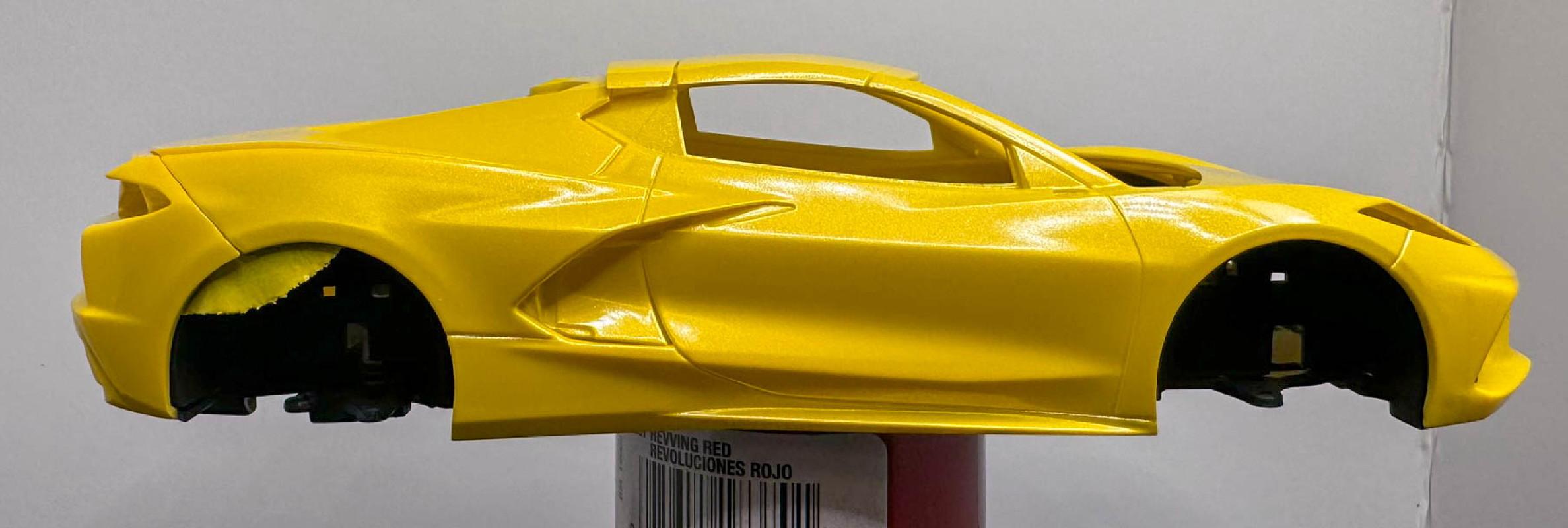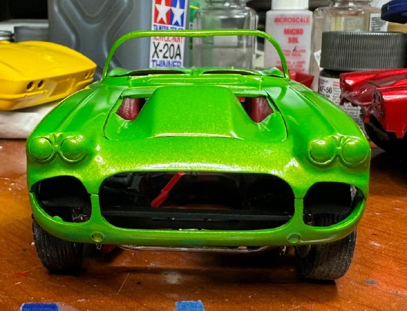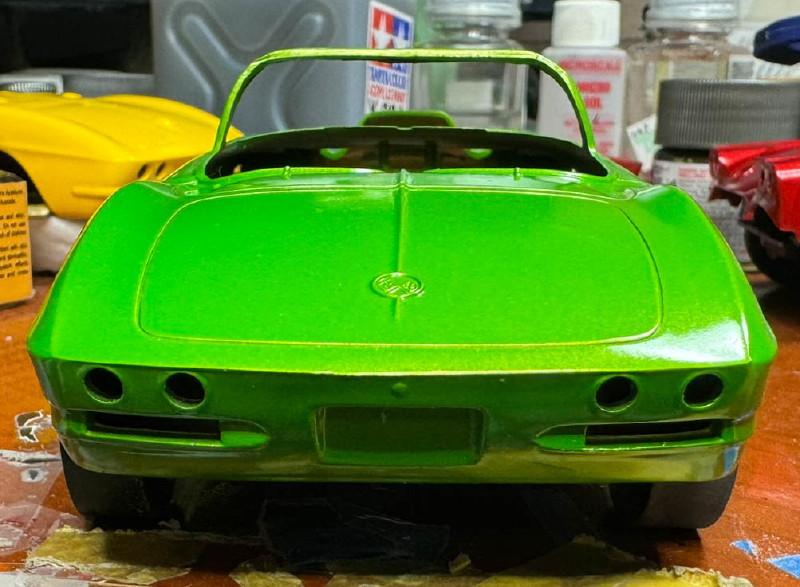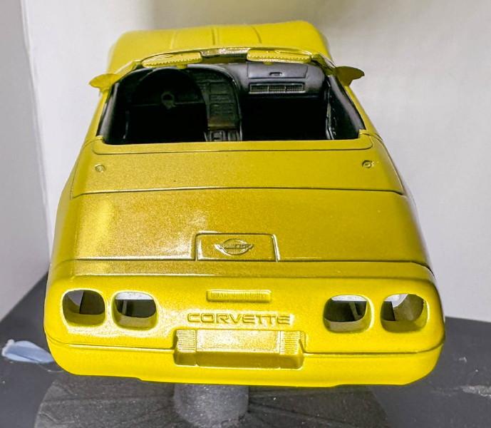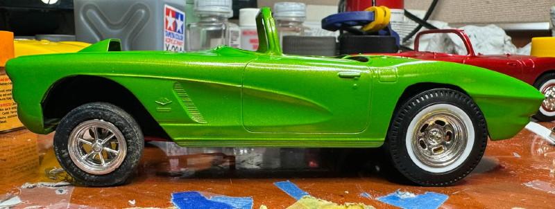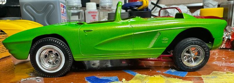 Another one started in 2015, I had some problems with the paint, so I got another body from eBay for it. Nine years later I took another look at it and decided I could fix the paint problems on the old body. Tamiya paints, Matt white base with TS-17(?) yellow. From 2015 The 2024 repaint. Since I've discovered that yellow was not a factory color in 62, I may put the chrome revers wheels on it from the 58 Vette kit. I'll see how they look. Thanks for looking all comments welcomed.