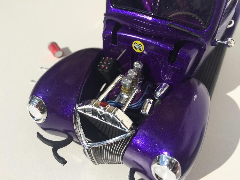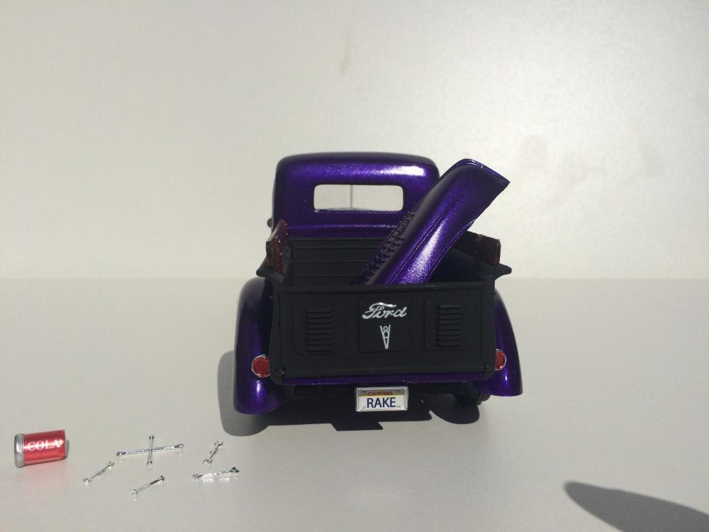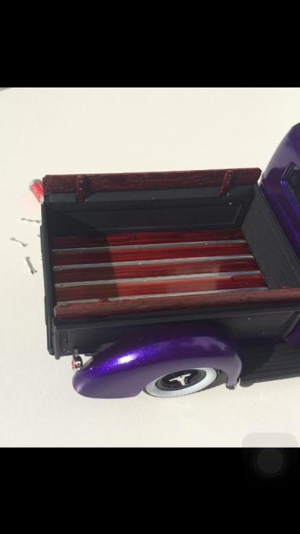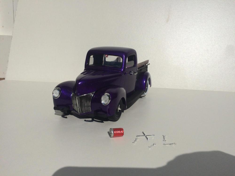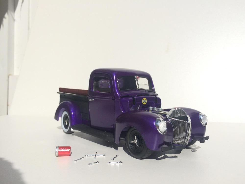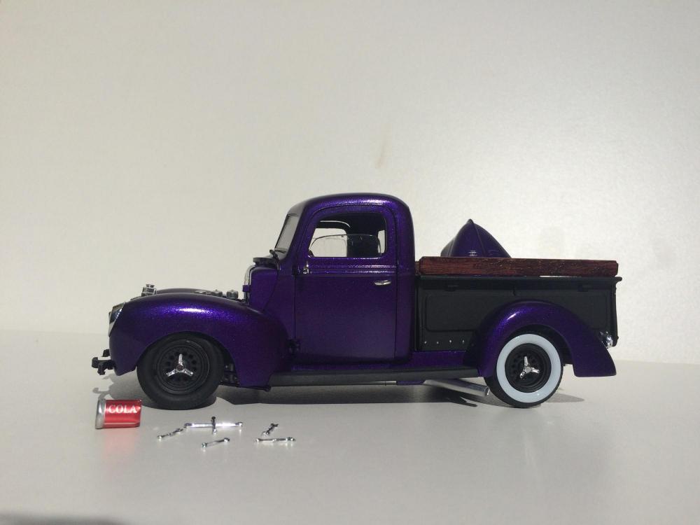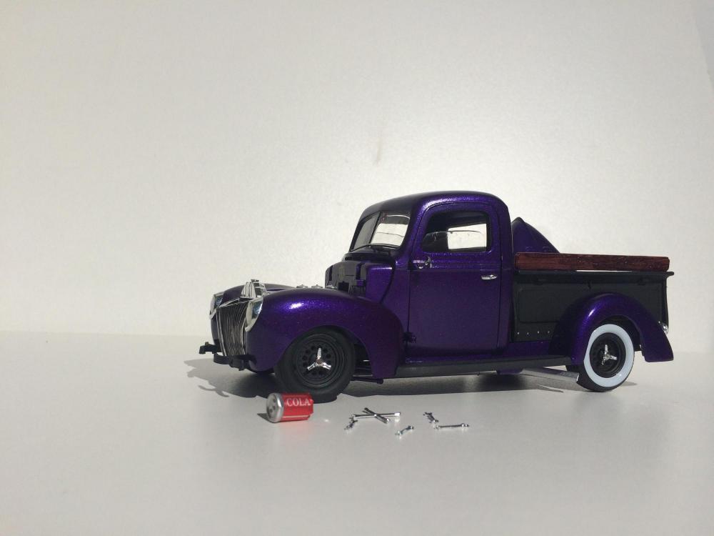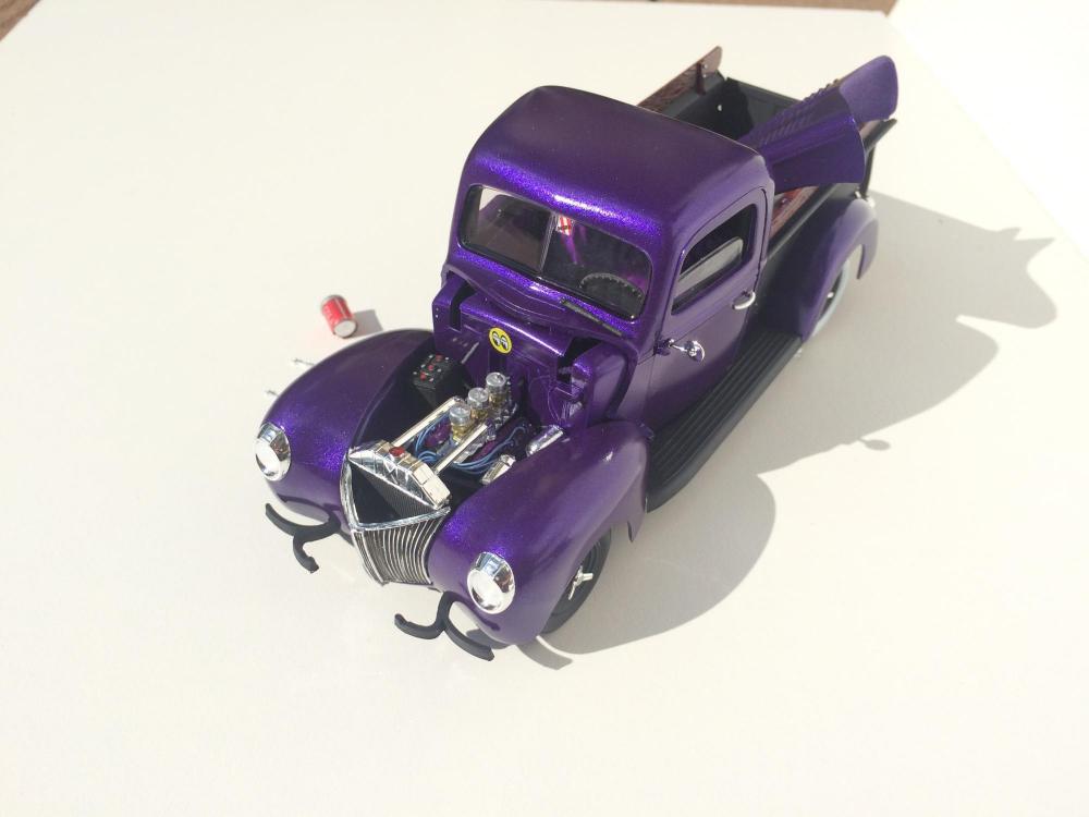 Hey everyone, Here is my finished 1940 Revell Ford Pickup. This was a interesting build to say the least and really did not want to be put together at some points, including when my photo area decided to collapse and land on the truck breaking some parts off. It's been dropped, repainted and everything in between and put back together more times than I would like haha. But it's finally finished! I used Model Masters Laquer for the body, the rest was airbrushed with tamiya and testors acrylics (first time ever using an airbrush) interior, engine, flat black bed etc. The kit more or less box stock with some exceptions, I flocked the interior with purple carpet, did park plug wires, and got rid of the horrible molded exhaust the kit comes with and made my own for the first time out of aluminum tubing. I hope you all enjoy!! Steve