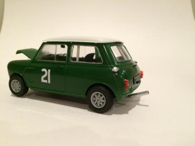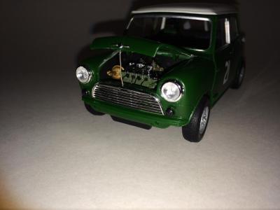 Hey all! Just finished up the Tamiya Morris Mini Cooper today! This is my 5th build and I learned so much on this build and I can not wait to build another. This kit is box stock other than spark plug wires, aluminum exhaust tip (I extended it for a blast pipe style look) and interior flocking. For the "carpet" I used embossing powder for the first time and it worked great! For the body I actually used the LMG polishing kit on the factory plastic mold color and was very impressed on how the outcome was after wet sanding, and finished it off with some rubbing compound and wax. There was definitely a noticeable difference in the finish. Also I decided not to glue the roof on so I can always remove it to show off the interior and then put the top back on. I am almost finished with a Camaro so that will be up here soon enough as well. Hope you all enjoy, Thank you for looking! Not sure why the wheel looks so crooked, but it's really not that bad at all in person! Hahaha Shot of the engine before the interior was added. Some small engine parts were added after this picture as well but hard to see once the hood is open Thanks again for looking!