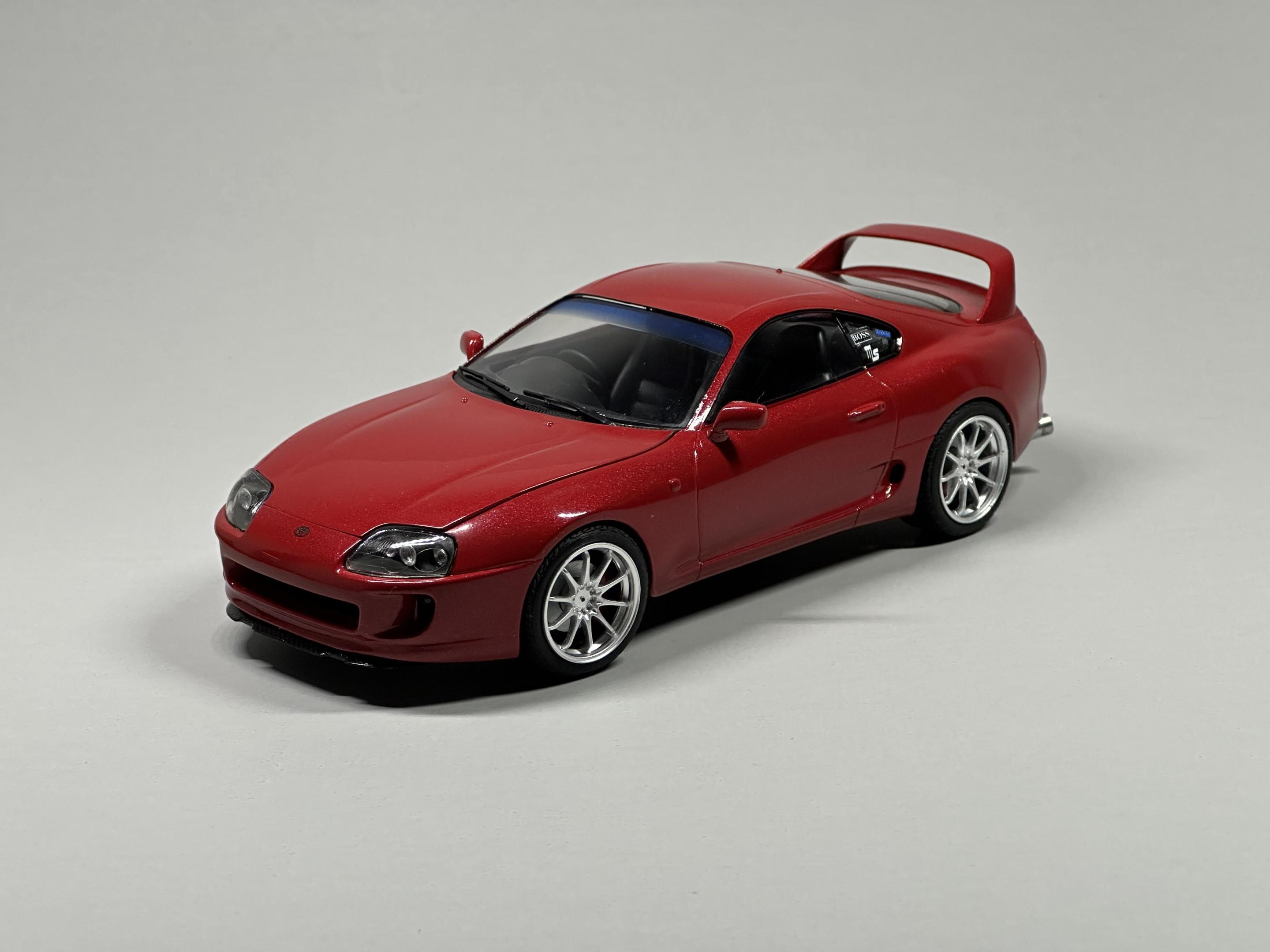 Here is my take on the Toyota Supra from Tamiya. Great kit, and everything went together as it should. I used wheels from Aoshima and slightly lowered the suspension to make them fit properly. It’s painted with Testors Revving Red and cleared with Testors Clear. Various Tamiya and craft paints were used for the rest of the kit. I scratch built the intake piping and used a cone filter from my parts box. Lastly, the exhaust was made with styrene tubing and bent using some heat. I had a great time building this kit, and hope you enjoy. On to the next!