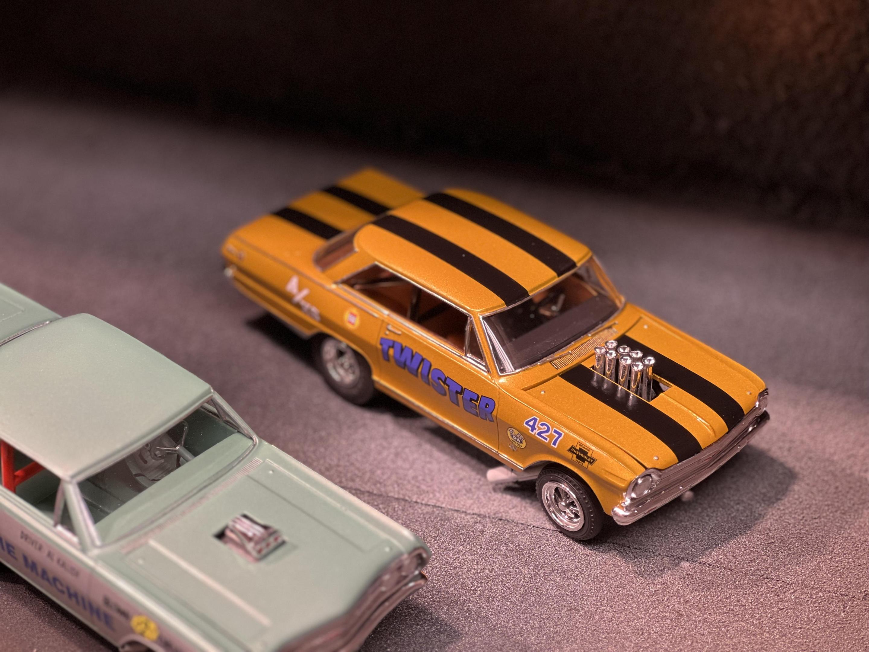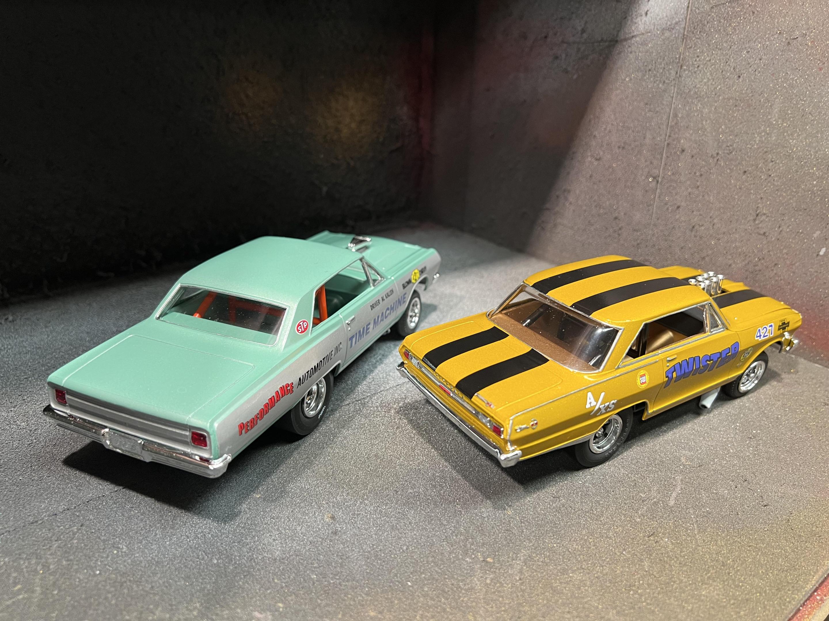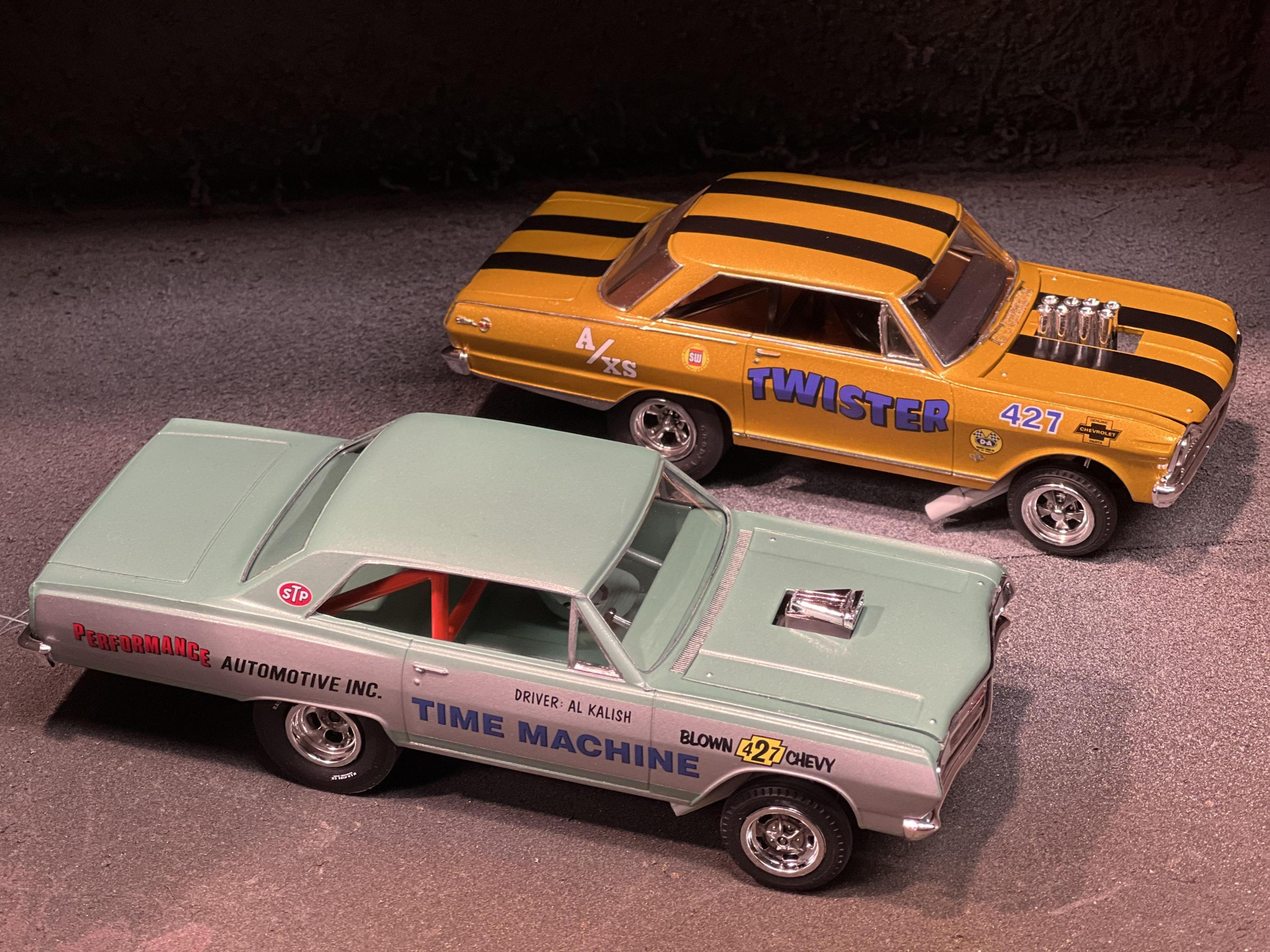 22. Completed my first two builds of 2024 (Completed and off my bucket list!): Kits are: The new AMT 1302 Chevelle Funny Car ("Time Machine"), and AMT 30105 Chevy II "Rat Packer" (1998 Ertl re-issue), with AMT 1293 "Twister" kit decals.