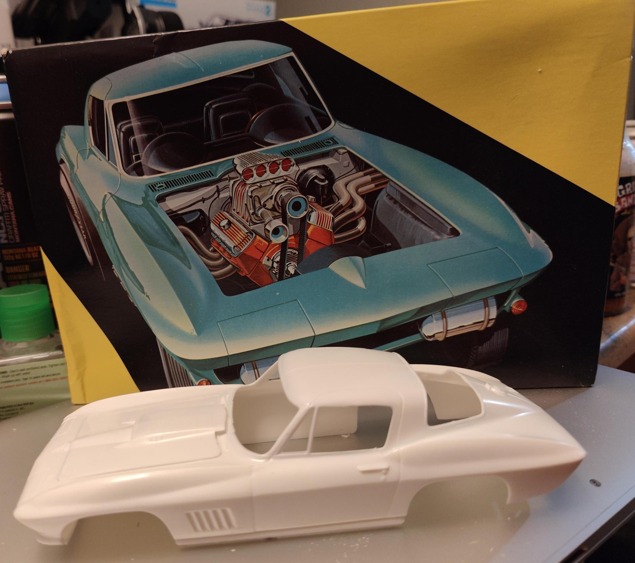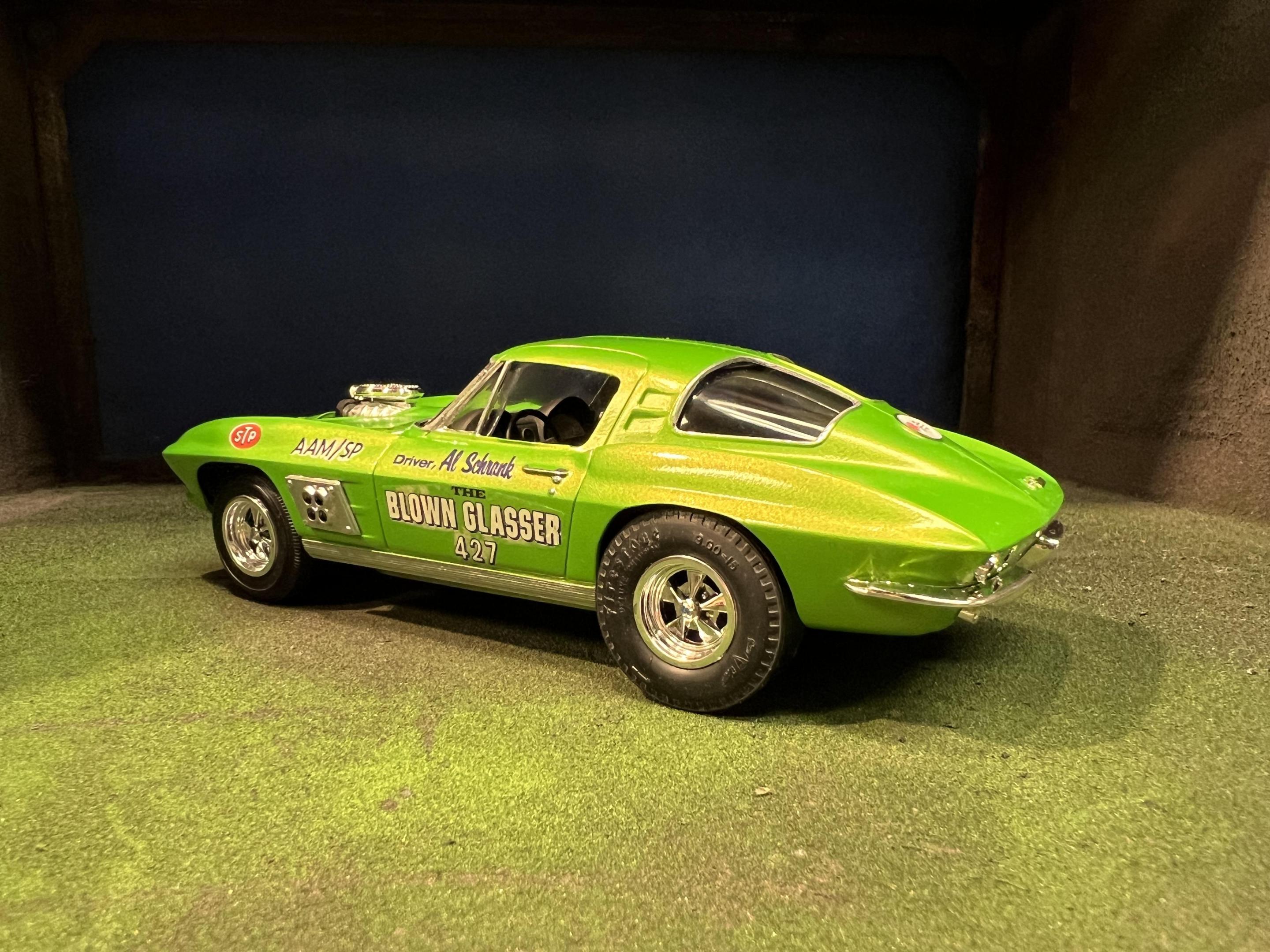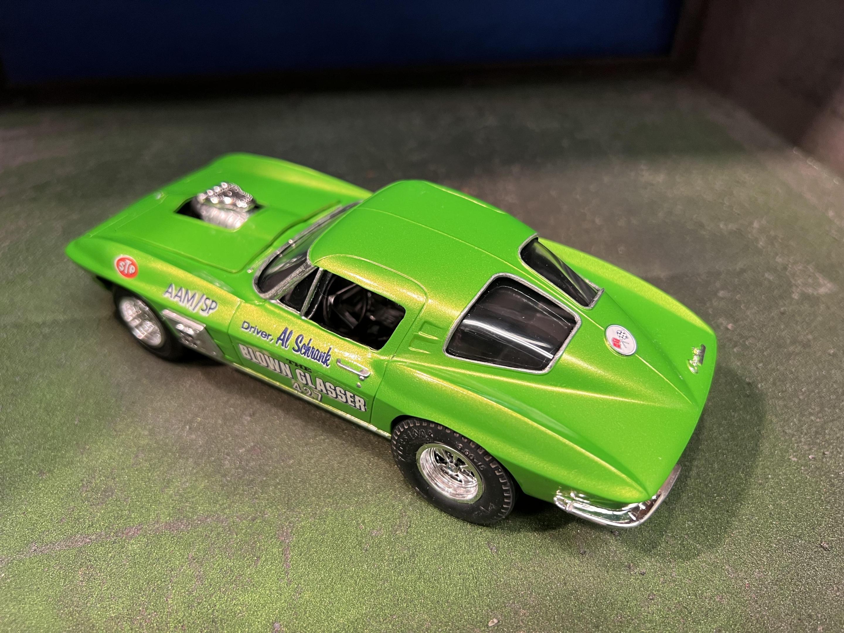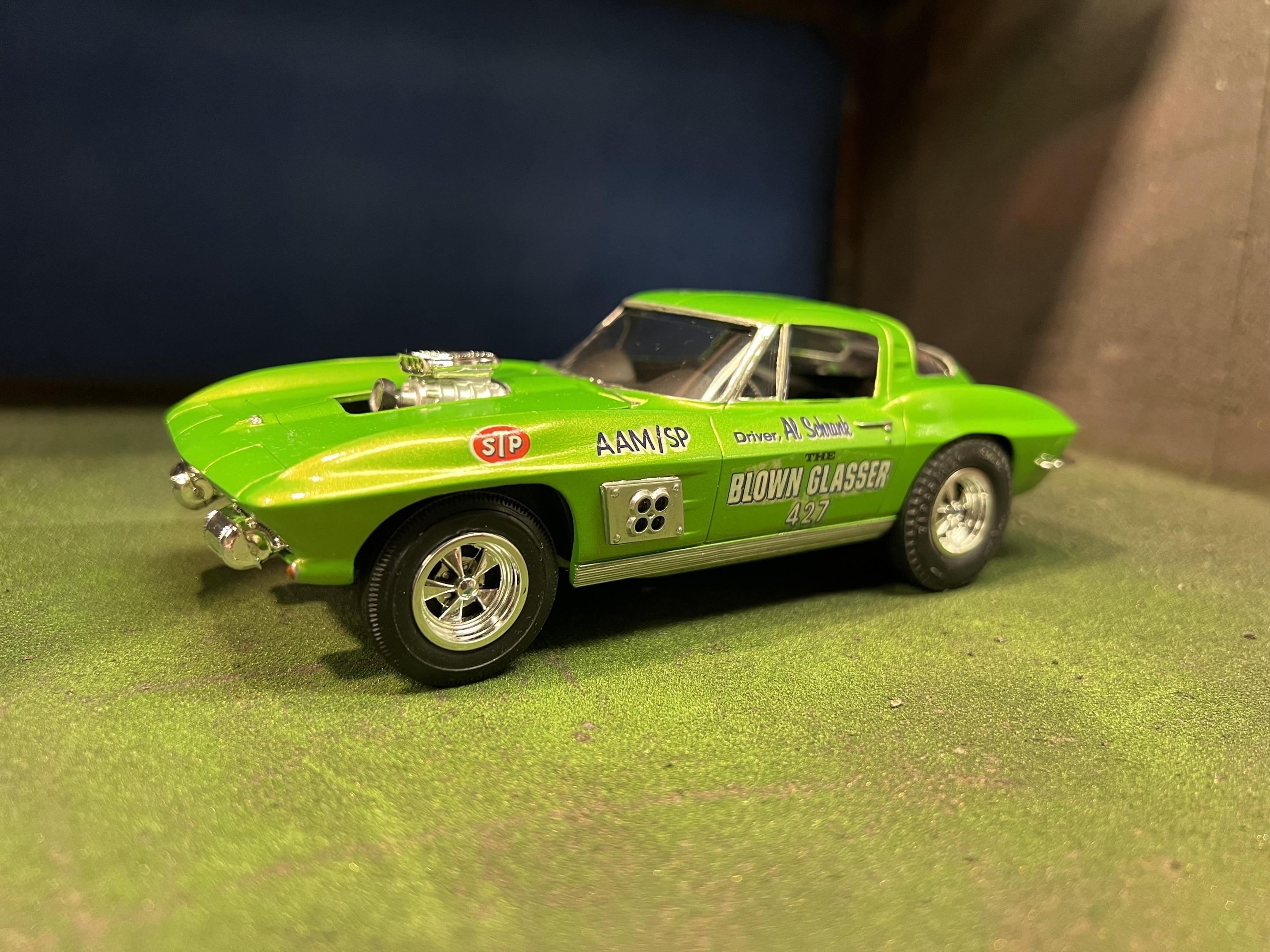 8. I have a question about the body dimensions between the AMT '63 Corvette fastback/coupe and the old AMT 1967 Corvette fastback/coupe kit bodies. AMT completed the annual kits of the C2 Corvette, fastback and convertible, in 1967. After that, the kit was re-issued three more times before AMT back-dated the kit to produce a '63 spit-window coupe (A163, 1973). Was there a dimension difference between the '67 coupe body and the later '63 coupe body? I am currently building the AMT/Ertl 6520 '63 Corvette coupe kit (1988) as a box art build to appear much like the '67 drag 'Vette [AMT T238 '67 Corvette coupe (c.1971-72), pictured below]. I've noticed while fitting the body onto the chassis with the 427 engine and side-exit headers, the headers stick out widely and cause the '63 body to bulge out behind the front wheels. The Big Block engine and headers were derived from the '67 kits. Was the the '67 body wider? Was the '63 body adopted in 1973 narrower? Even the '63 firewall is struggling to fit.