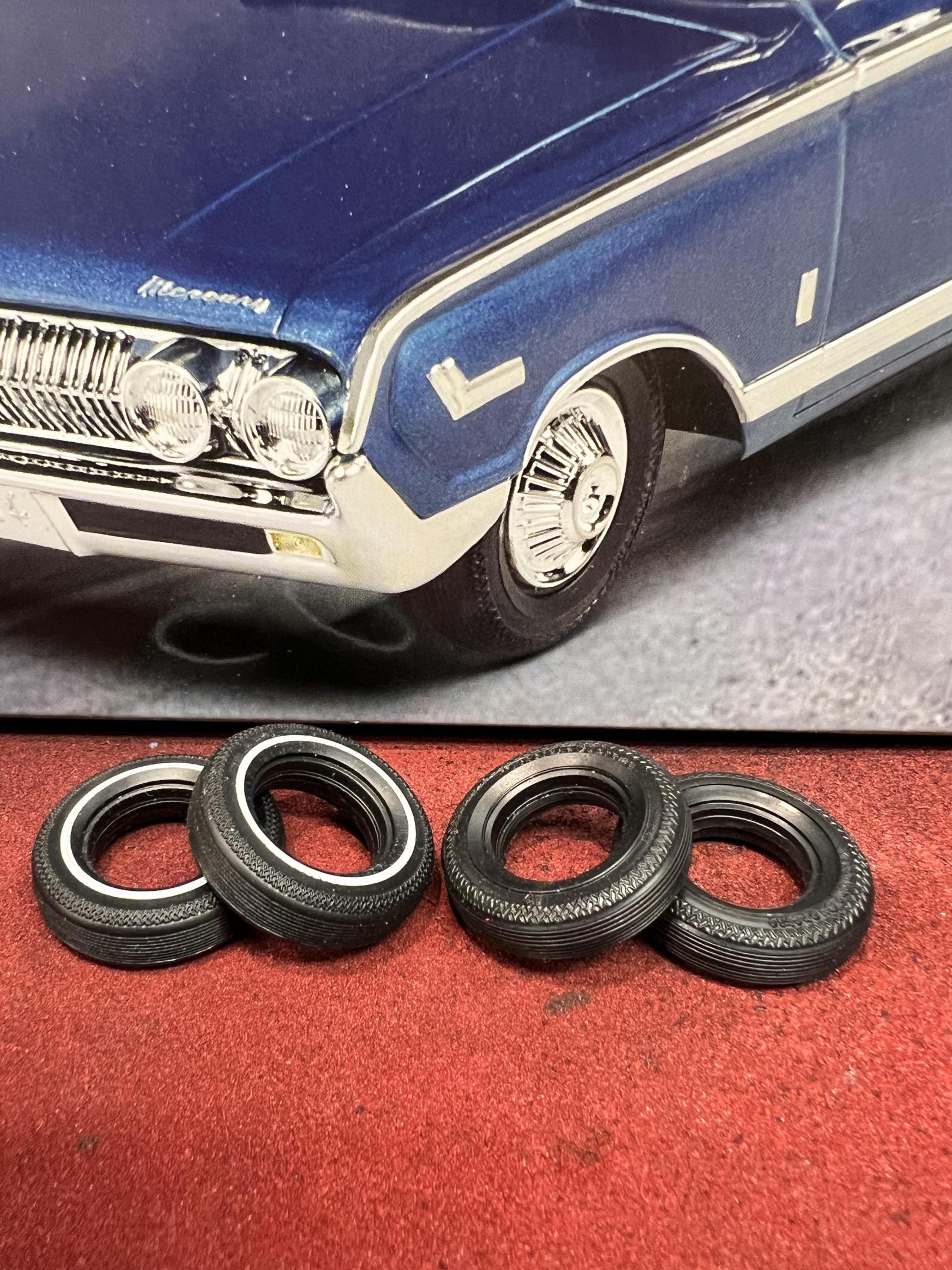 3. The latest AMT '58 Chevy Impala kit ('Ala-Impala' Round2 AMT1301) has skinny Firestones with a fat whitewall on one side and a white-stripe whitewall on the other. The undesidered side can be painted over with a matt black.