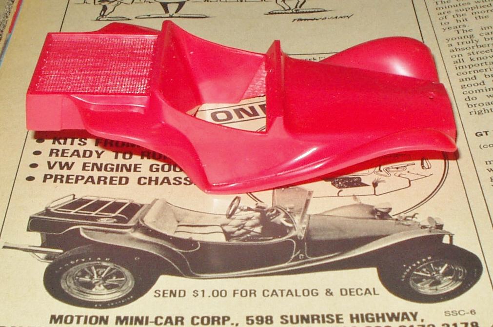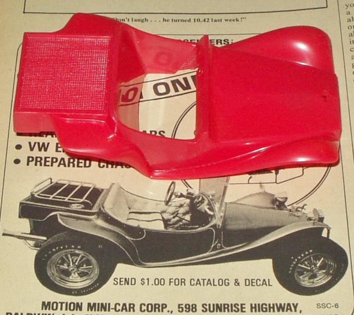 5. AMT's TeeVee dune buggy (rebodied Manx kit) never claimed to be a Berry Mini-T, but the influence and inspiration are unmistakable. I started one of these as a kid and never got it finished. I ended up resurrecting its chassis and engine a few years ago and finished it off as a bare-bones pure off-road dune buggy. (I tried to build the body into a front-engined V8-powered rod 50 years ago, but that's a story for another time.) As I never got mine done, I'd never seen one built until some of the reissues started showing up here and elsewhere. And a big problem with this kit became apparent: The steering wheel would be just about exactly where the driver keeps some of his favorite and most important internal organs. In other words, the cockpit is too short front-to-back. Even mounting the steering wheel so close to the dash that you could just barely grip it, you could still only barely get into the car, and would be driving it from a MOST unusual position. Ouch. Last week I was reading some ancient East Coast car rags and found a pic of the Mini-T that looked to be about 1/25 scale, so I laid the AMT body on it, and it's DARN close to scale. Comparing the AMT body to the photo and measuring, one problem become obvious: The dashboard is about 9 scale inches or so too far to the rear. AHA! There's another problem that isn't so obvious, too. The kit uses bucket seats. Notice that on the real Mini-T, the seat back is just an upholstered panel that sits right up against the cockpit's rear edge. The bucket seats waste several precious inches of “chest room” in that tight cockpit. So I'm gonna try to alter the TeeVee body to, first, give the driver some living space, and second, try to look a bit more like a real Mini-T. It looks like the whole hood area might be a bit short top to bottom. Hmmm, I'm gonna let the back burner of my brain stew on the problem for a couple days, and then maybe bring out the razor saws and sheet styrene.... As a Famous President likes to say, “We'll see what happens.” Thanks for looking, and comments and ideas welcome.