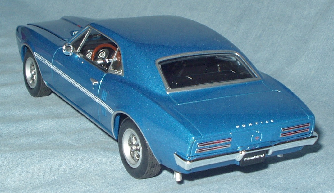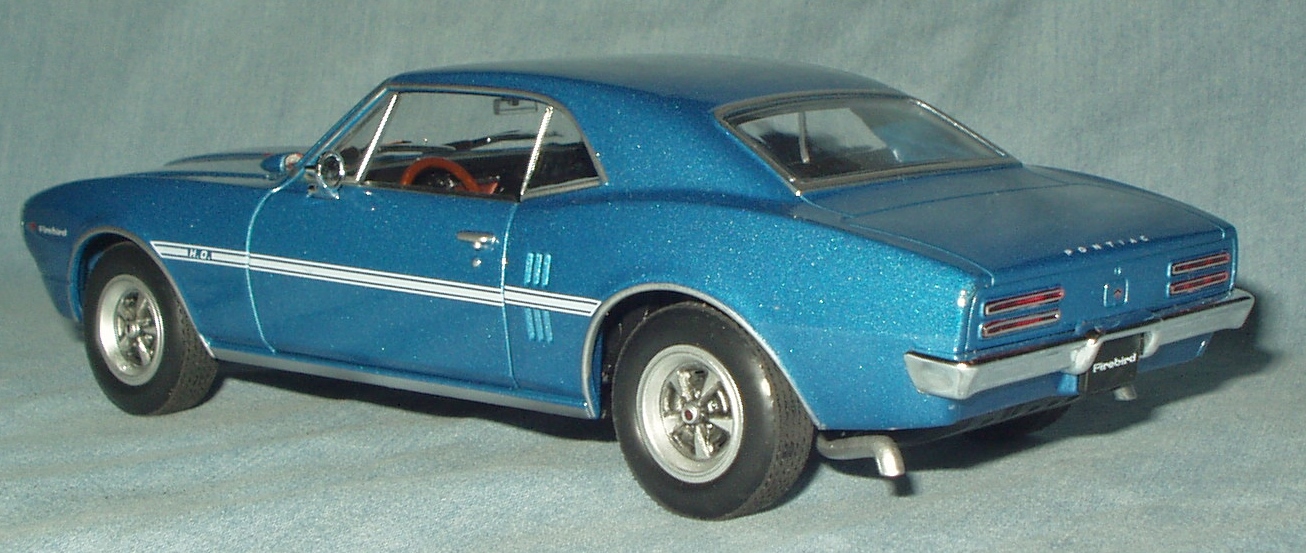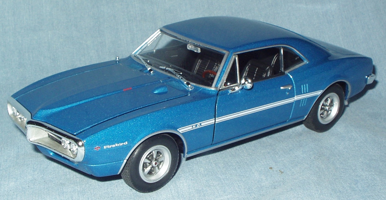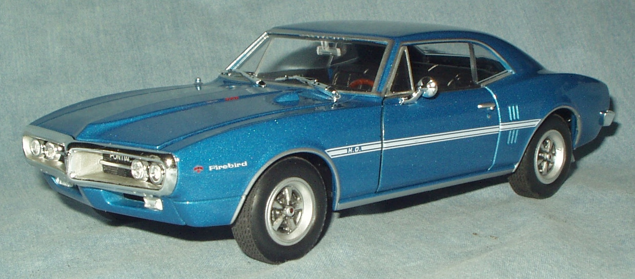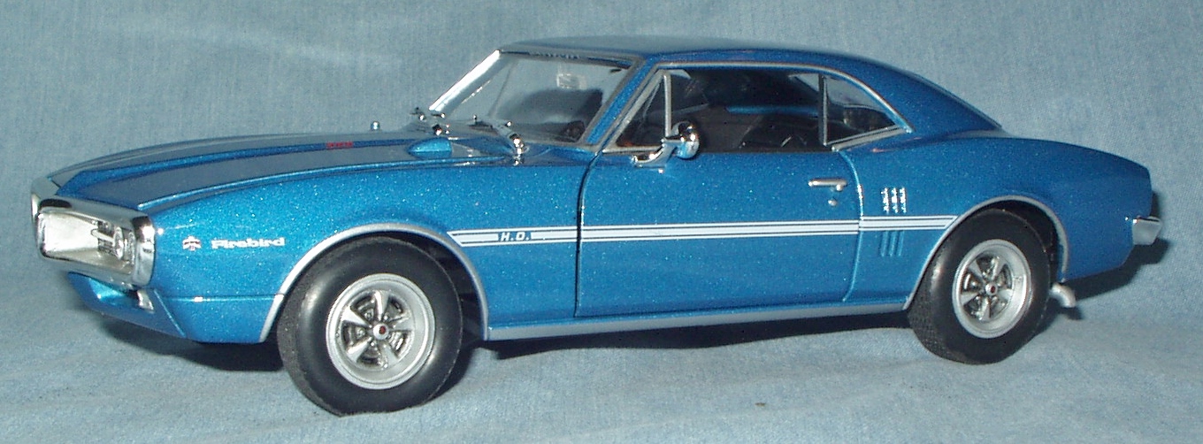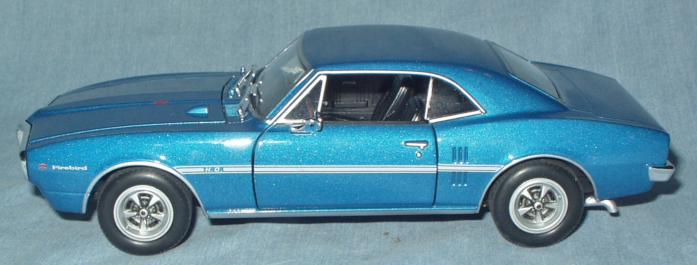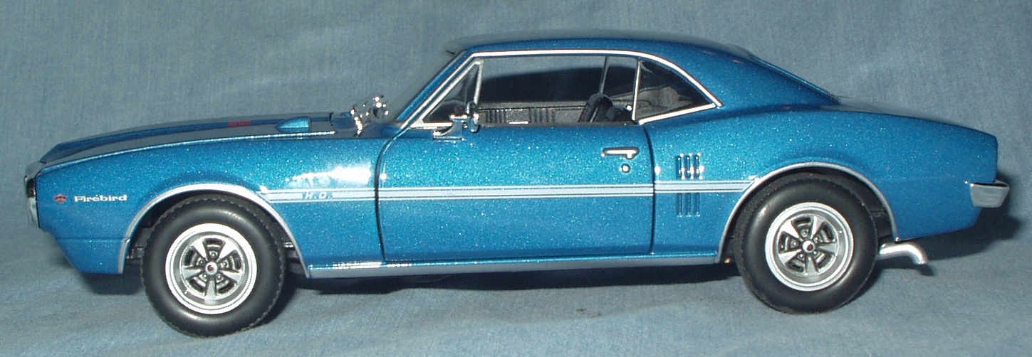 16. This is my 2nd Favorite Cheap Diecast. If it were in 1/25 instead of 1/24, it would be tied for 1st Favorite with Welly's '70 Challenger. It's a bit bigger than AMT and Revell 1/25 '67 Camaros, and the same size as the M2 '69 Camaro, so it's 1/24. Body shape is right on the money. The paint seems to be a good match for '67 Pontiac Gulf Turquoise, and is a little bit greener than it looks in these pics. Mine has a couple minor dust boogers in the roof but is otherwise smooth, shiny, and nice. The model pretty specifically represents a 326 HO--no scoops on the hood, but it does have the hood tach. The hood tach and dashboard instruments both have some sort of decal or stick-on faces--nice detail! The entire steering wheel is chromed, so while I had it apart, I took the opportunity to paint its rim Testor Brown to simulate a fake wood one. Others might want to detail the interior even further, and it would be worth it on this one. Unlike the Welly '68 4-4-2, the wheels don't disappoint. In fact, they're as nice as any scale Pontiac Rally IIs I've ever seen and better than most. They come with a matte silver finish. I detailed them with Tamiya Metallic Gray and they look great. I detailed the grille area with Testor Steel, and of course hit the back of the headlight stems and the backside of the taillights with flat white. The front turn signals got some acrylic Pearl White. This is a REALLY nice little model that has slid my Revell '68 Firebird kit WAAAAAAY down my "Kits to Get Built Soon" list. Here's the underhood insert, just since I had to remove it to get the grille out (to back-paint the headlights, a Snake-Fu Must-Do). Not a full engine, but it does look convincingly busy in there; biggest problem to my eye is that the engine paint is more like Olds Engine Blue than the distinctive light Pontiac Engine Blue. (I don't really care that much about engines in my diecasts.) Here is is teamed up with one of my M2 '69 Camaros, just since I had one handy. It compares quite nicely with the M2 IMHO, and most of the M2s are pretty nice stuff!