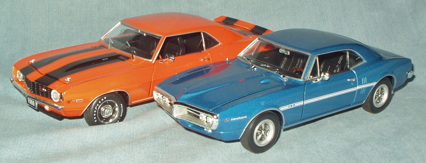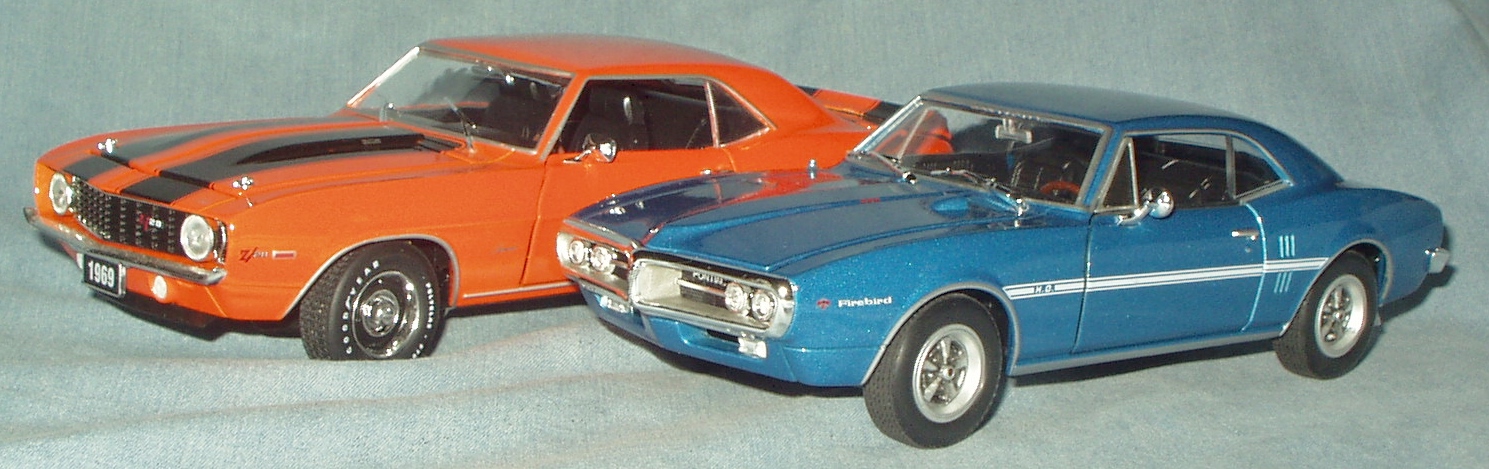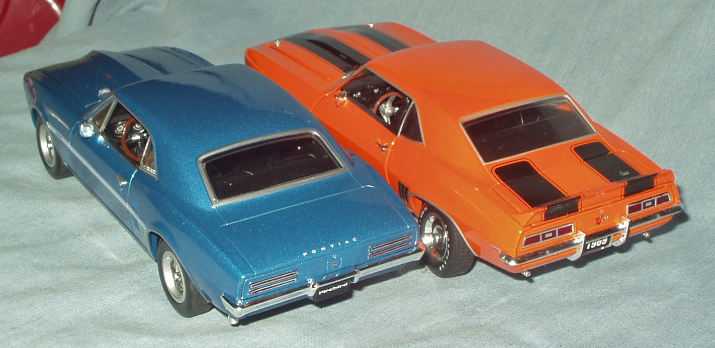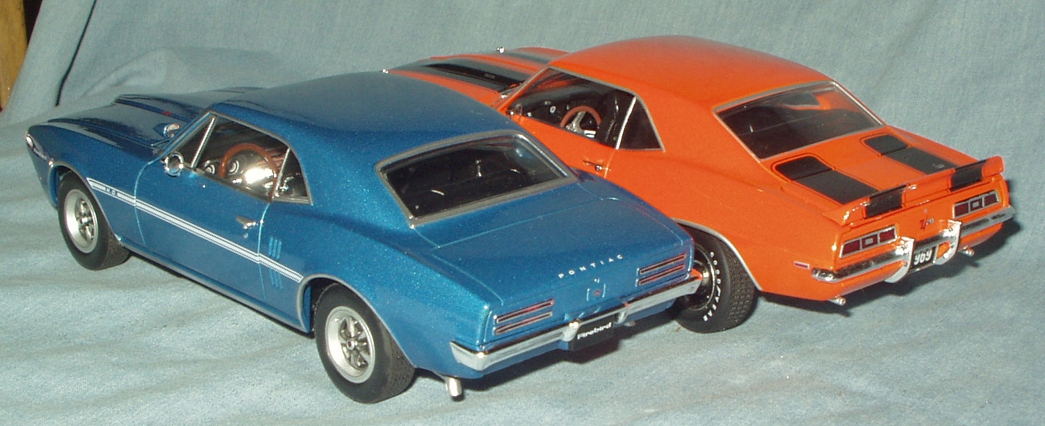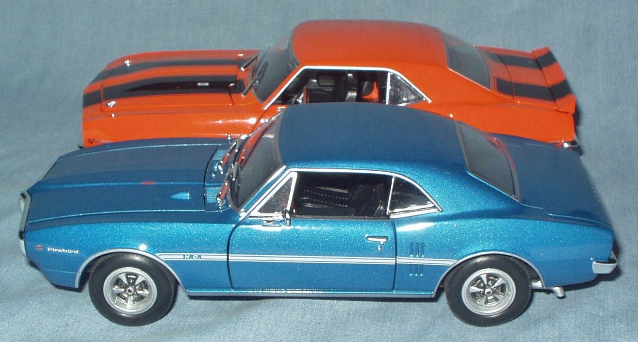 16. This is my 2nd Favorite Cheap Diecast. If it were in 1/25 instead of 1/24, it would be tied for 1st Favorite with Welly's '70 Challenger. It's a bit bigger than AMT and Revell 1/25 '67 Camaros, and the same size as the M2 '69 Camaro, so it's 1/24. Body shape is right on the money. The paint seems to be a good match for '67 Pontiac Gulf Turquoise, and is a little bit greener than it looks in these pics. Mine has a couple minor dust boogers in the roof but is otherwise smooth, shiny, and nice. The model pretty specifically represents a 326 HO--no scoops on the hood, but it does have the hood tach. The hood tach and dashboard instruments both have some sort of decal or stick-on faces--nice detail! The entire steering wheel is chromed, so while I had it apart, I took the opportunity to paint its rim Testor Brown to simulate a fake wood one. Others might want to detail the interior even further, and it would be worth it on this one. Unlike the Welly '68 4-4-2, the wheels don't disappoint. In fact, they're as nice as any scale Pontiac Rally IIs I've ever seen and better than most. They come with a matte silver finish. I detailed them with Tamiya Metallic Gray and they look great. I detailed the grille area with Testor Steel, and of course hit the back of the headlight stems and the backside of the taillights with flat white. The front turn signals got some acrylic Pearl White. This is a REALLY nice little model that has slid my Revell '68 Firebird kit WAAAAAAY down my "Kits to Get Built Soon" list. Here's the underhood insert, just since I had to remove it to get the grille out (to back-paint the headlights, a Snake-Fu Must-Do). Not a full engine, but it does look convincingly busy in there; biggest problem to my eye is that the engine paint is more like Olds Engine Blue than the distinctive light Pontiac Engine Blue. (I don't really care that much about engines in my diecasts.) Here is is teamed up with one of my M2 '69 Camaros, just since I had one handy. It compares quite nicely with the M2 IMHO, and most of the M2s are pretty nice stuff!