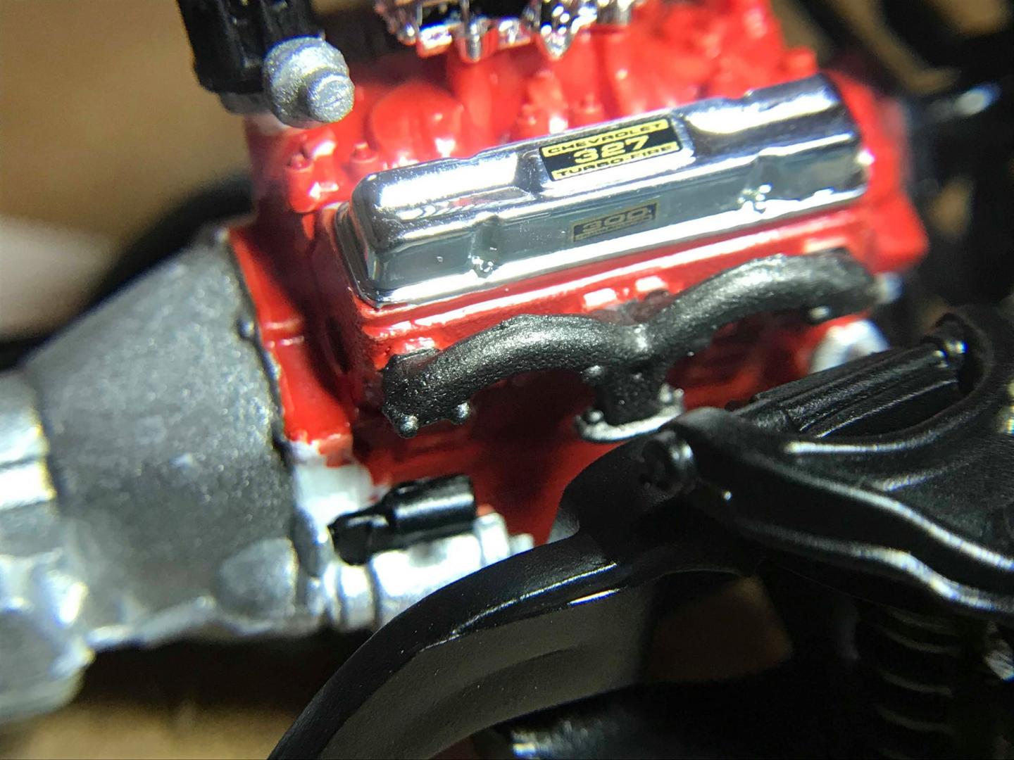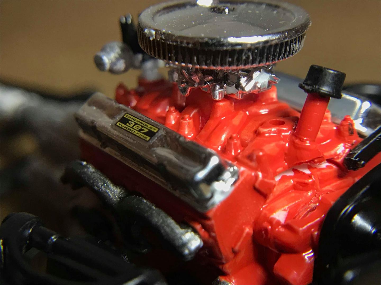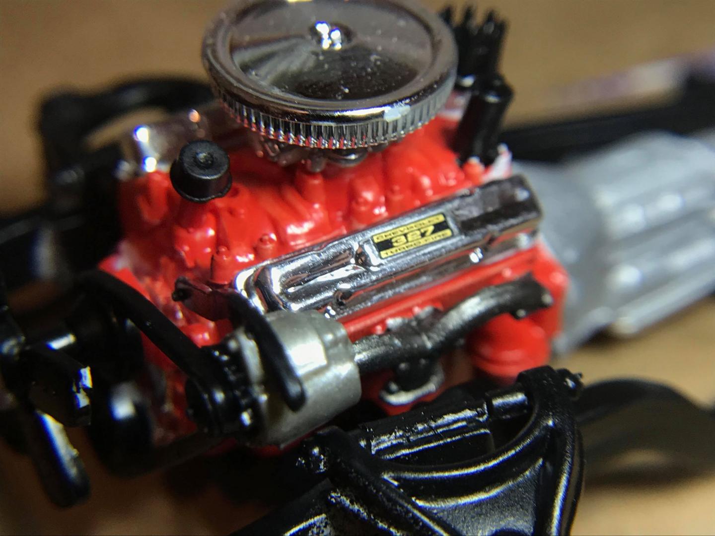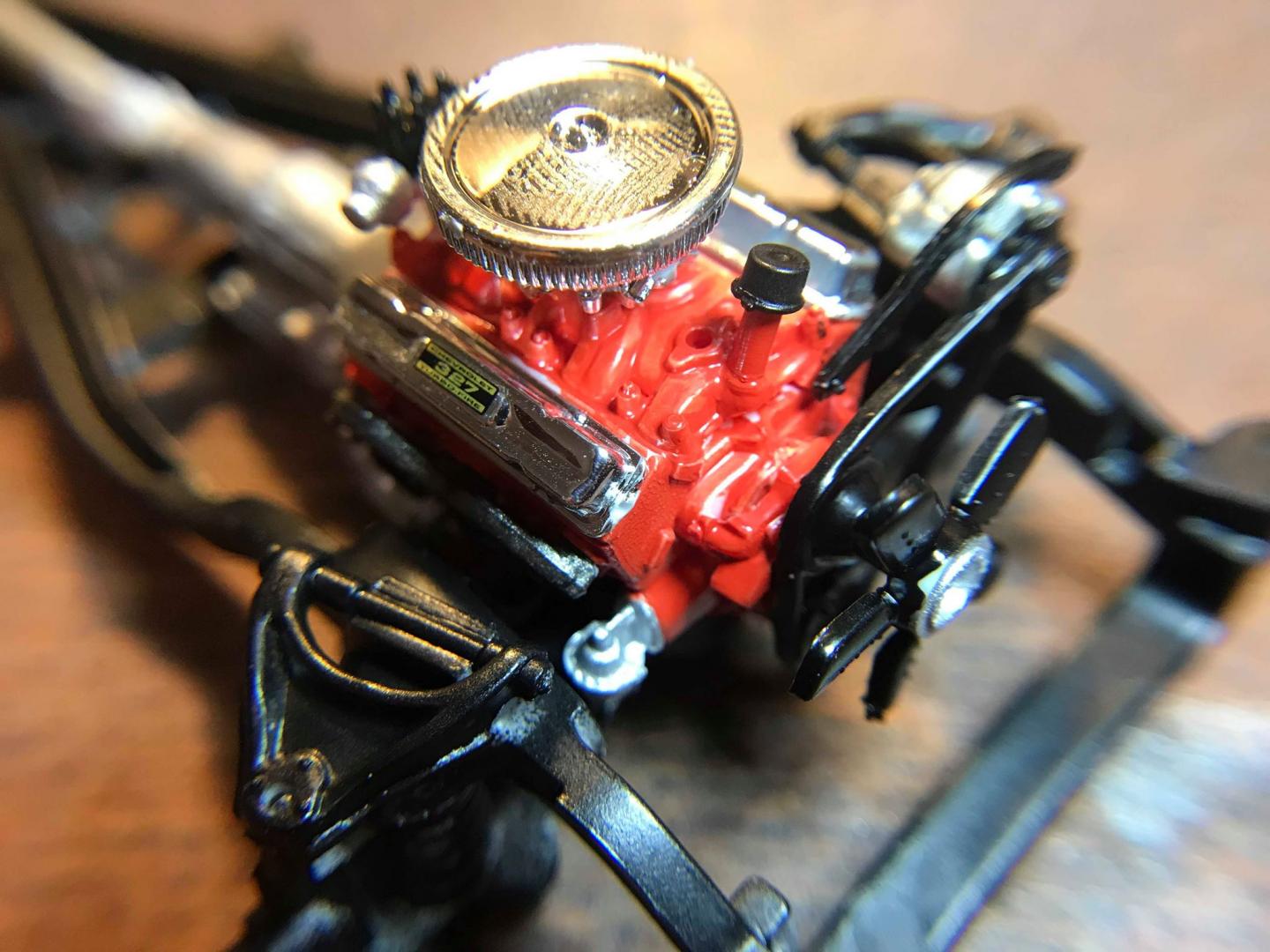 So, I semi-trashed my first Revell 1964 Impala SS (China made kit) build and rather would build it differently than what I had originally intended to. I stripped off the paint from it and will paint in another color, possible a Chevy aqua marine color. So that kit is shelved and stopped for now. So, I decided to buy another 64 Impala model kit, but this time is made in the USA. I much rather have the USA made Revell model kits. With that being said, the USA made version will be here to stay and the first one I bought will be built and sold on ebay. As of right now, I have completed the engine build and chassis assembly. I'm waiting to go buy Pegasus 1:25 custom rims for my 64 Impala so its sitting on ground lol. Details on the build: Engine is painted in full red Chevrolet red orange from intake to oil pan. I left valve covers chrome and added "327, 300HP" decals on them. I used the custom intake with the Holley Carburetor and the chrome air cleaner that was meant for the lowrider built, but I am going with stock with a few extras Transmission is painted in aluminum paint along with the starter, distributor vacuum advance unit, fuel pump and clutch hub on the cooling fan. I painted the oil filter dark blue mixed with some white to make it as close as possible to a real AC Delco oil filter. Without further ado, enjoy!! More post coming in the near future! PS, I know I missed some spots with my brush, but eff it, its gonna put under a car body permanently so no one is gonna judge it with a magnifying glasses lol and also its not going to a model building contest!