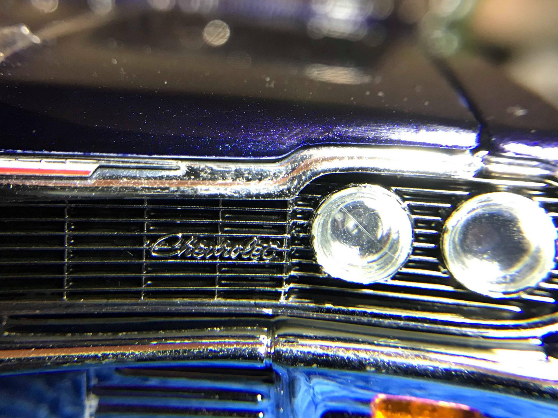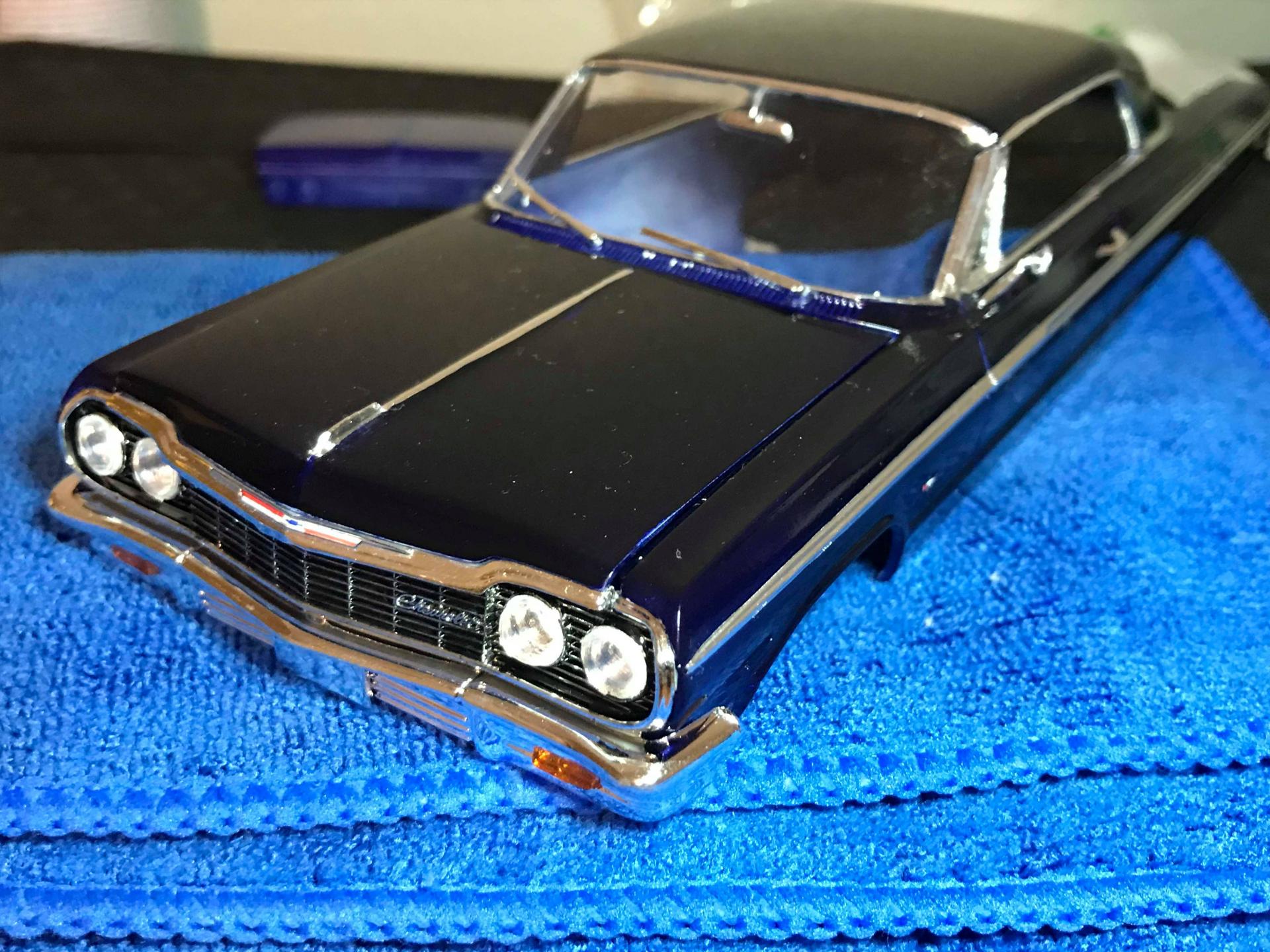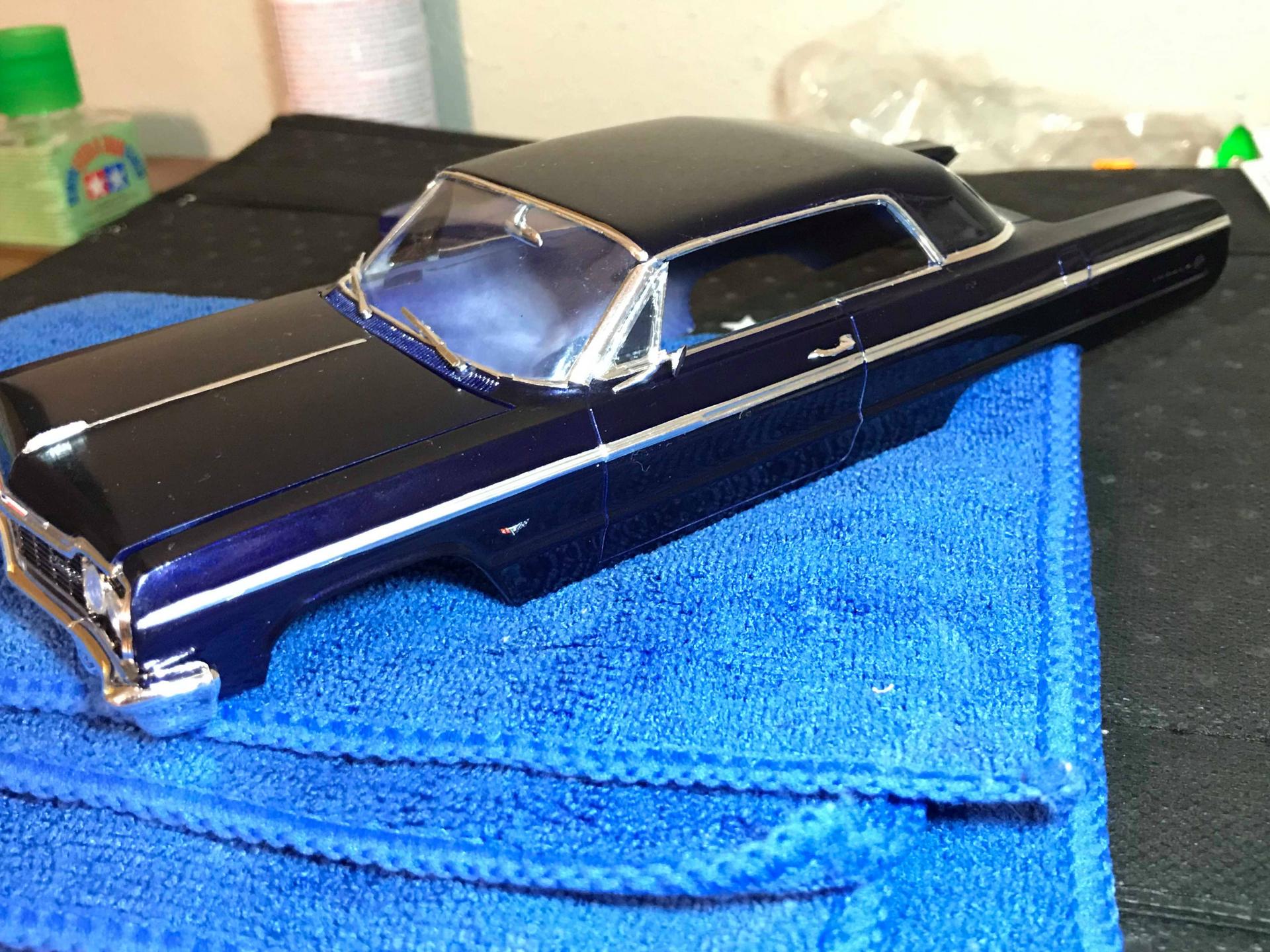 Hey y'all, I'm in the process of building my revell 1:25, 1964 Chevrolet Impala SS model. It's the 2n1 kit where I can either make it a lowrider or stock from the factory. As someone who isn't in the low rider culture, I went with stock. I painted the main body in Duplicolor, Perfect Match primer and then base coated with Tamiya TS-53, deep blue metallic paint. I did 2 thin mist coats on it and one wet coat. It has been over 24 hours since that final base coat has dried. I tried installing the "Impala SS" decals on the rear quarter panel, but it failed. Both decals are disposed of and I have the flag fender decals installed perfectly. However, I am considering using BMF for the Impala SS quarter panel marking. Ok, here is the question..Should I put the BMF on the model in it's current stage or after I have clear coated it?