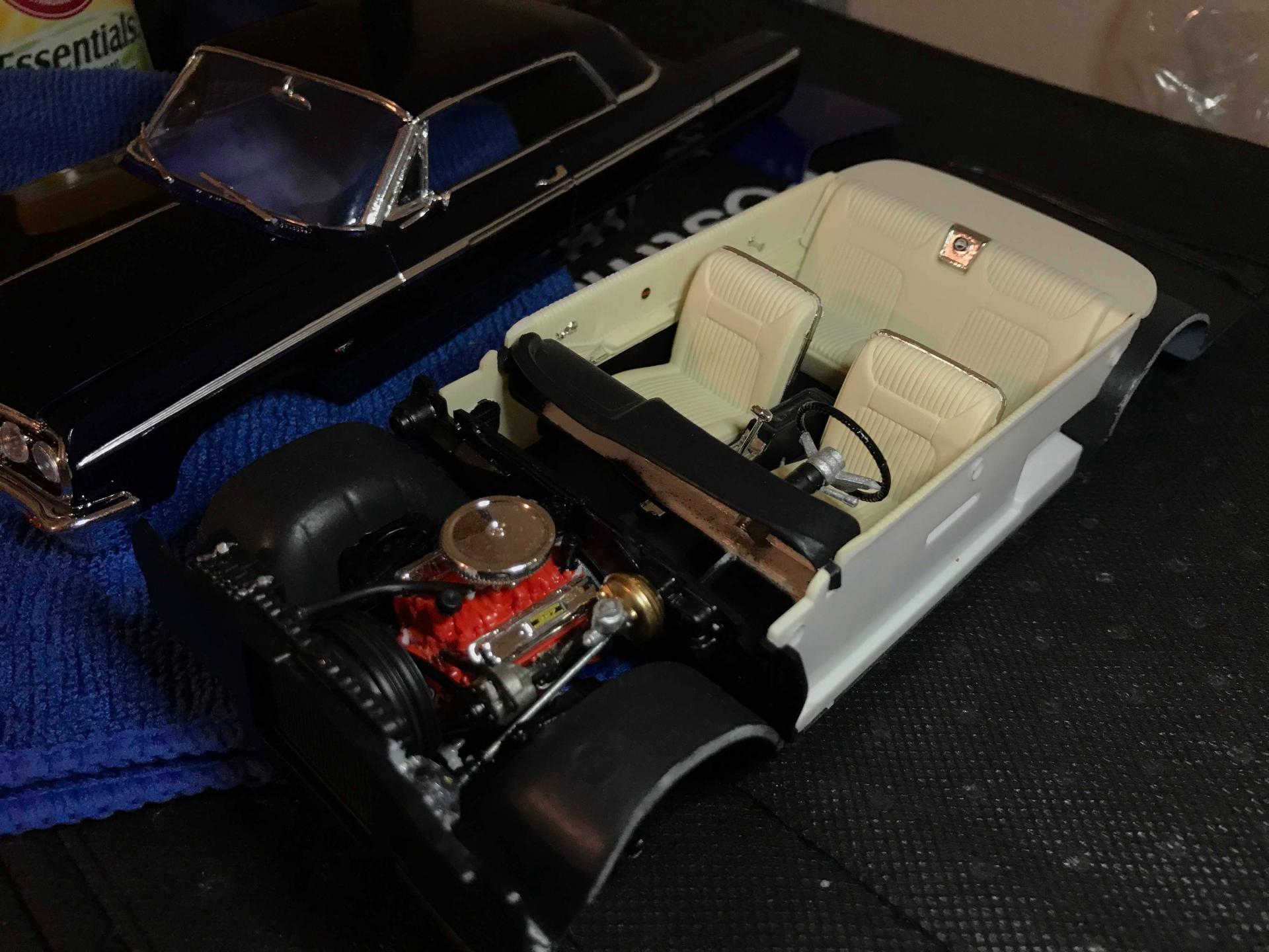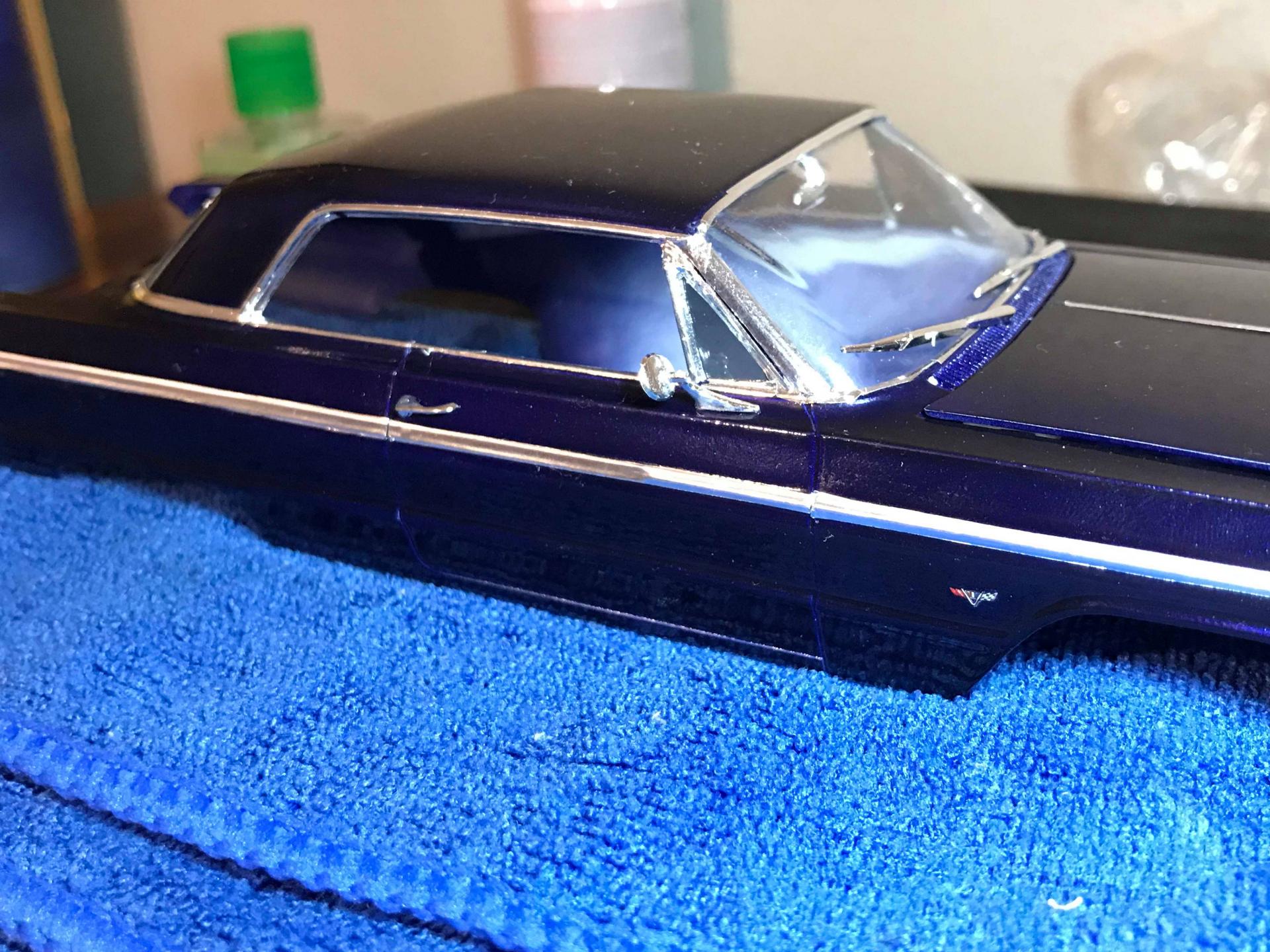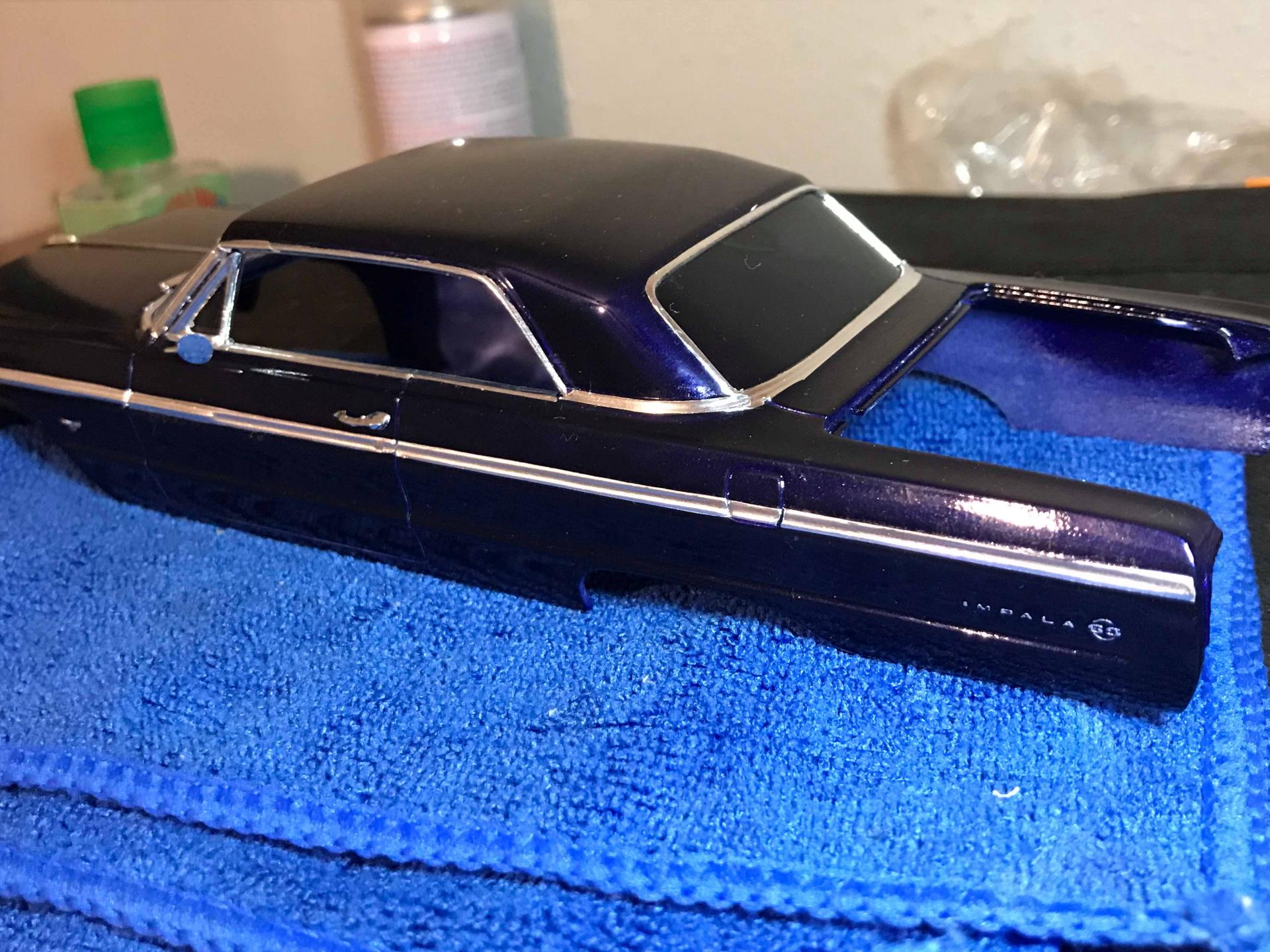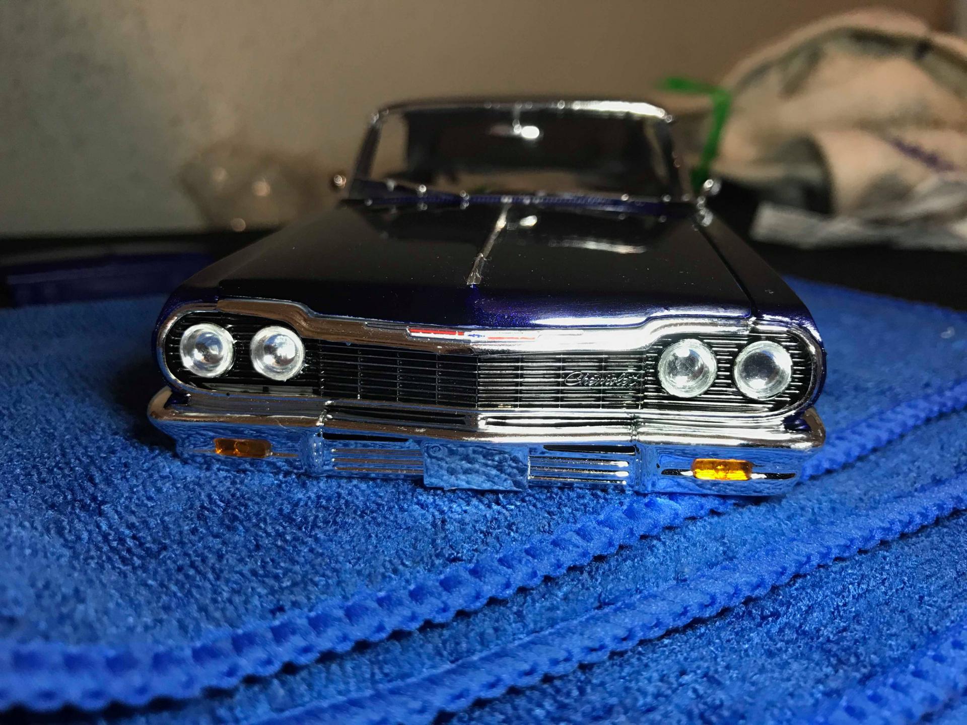 Current progress as of 3/31/2019 on my Revell (USA Made) 1964 Chevrolet Impala SS model kit. Body, hood and trunk trim is complete. Painted, clearcoated, polished and BMF'd. Currently awaiting good weather to finish painted the trunk and looking for some nice Pegasus 1/25 scale wheels to go along with my model car. I used an extra chrome mirror piece from the previously bought 64 Impala SS model kit that was made in China for the passenger side mirror.
