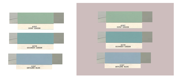 Trying to determine colors from color photos (and especially when viewed on a computer monitor) is really difficult and can fool your eyes. There are so many variables which can affect the color. Here is an example of what I mean: I took a screen capture of both of the model photos in the initial post and also of the color chips. I then created a blank (white image) and pasted the snippets of the color chips. Then I took a swatch of the model from both photos and placed it next to the color chips. The swatch of the model's color on the right side of each pain chip is from the top model photo while the left swatch is from the 2nd model photo. They are not even close to either of the 3 color chips I chose. The model color swatches look almost neutral gray. But the model in those photos does have a green hue. So I copied the swatches from the left side of the image (against white background) and copied them on the right side, against a rectangle which has a color of background from the model's photos. Against that warm-hue background now the model colors sufddenly show that green tint. And also neither of those color paint chips is very close to the mode's color.