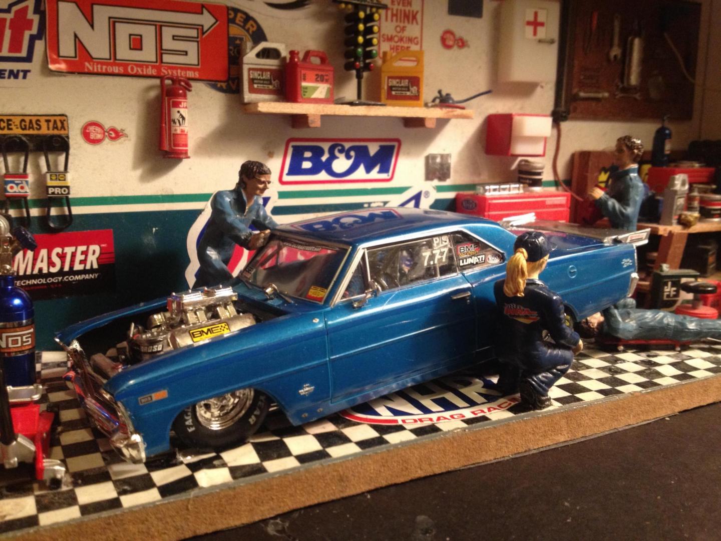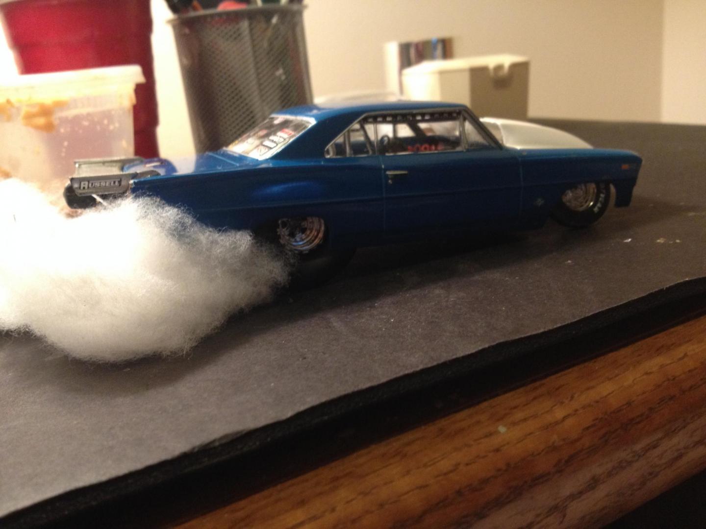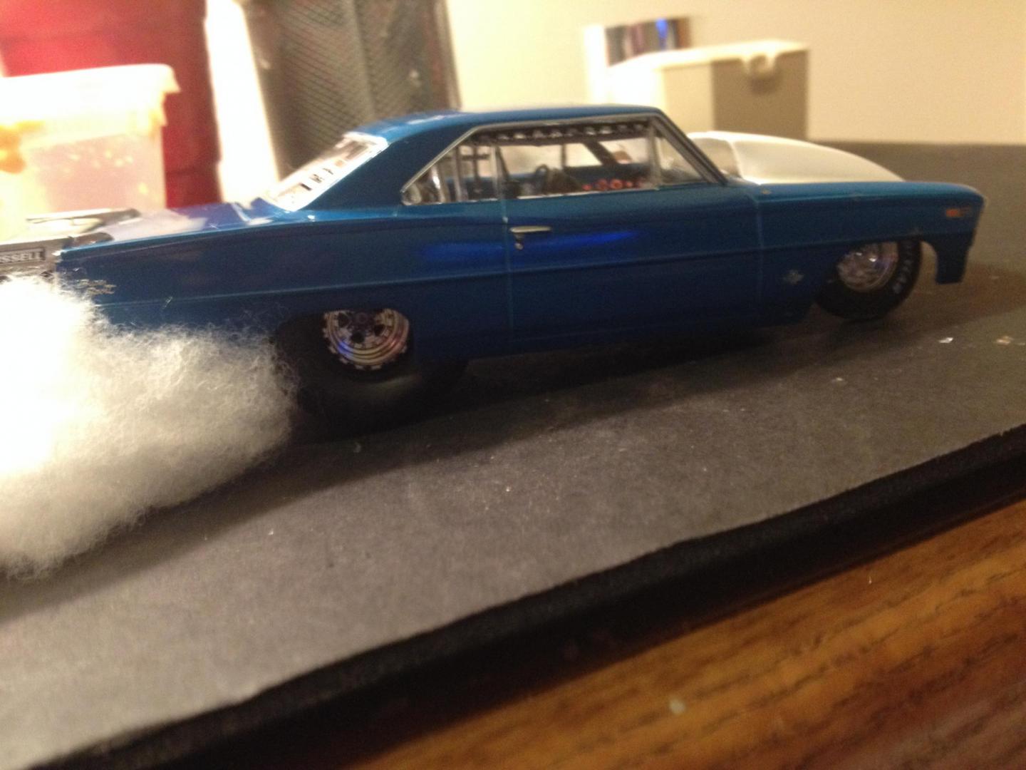 I had a 1/24th Diecast prostock car just gathering dust.So I decided to take it apart.The engine,and the entire chassis,and roll cage,are very cool,and nicely detailed.Well I tried to make the Diecast pro stock chassis fit into a plastic body.And I found that a 69 Novs fits over it,pretty well.The only thing I did,was to put much bigger rear slicks.The only problem I found,was the fuel cell sticks out too far,past the Nova's front gril.But that can just be cut off.If I decide to build this car,I'm going to re paint it.