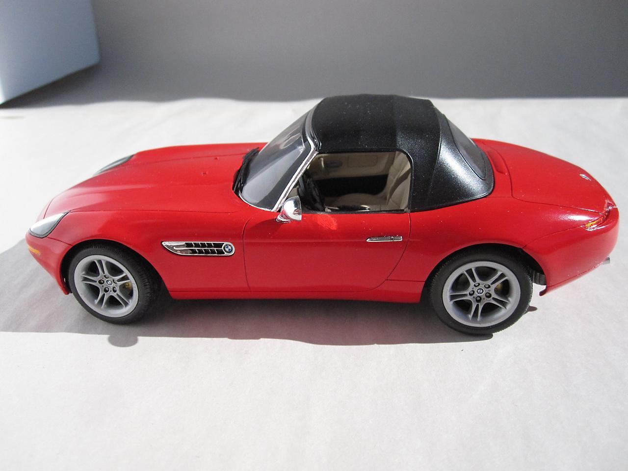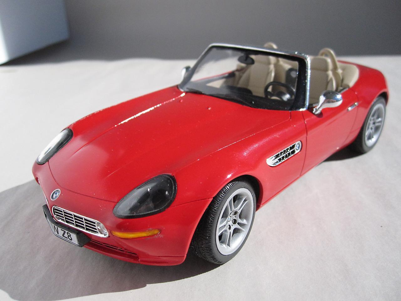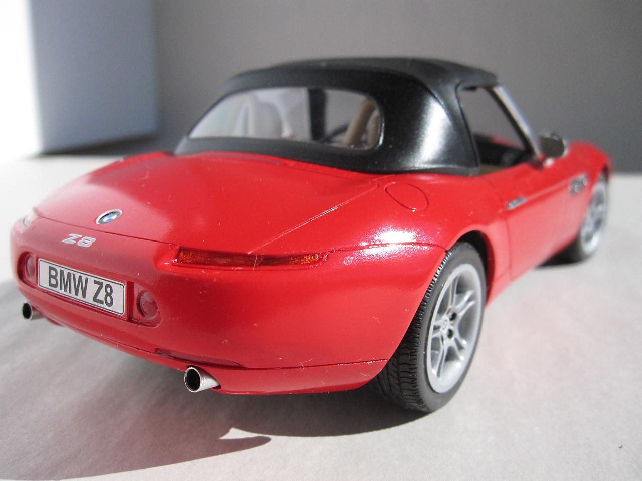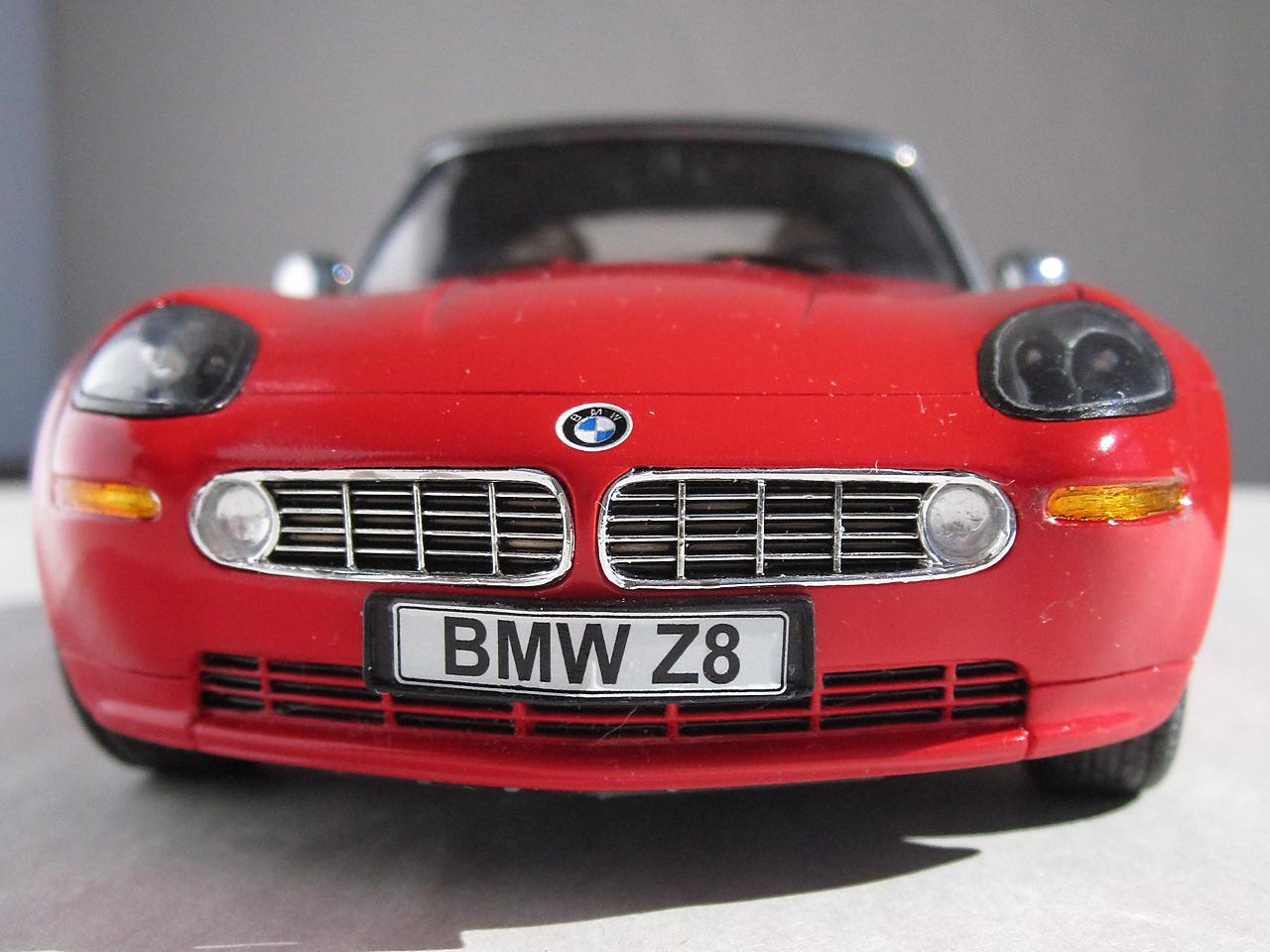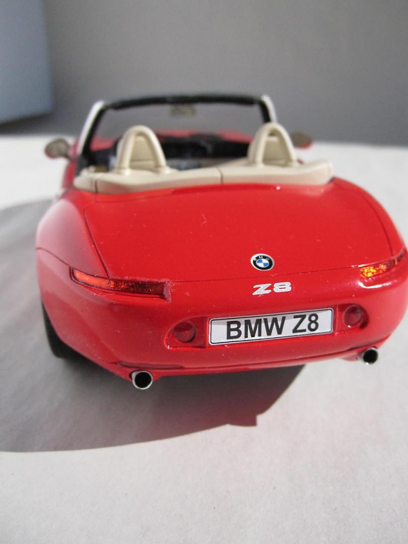 This is the Revell Germany BMW Z8 kit The BMW styling has always attracted me and this car is one of my favourites. While I am more than pleased that Revell has made this kit available I think it's execution falls a little bit short of the mark. I know to not expect Tamiya quality when it comes to the Revell kits but the detail (particularly in the interior) is poorly defined and the fit of some of the parts (the headlight covers in particular) is pretty sad. However, considering the reasonable price for this kit, I do feel a person is getting good value for their money - just be prepared to put in extra time and effort to get an acceptable result. Construction followed the instruction sheet with the following departures. The disc brakes and rotors were modified so that they were not as recessed giving them a more realistic appearance. The interior, dash and seats were scribed with a sewing needle in a pin vise. This sharpened up the detail which helped in both the model's appearance and in detail painting at a later stage. A lot of time was spent getting the headlight covers to fit properly. I had to adjust both the body opening and the clear portion to get a decent fit. The body panels also needed to be sanded to get smooth surfaces. Admittedly not a lot of work but still something I don't usually have to do. Even though I have some complaints about this kit, I will definitely have some more Revell auto kits in my future.