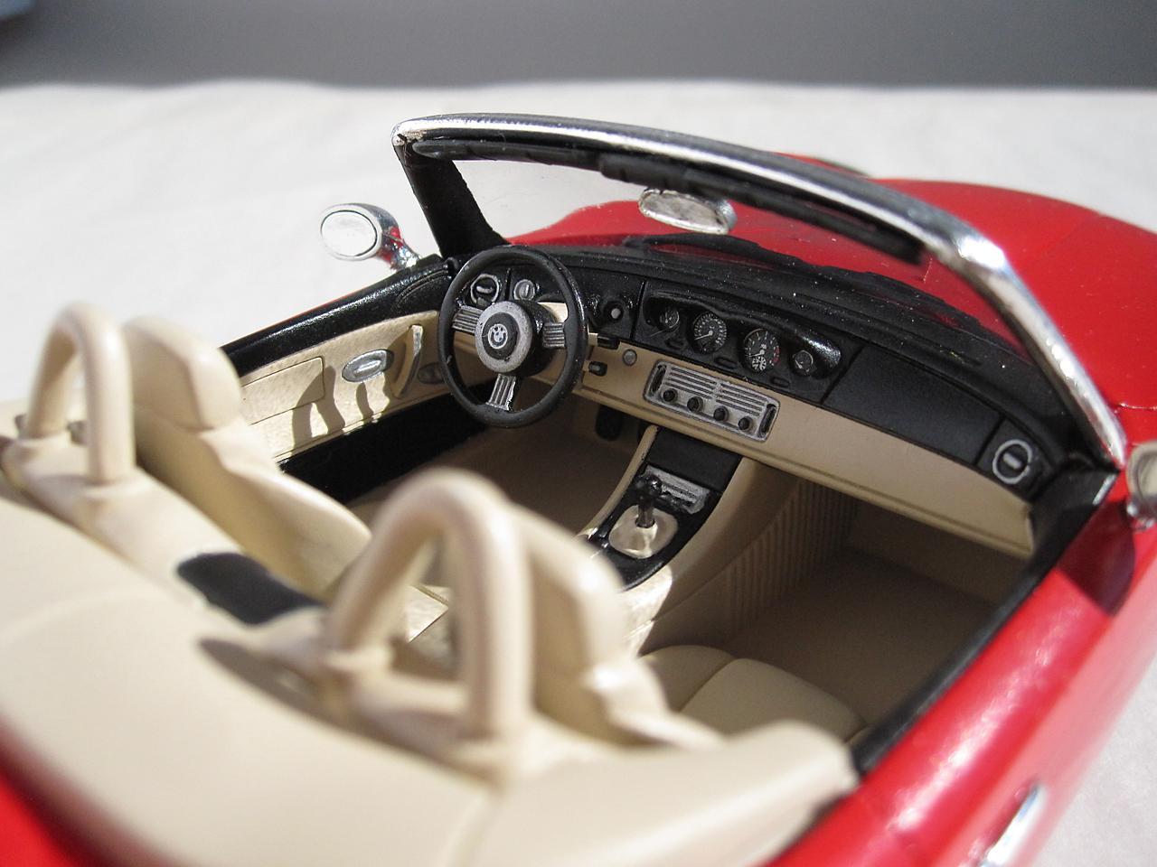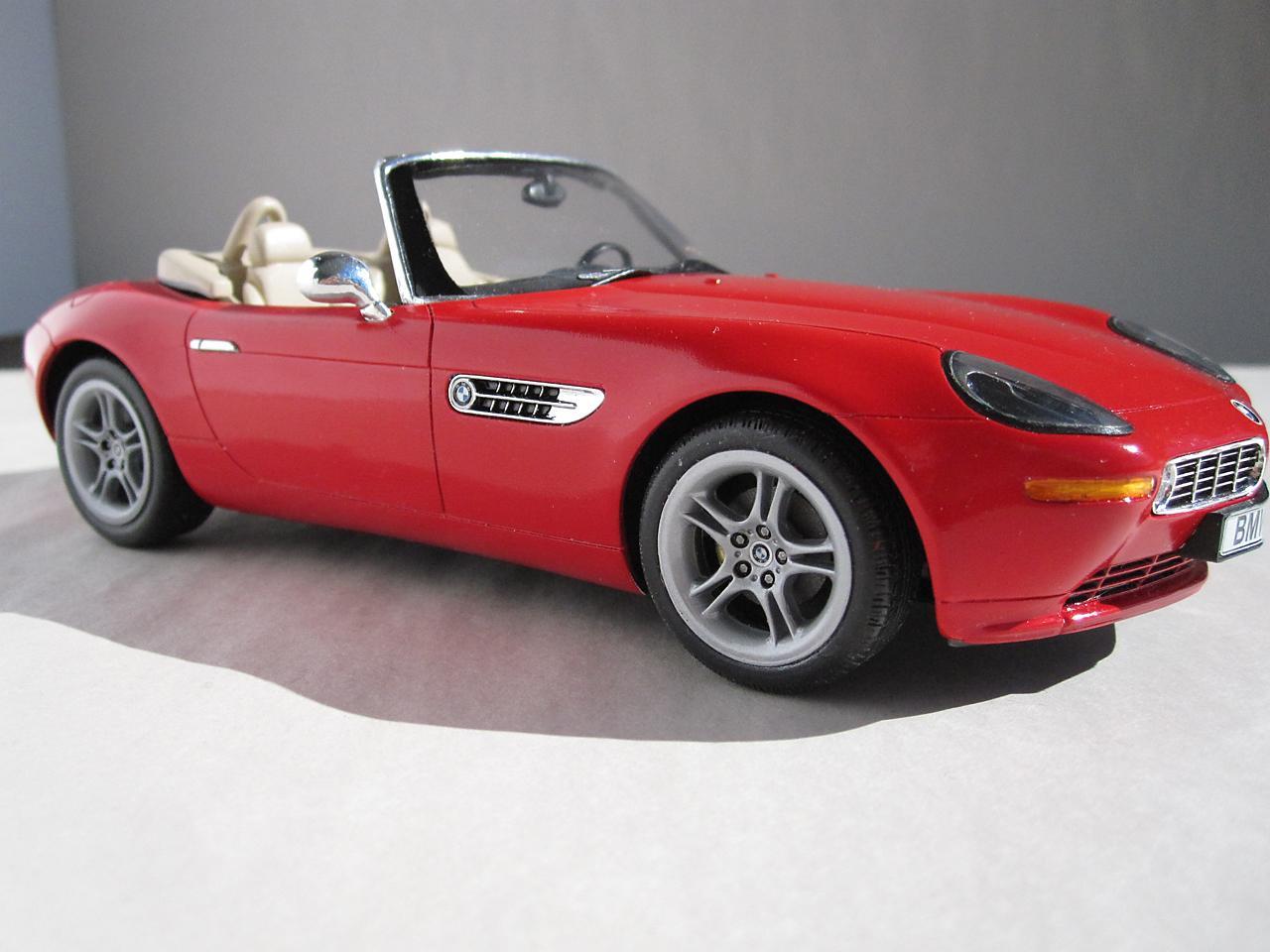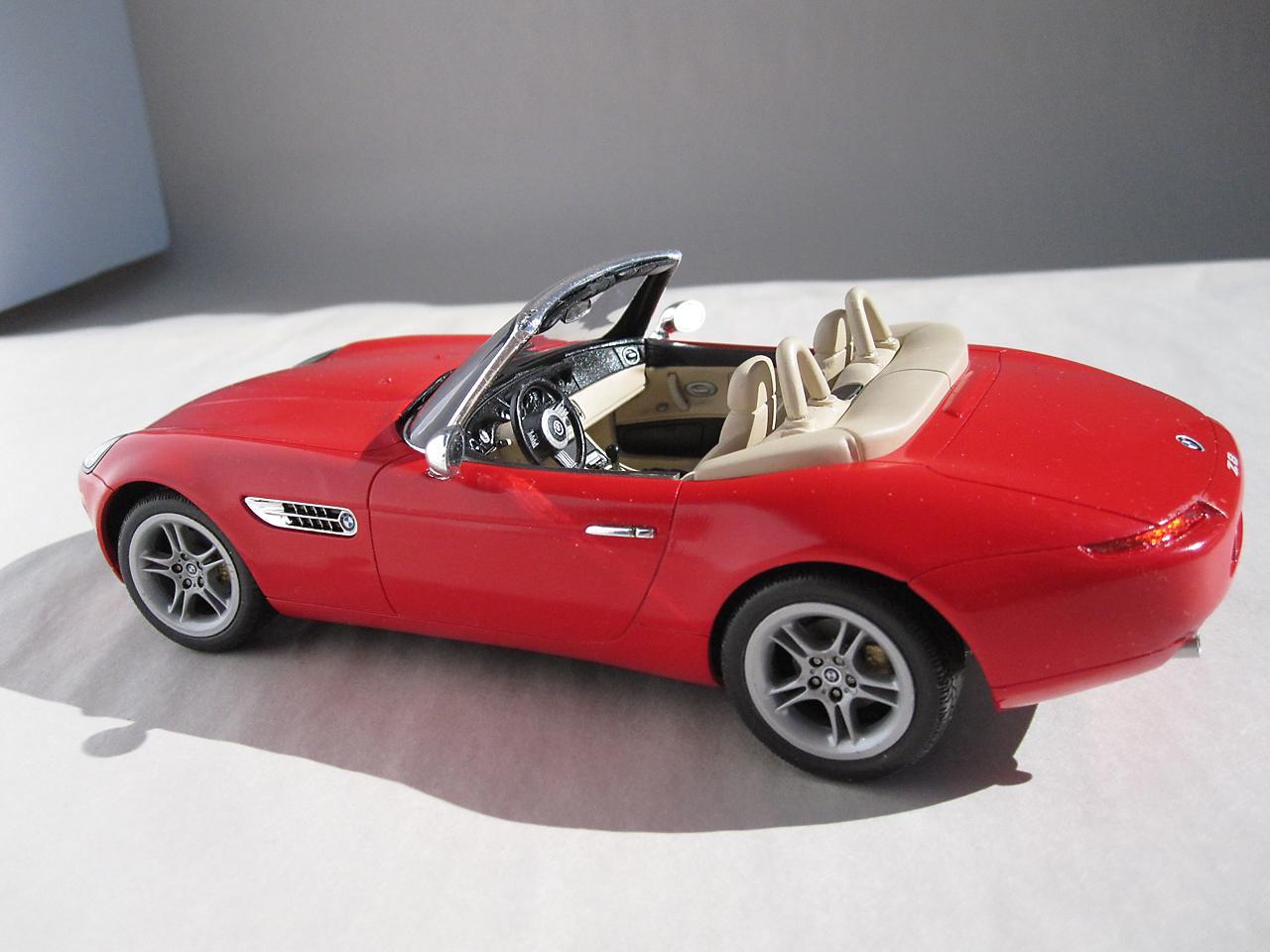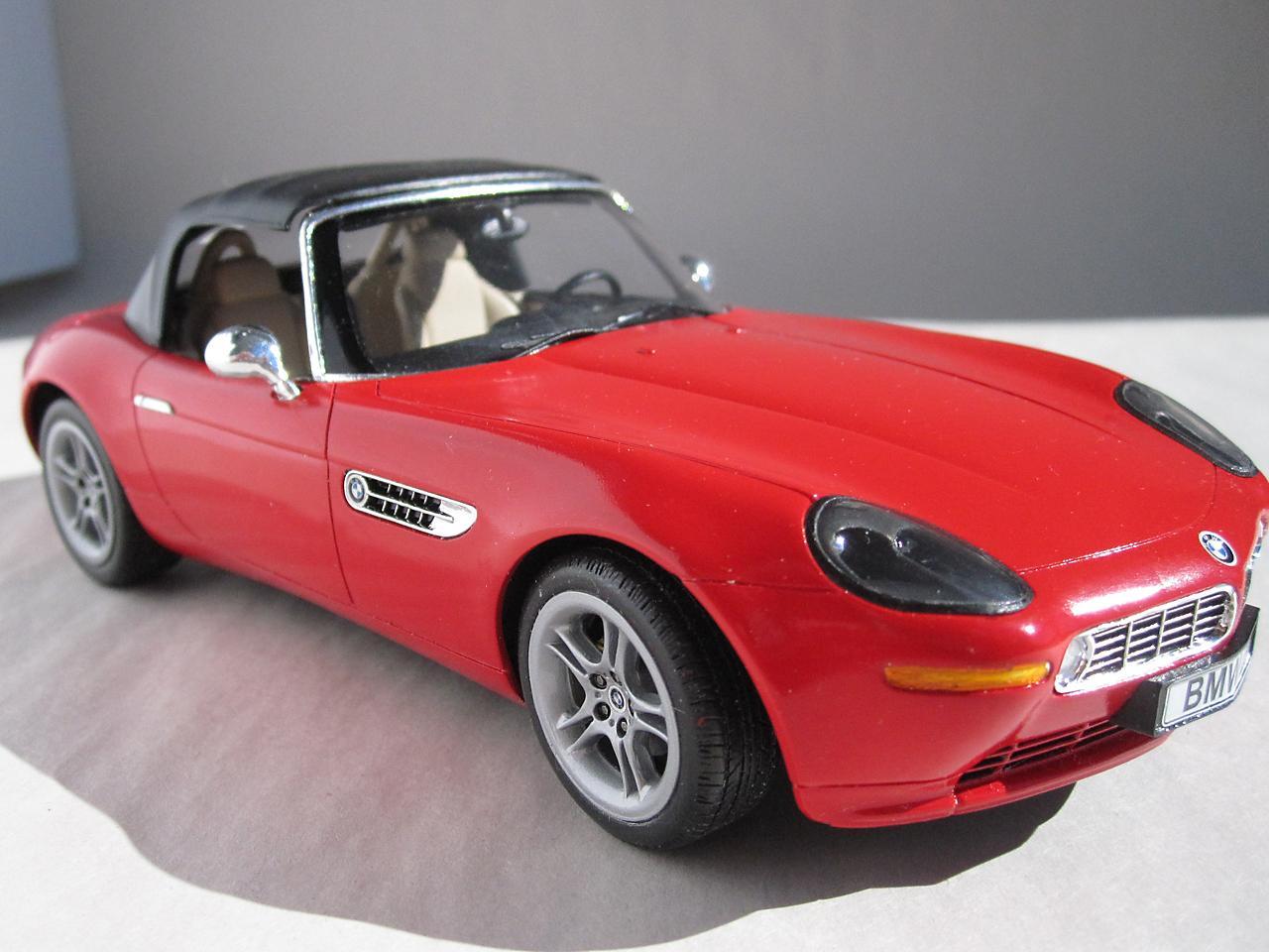 This is the Revell Germany BMW Z8 kit The BMW styling has always attracted me and this car is one of my favourites. While I am more than pleased that Revell has made this kit available I think it's execution falls a little bit short of the mark. I know to not expect Tamiya quality when it comes to the Revell kits but the detail (particularly in the interior) is poorly defined and the fit of some of the parts (the headlight covers in particular) is pretty sad. However, considering the reasonable price for this kit, I do feel a person is getting good value for their money - just be prepared to put in extra time and effort to get an acceptable result. Construction followed the instruction sheet with the following departures. The disc brakes and rotors were modified so that they were not as recessed giving them a more realistic appearance. The interior, dash and seats were scribed with a sewing needle in a pin vise. This sharpened up the detail which helped in both the model's appearance and in detail painting at a later stage. A lot of time was spent getting the headlight covers to fit properly. I had to adjust both the body opening and the clear portion to get a decent fit. The body panels also needed to be sanded to get smooth surfaces. Admittedly not a lot of work but still something I don't usually have to do. Even though I have some complaints about this kit, I will definitely have some more Revell auto kits in my future.