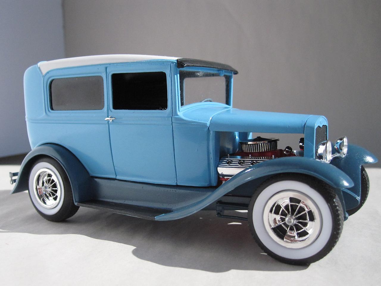 The base kit for this model is the Monogram/Revell '31 Ford Model A. I wanted to build it as a more modern hot rod. Shouldn't be too hard I thought - just use some of the parts from the Revell 32 Ford kit and we're done - right? Shouldn't be too hard - that statement probably originated about the same time as "what could possibly go wrong?" Anyway, suffice to say that my limited hot rod building skills were taxed to the limit and fell short in a few places. Probably as in real life, by instituting a change in one place it necessitated a number of (unforeseen at the time) changes further down the line. But (they tell me) part of the fun of modeling is facing and defeating these challenges. For the most part I am pleased with how the model turned out but the constant curves thrown at me by the concept I had in mind took some of the fun out of the building of it. So, in the end, it was "let's just get the thing finished and move on to something else." The frame, engine, transmission, headlamps and rear bumper came from the 32 Ford kit with the rest originating with the 31 Ford. The door hinges were removed and the folding hood assembled into one unit to give the model a cleaner look. Looking at the model now I probably should have continued the body moulding onto the hood. Spark plug wires would be nice too but like I said - I just wanted done with it. Maybe next time I'll try converting one of the AMT kits... or maybe not!