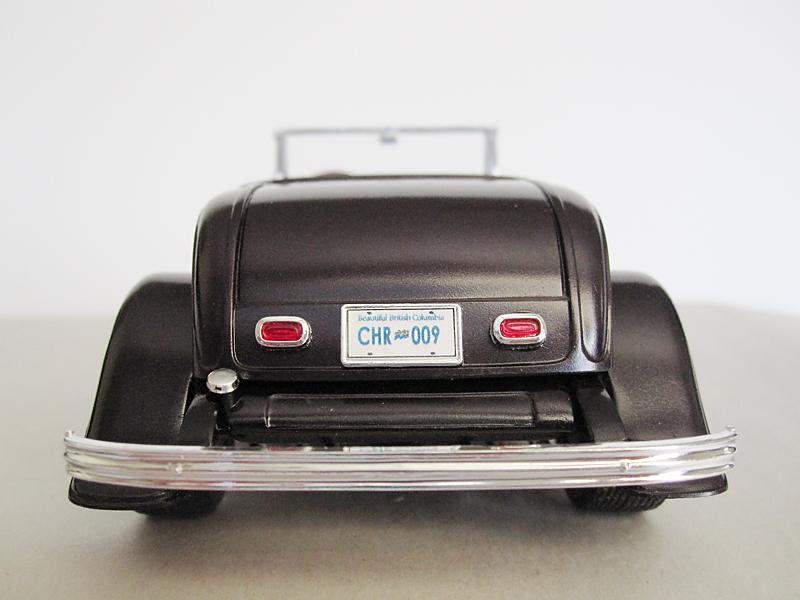 This model is my attempt to save an incomplete started kit I had purchased from a vendor on Ebay. I started by filling in the spare tire wells on the front fenders and moving the spare to the rear. The spotlights from the front windscreen were re-purposed as brake lights. The molding on the edges of the fenders was removed as was the ribbing on the forward portions of the rear fenders. The model is curbside because the previous owner had botched the engine assembly with over-generous applications of tube cement. The finished model is sort of a poorer cousin to the box stock model but I think I almost prefer the understated look of it to the kit's "flaunt it if you got it" version.