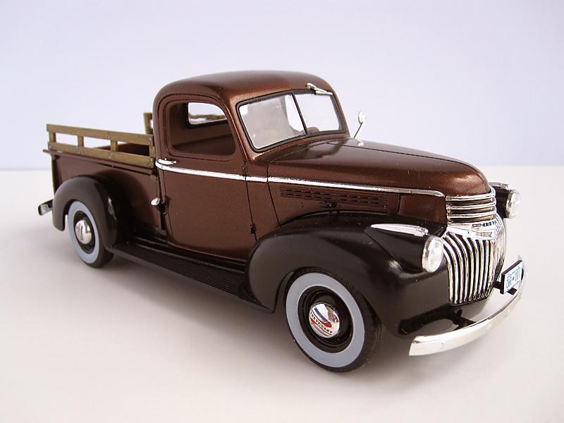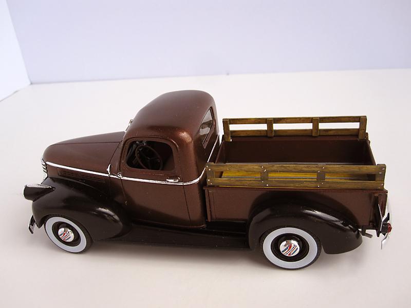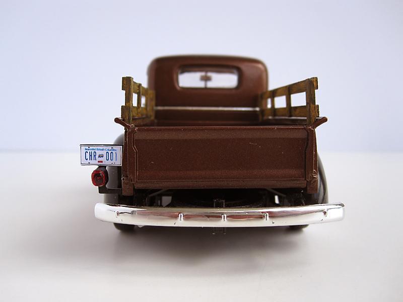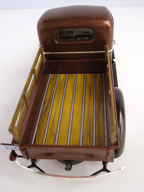 I'm not a truck kinda guy but the look of this pickup really appealed to me - perhaps it's the art deco influence on its styling. I don't have the painting skills to duplicate a worn, torn and abused example of this truck so I went the slightly easier route of creating a restored stock version. The kit was a pleasure to build but I did run into a couple of areas that required some extra thought and attention. The attachment of the spare tire was flimsy at best and I had to modify some parts to get a more secure fit. The locations where the rear fenders attach to the truck bed do not have any positive locating/attachment points so some careful trial fitting was required. Once I had determined where the fenders would mate to the box I glued some small pieces of plastic on the box to correctly locate the fenders during final assembly. The floor of the bed is the supplied kit decal which required numerous applications of Solvaset to get it to conform properly. I lucked out in getting a (close enough for me) paint match on the stakes on the side. The whitewalls were surplus decals from the Revell 32 Ford kit. Again, Solvaset was required to get the decals to conform to the tire contours. This kit was a pleasant diversion from what I usually build but I may stray from the norm yet again - I just found out that there is a kit of the 1937 ford pickup!