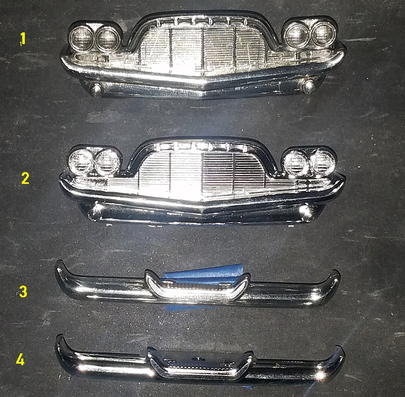 Ah, you almost got it, Steve. 2 & 4 are the originals. Since just about all of my stuff is packed in preparation for the move next week, I had the dechromed front grille (No.1) and rear bumper )No.3) from my '60 Desoto salvage project in a container and an almost used up sheet of BMF still waiting to get tossed into a box. So, I wanted to see how well BMF would work on some compound curves and multi-recessed details. I guess it works pretty well, huh? -