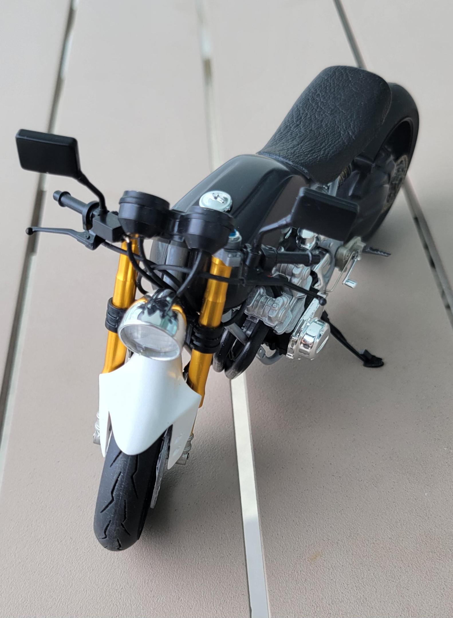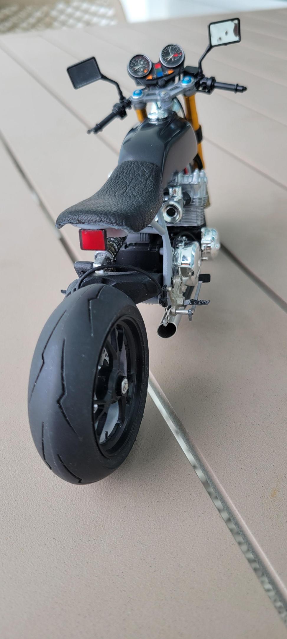 Hi, all; I built this model using the Tamiya Honda CB750F Custom Tuned kit. The front and rear suspensions, wheels and tires are from the Tamiya Ducati Panigale kit. The bike is painted with three different primers: Tamiya white and light gray and Duplicolor black. The Honda fuel tank has been shortened, narrowed and sectioned and has an Imex Harley fuel cap. The seat is a modified parts box unit covered in lambskin leather from an old jacket. The headlight is from a Revell Harley chopper and the taillight is a detector filter from a barcode laser scanner. Thanks for looking and comments welcome