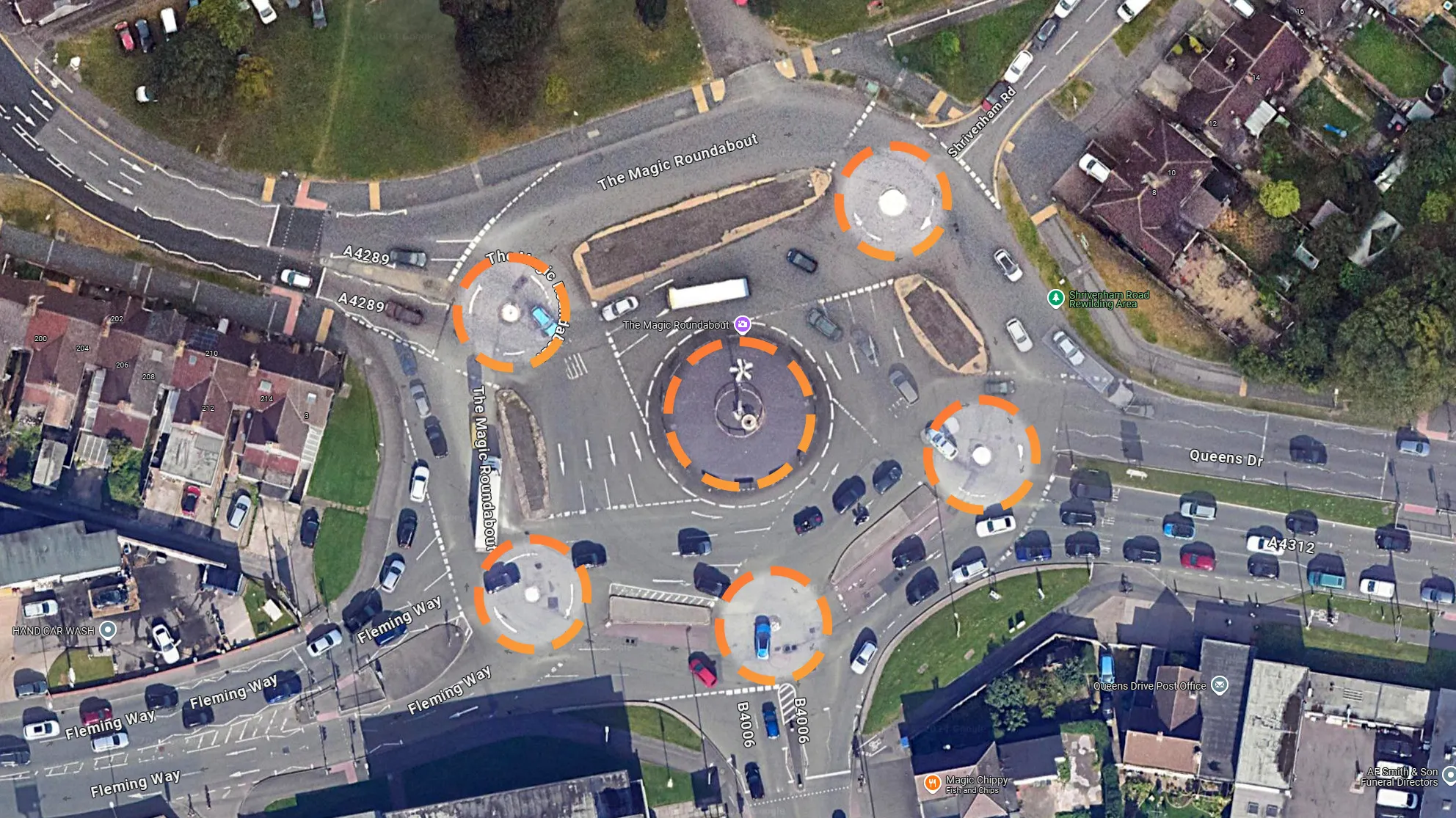 well the first problem is they are all driving on the wrong side of the road, but the markings on the road dont help. the centre makings should follow the roundabout which makes it easier for drivers. -